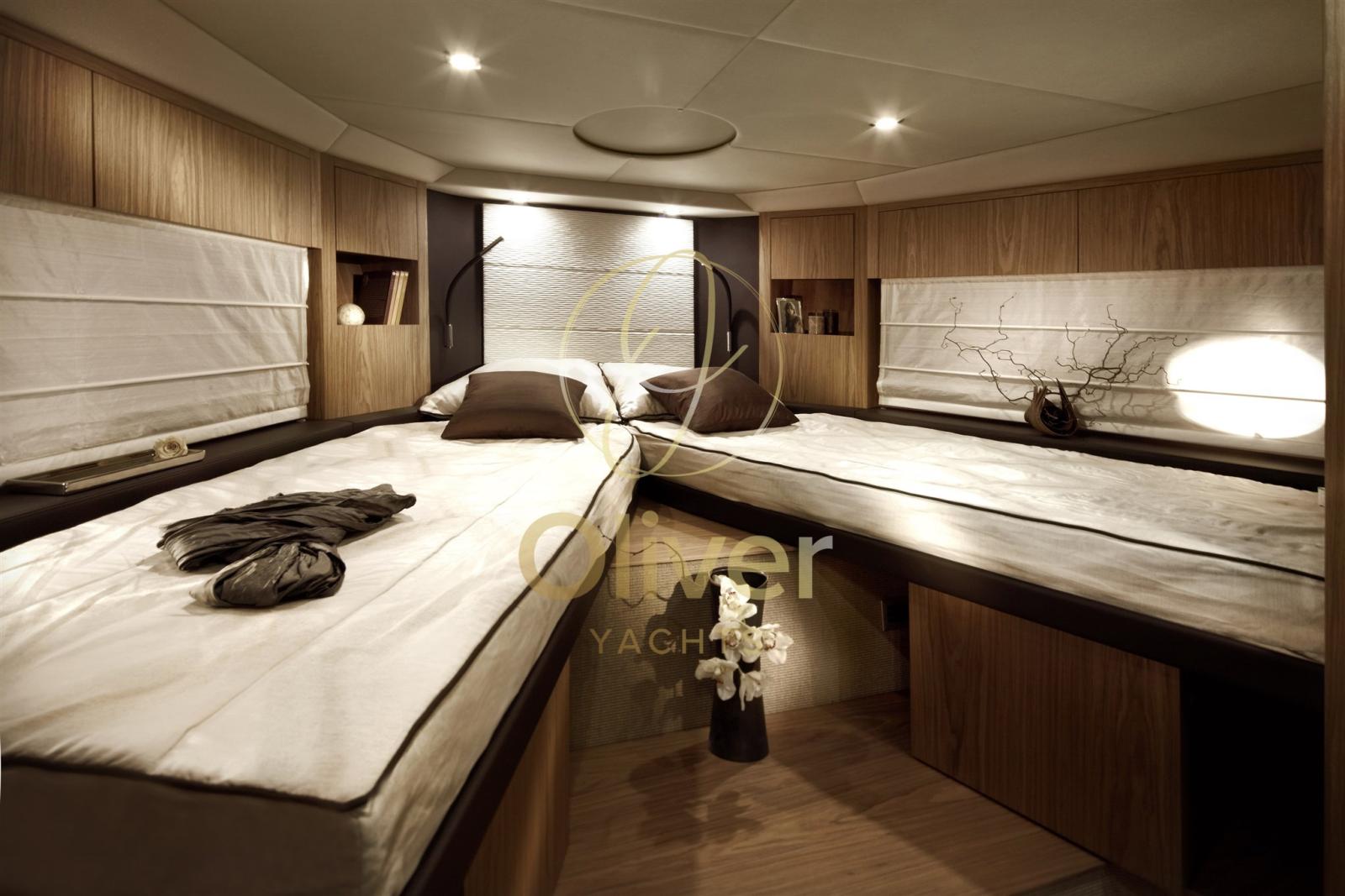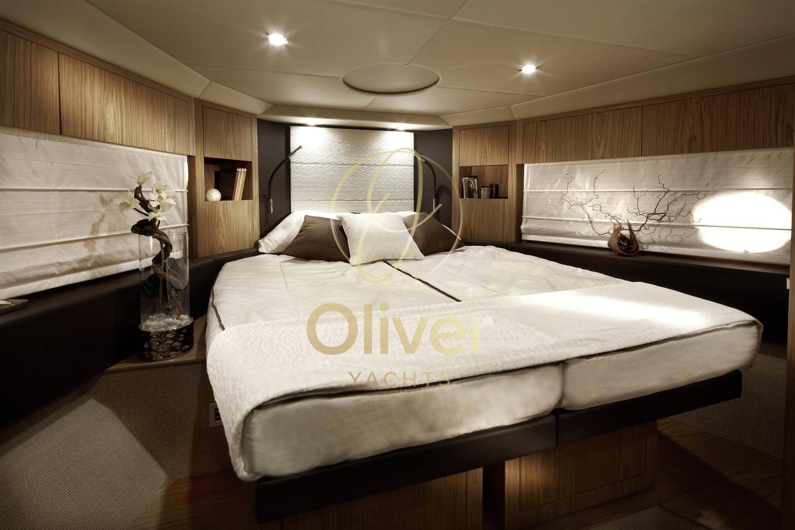 Dans le cas du F48 : 3 cabines, 2 salles de bain, choix entre cuisine milieu de navire ou cuisine cockpit, flybridge avec coin salon/bar, grandes fenêtres/passages qui intègrent intérieur et extérieur.