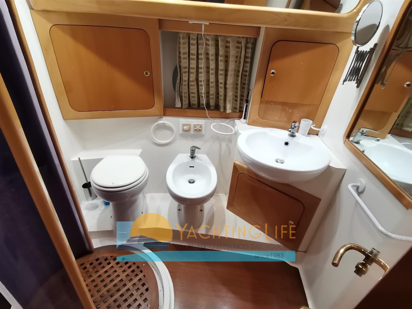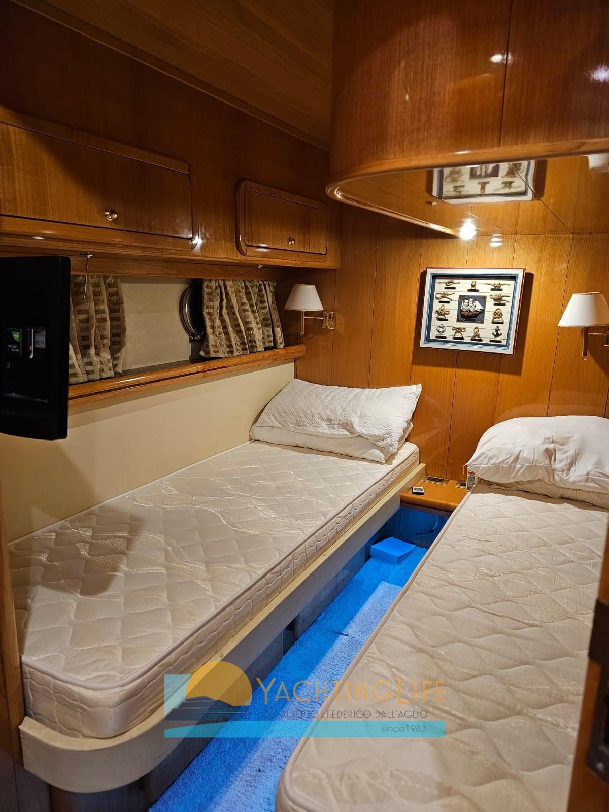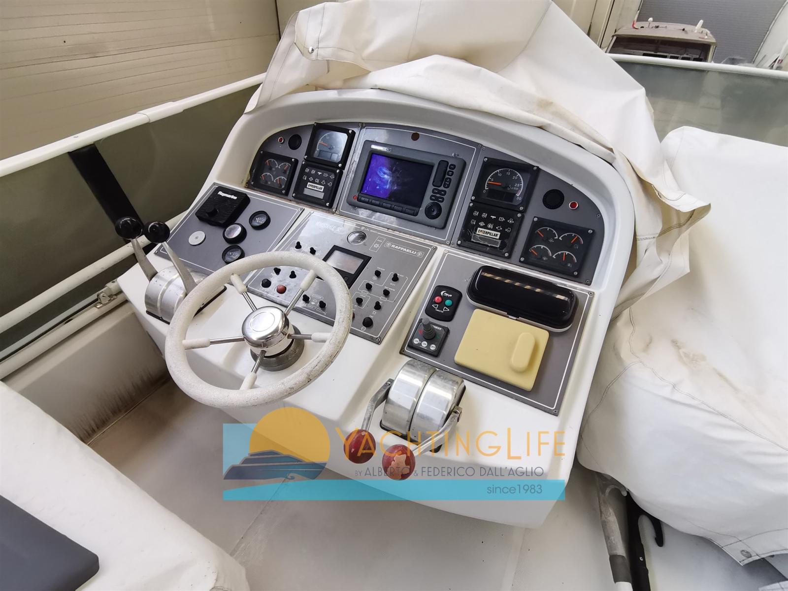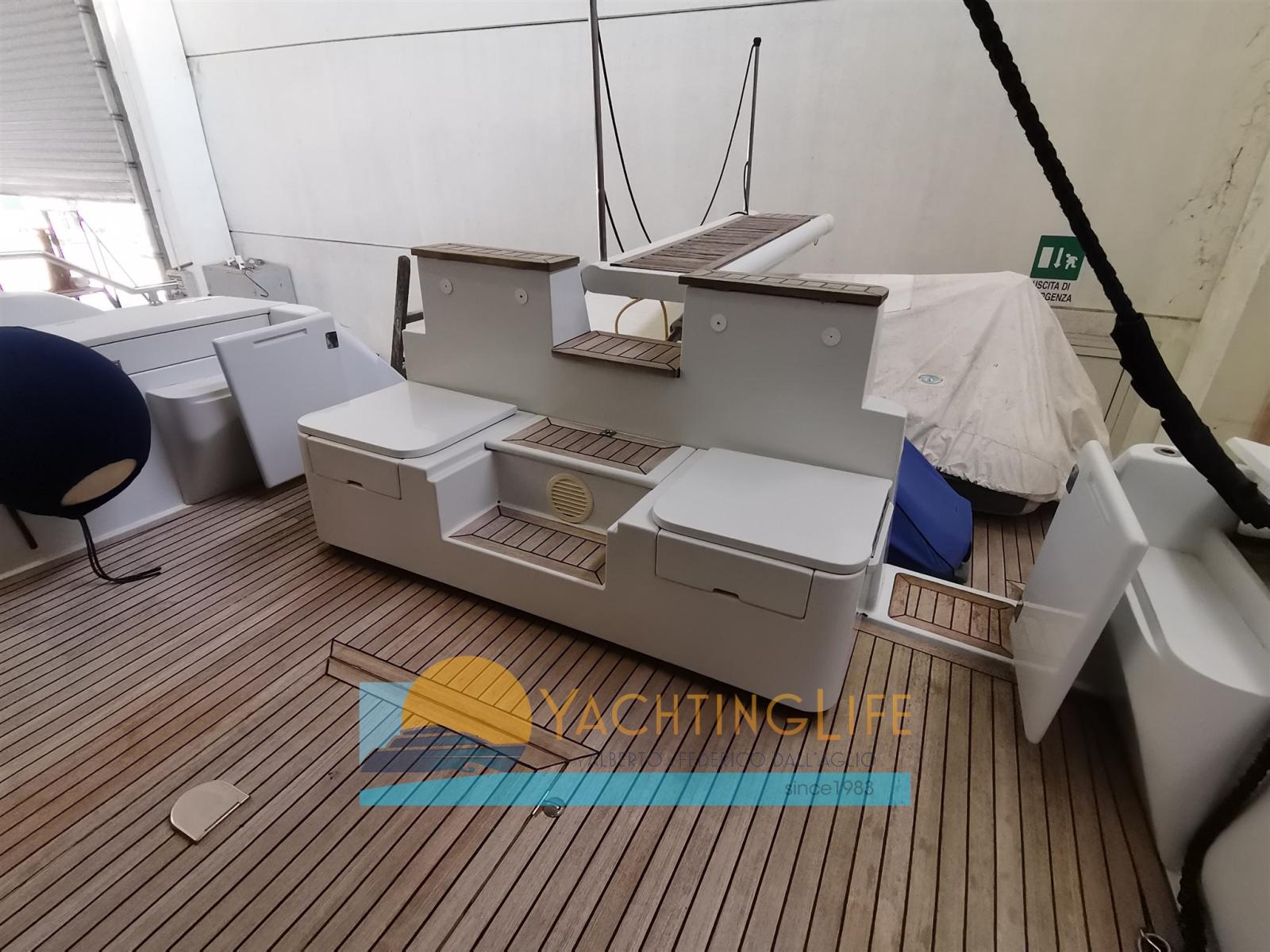 Alarme moteur, Alarme de pompe de cale, 2 Ancre, Eau sous pression, Chargeur de batterie (2020), 2 Douche de cockpit (a poppa e sul fly), Double barre à roue, 2 Hélice de rechange, Flaps hydrauliques, Indicateurs de flaps, Lavage de chaine, Spots sous-marins (2019), Passerelle (idraulica rinforzata), Plateforme arrière (allungata), Pompe de cale automatique, Cockpit en teck, Prise de quai, Onduleur, Guindeau électrique, Echelle de bain, table de cockpit, Annexe (320 Eurovinil e motore 25hp Mercury con cavi manetta nuovi), Corne, Winch électrique arrière.