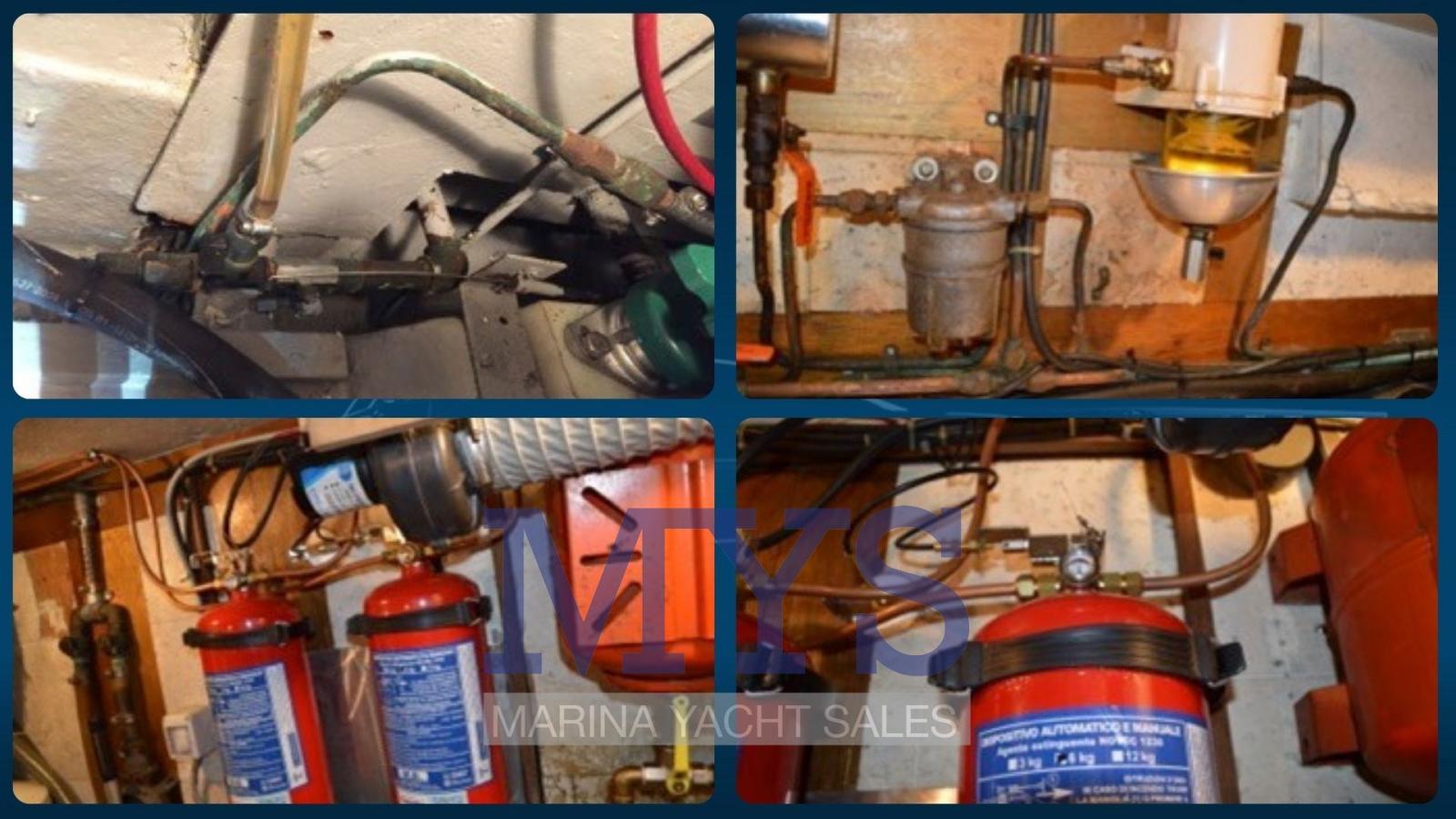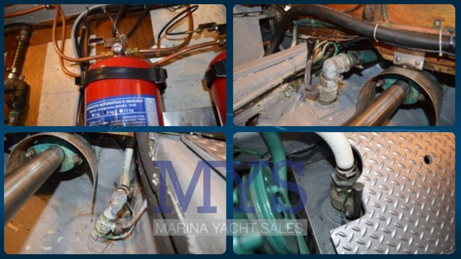 Alarme moteur, Alarme de pompe de cale, Ancre (Delta 16 kg + 85 mt. di catena in inox), Eau sous pression, Radeau de sauvetage (6 posti), 6 Batteries (x 200 Ah), Passavant en teck, Douche de cockpit, Double barre à roue, Hélice de rechange, Flaps hydrauliques, Bossoirs pour annexe, Extincteur(s) fixe(s), Lavage de chaine, Éclairage de courtoisie (led), Passerelle, Plateforme arrière (in Teak), Pompe de cale automatique, Pompe de cale manuelle, 2 Porte latérale, Cockpit en teck, Prise de quai, Connexion eau sous pression à quai, Répétiteur électronique, Guindeau électrique, Echelle de coupée (rimovibile), Echelle de bain, Chaise support HB, 2 table de cockpit, Table pliante de salon, Filières avec sortie latèrale, Corne, Pont en teck.