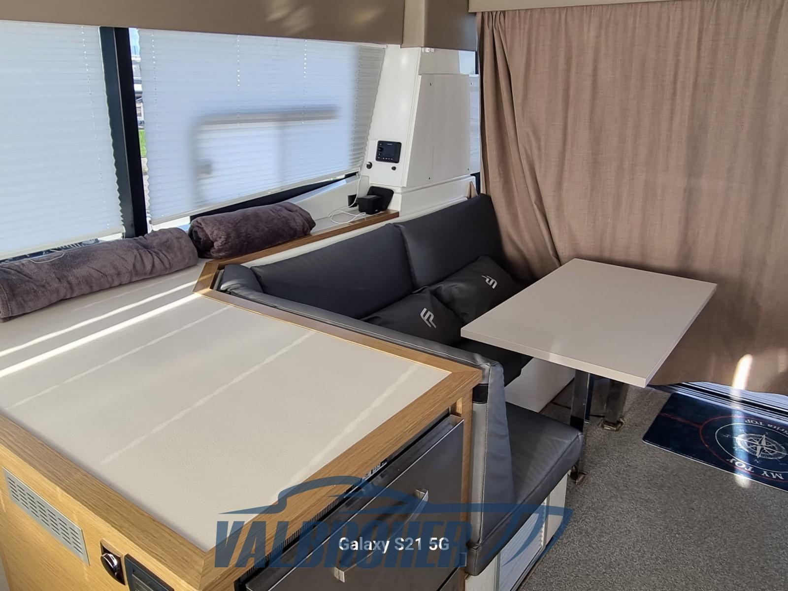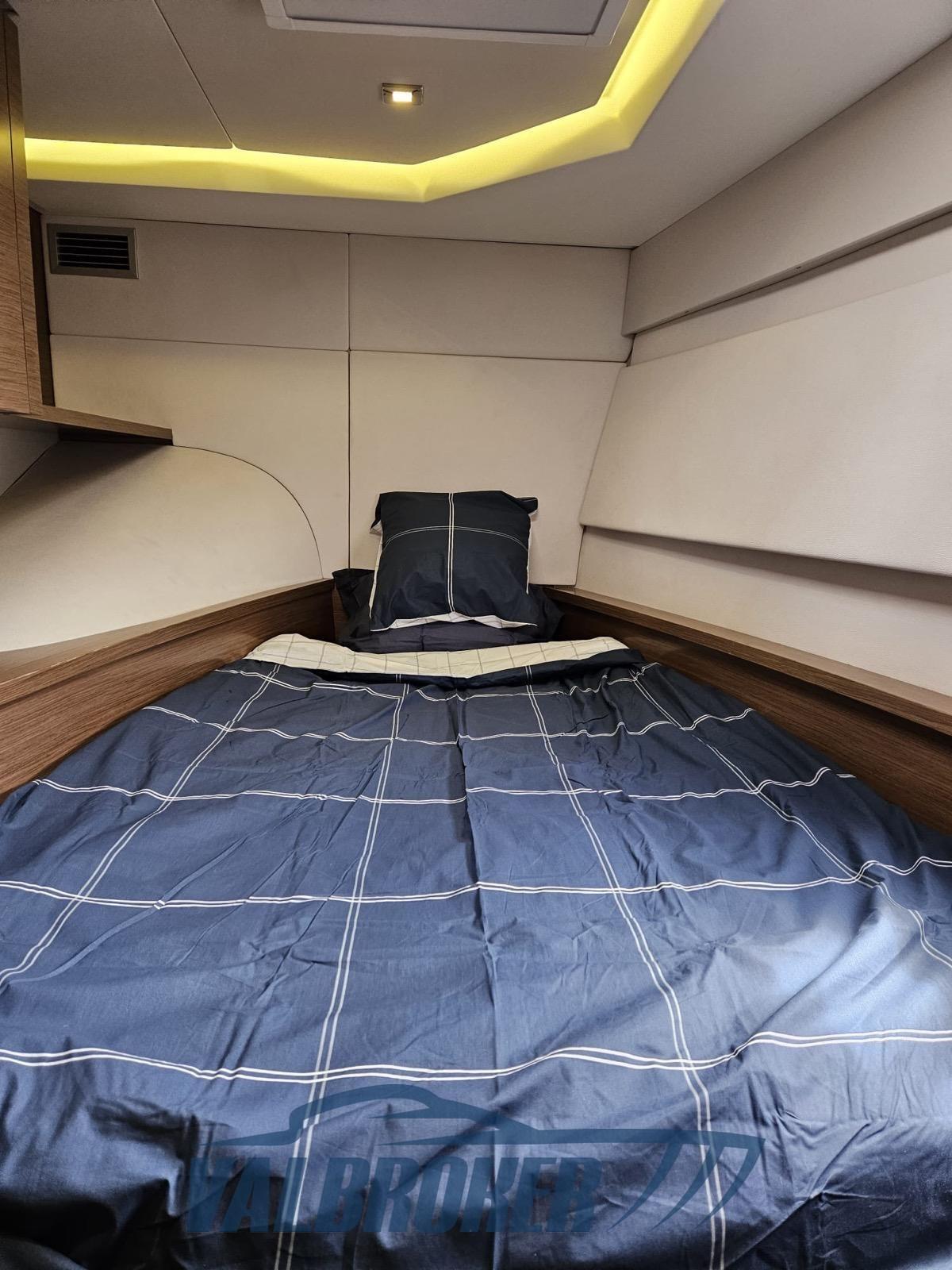 Bois de chêne clair, finition satinée, moquette au sol, Deux sièges Bolster réglables, timonerie hydroélectrique assistée, plans de travail en Corian, échelle en teck pour le flybridge