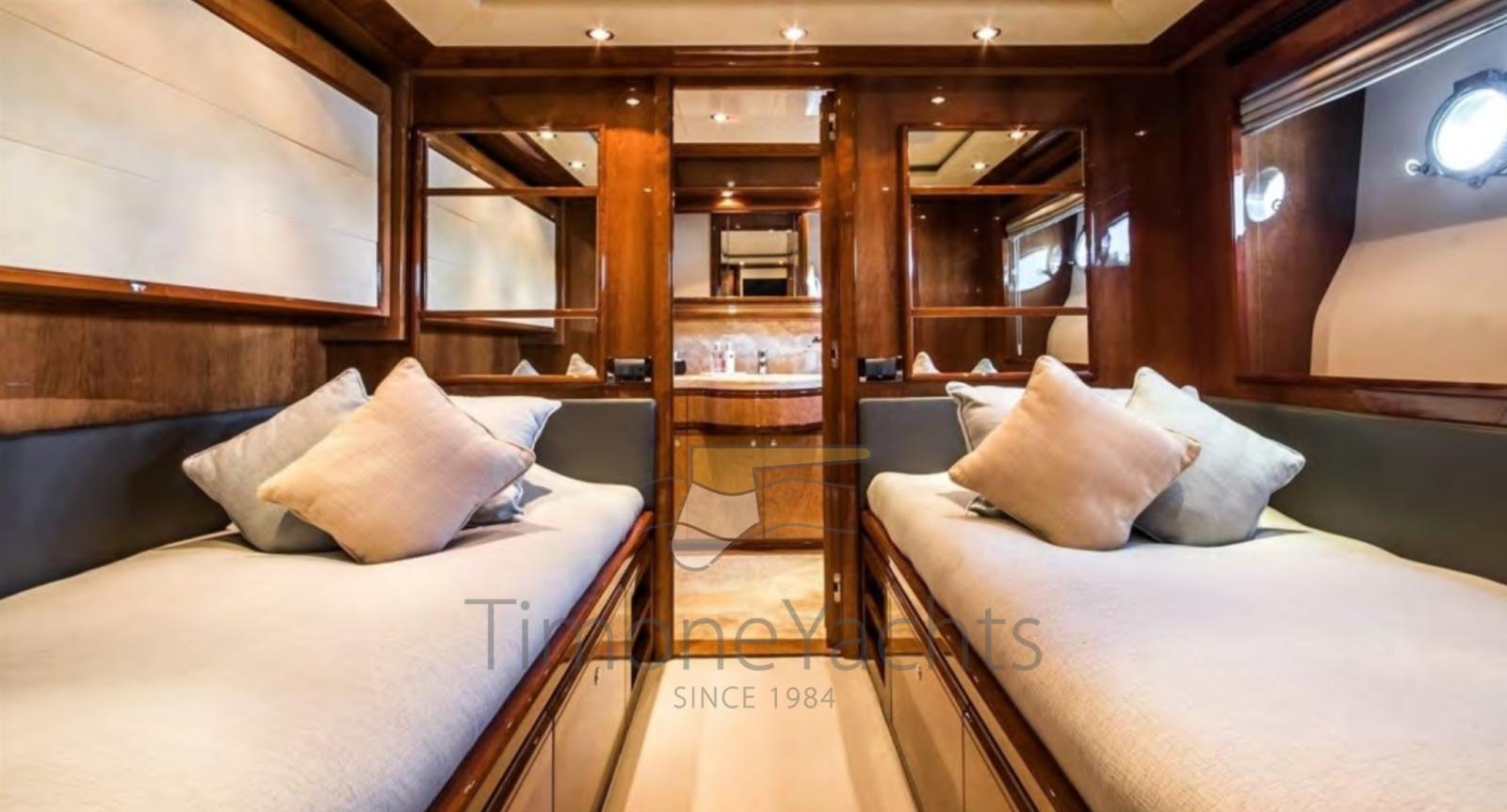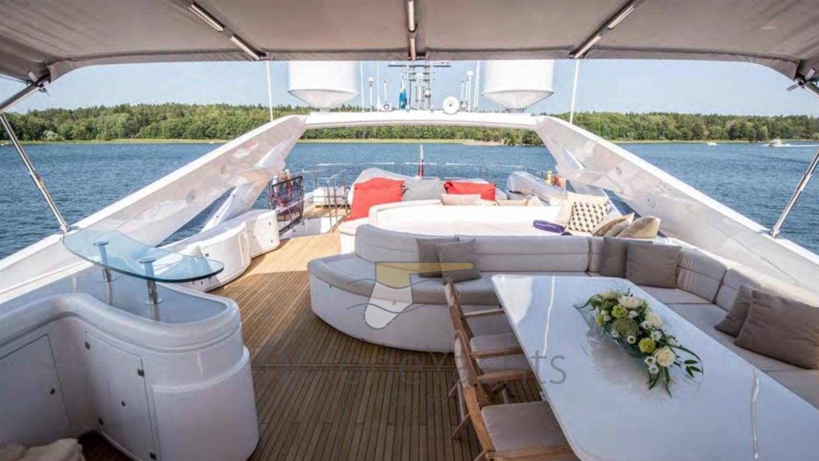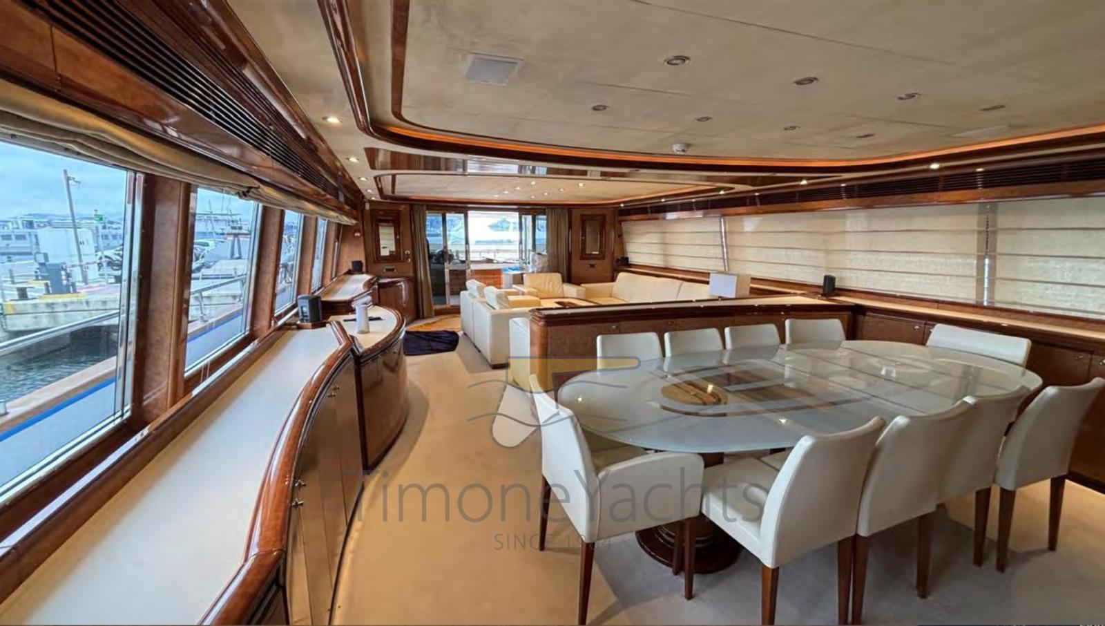 Alarme gaz, Alarme moteur, Alarme de pompe de cale, Alternateur, 2 Ancre, Eau sous pression, Passavant en teck, Double barre à roue, Flaps hydrauliques, Grue de flybridge, 2 Extincteur(s) fixe(s), Compresseur de plongée, Lavage de chaine, Passerelle, Pont en teck, Porte latérale, Cockpit en teck, Prise de quai, Connexion eau sous pression à quai, Selles pour Annexe, Stabilisateurs, table de cockpit, Annexe, Corne, Winch électrique arrière, Winch électrique avant.