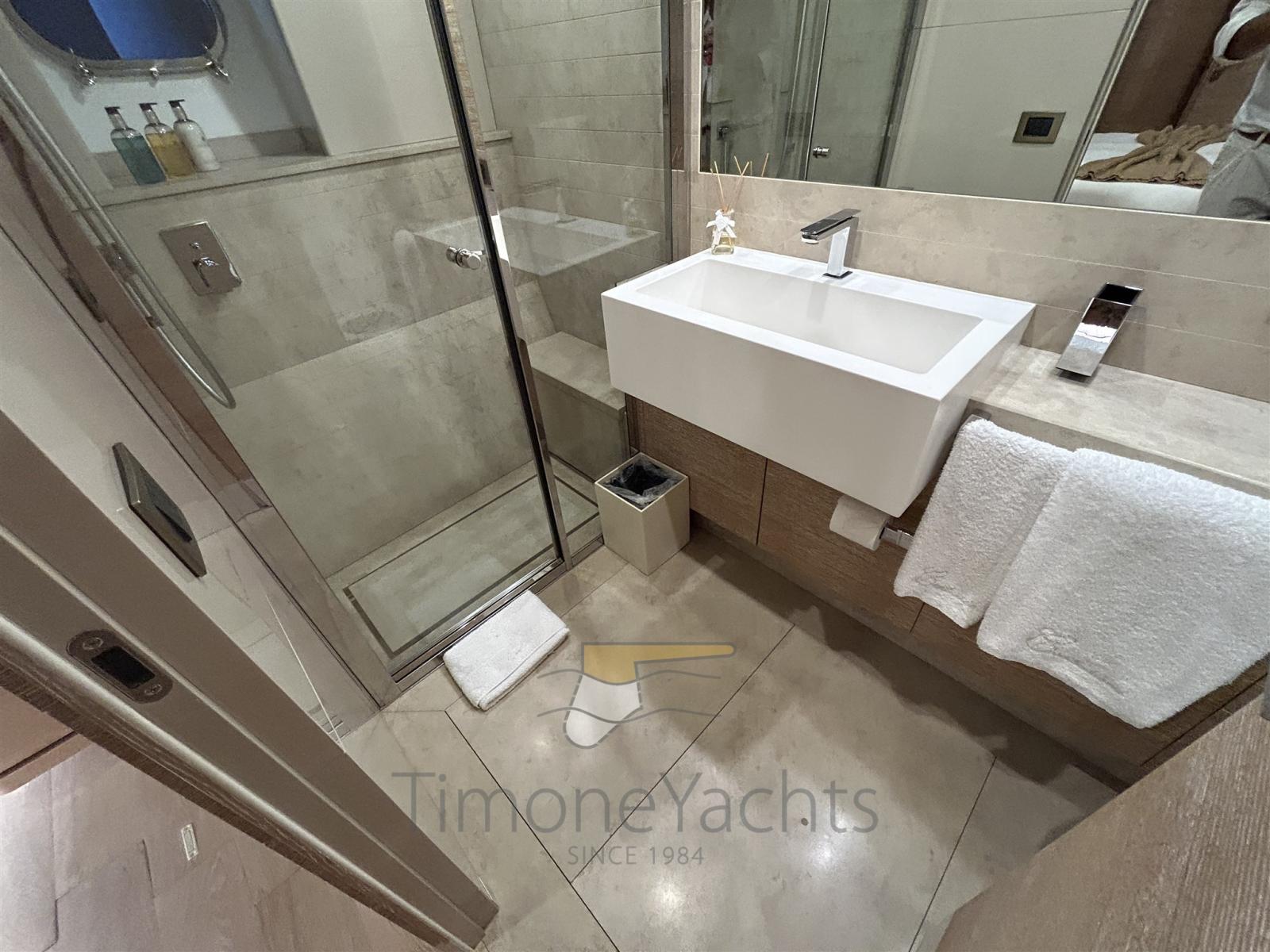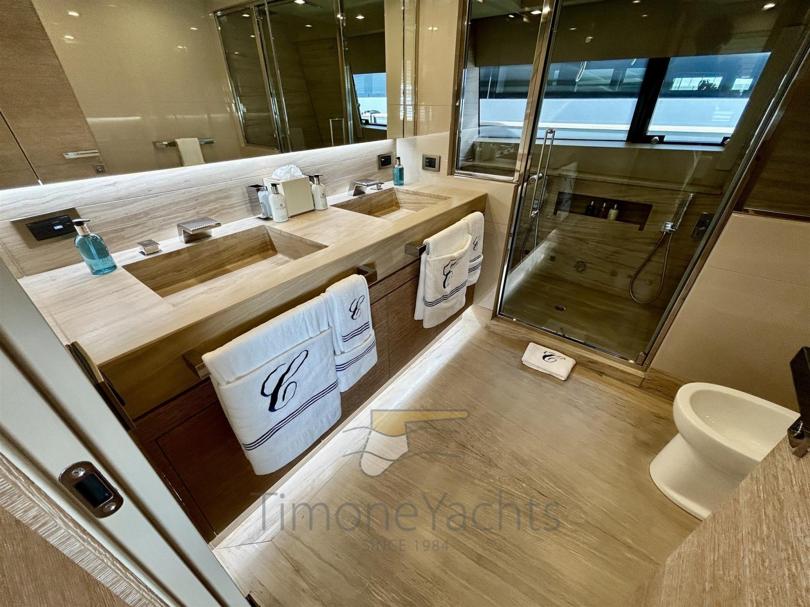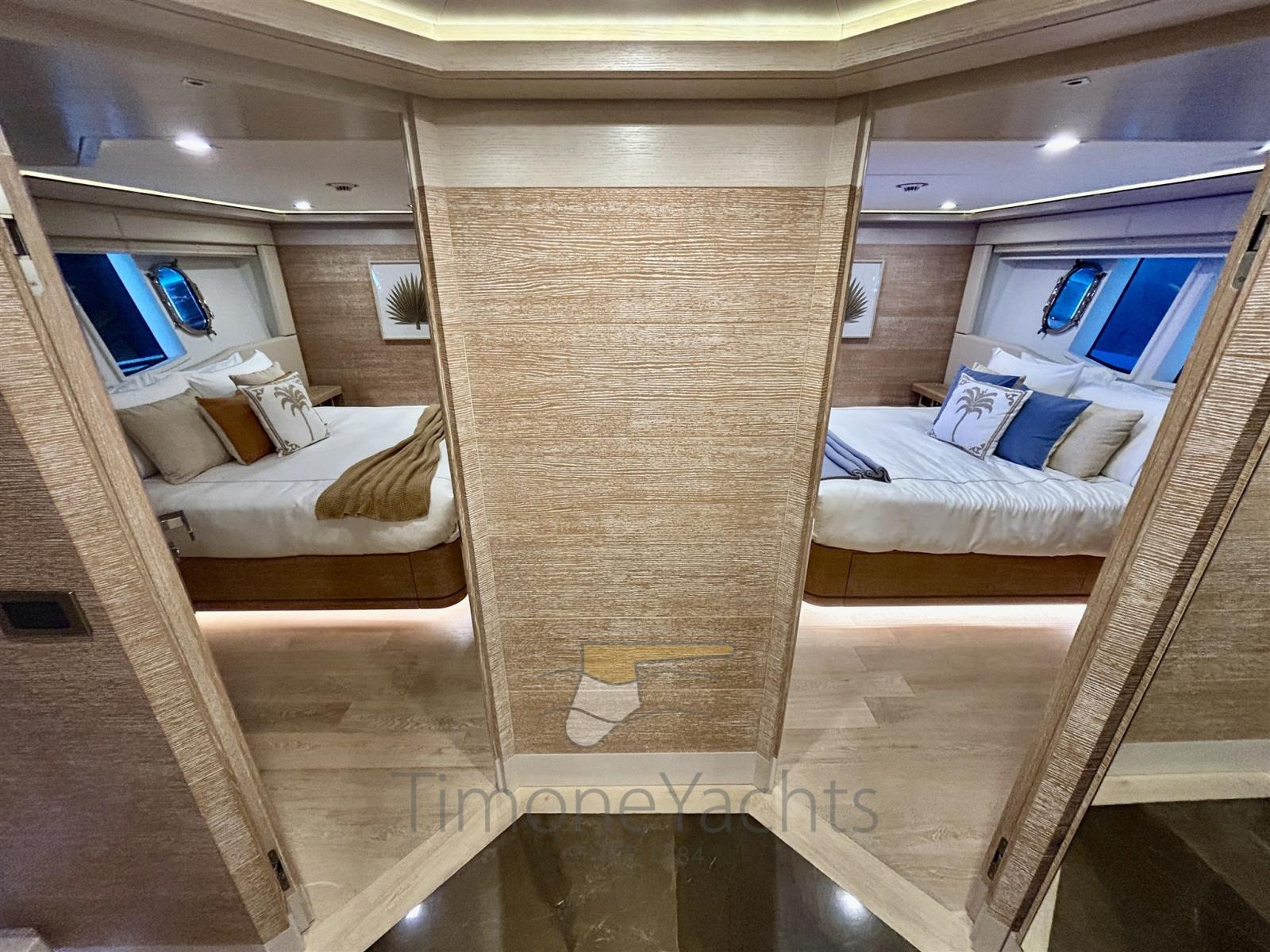 Le Navetta 33 dispose d’un aménagement à trois ponts avec la configuration typique de 5 cabines pour les invités, avec le maître à l’avant sur le pont principal et les 4 autres sur le pont inférieur. Le quartier de l’équipage est facilement accessible depuis la cuisine.