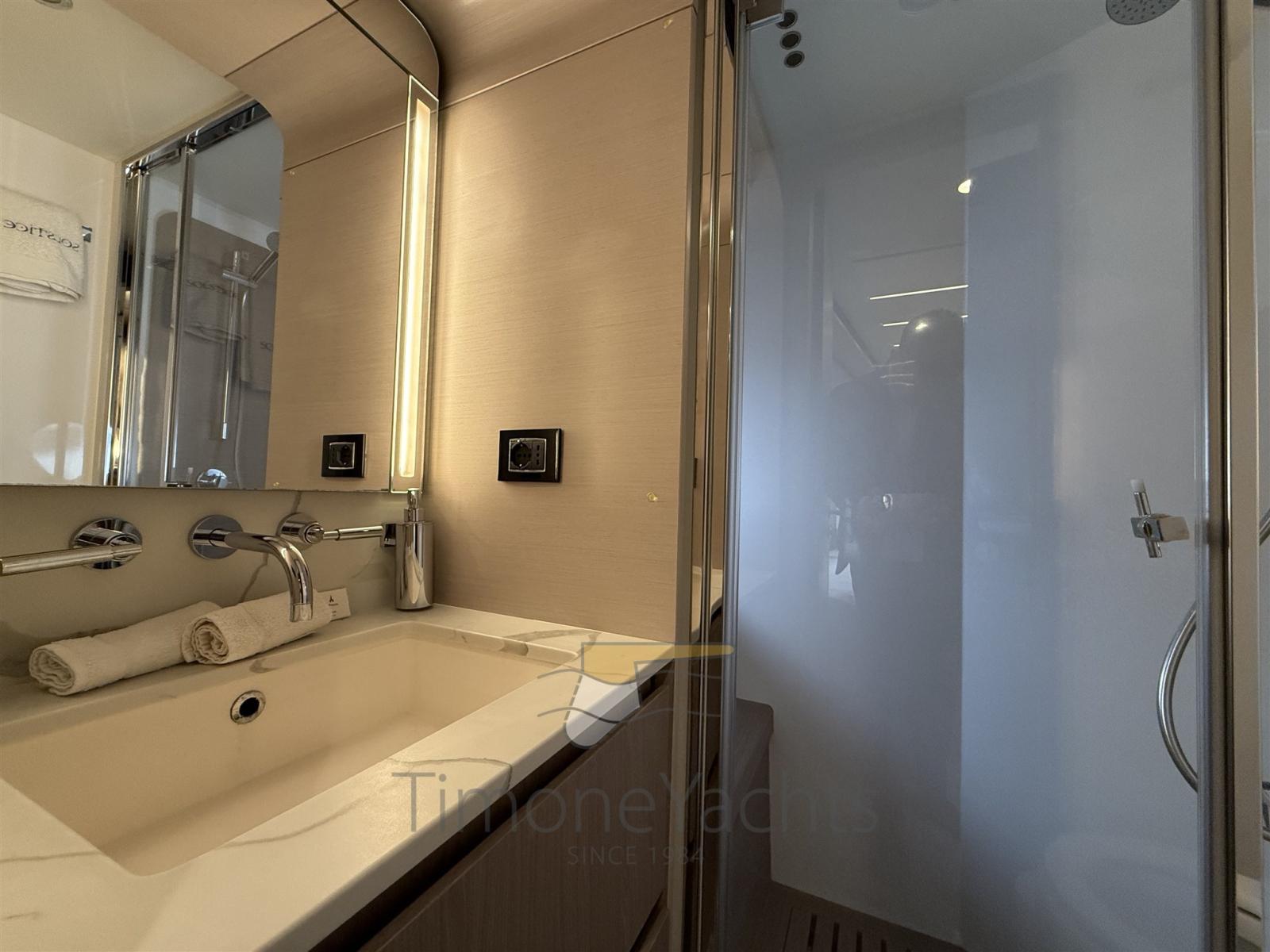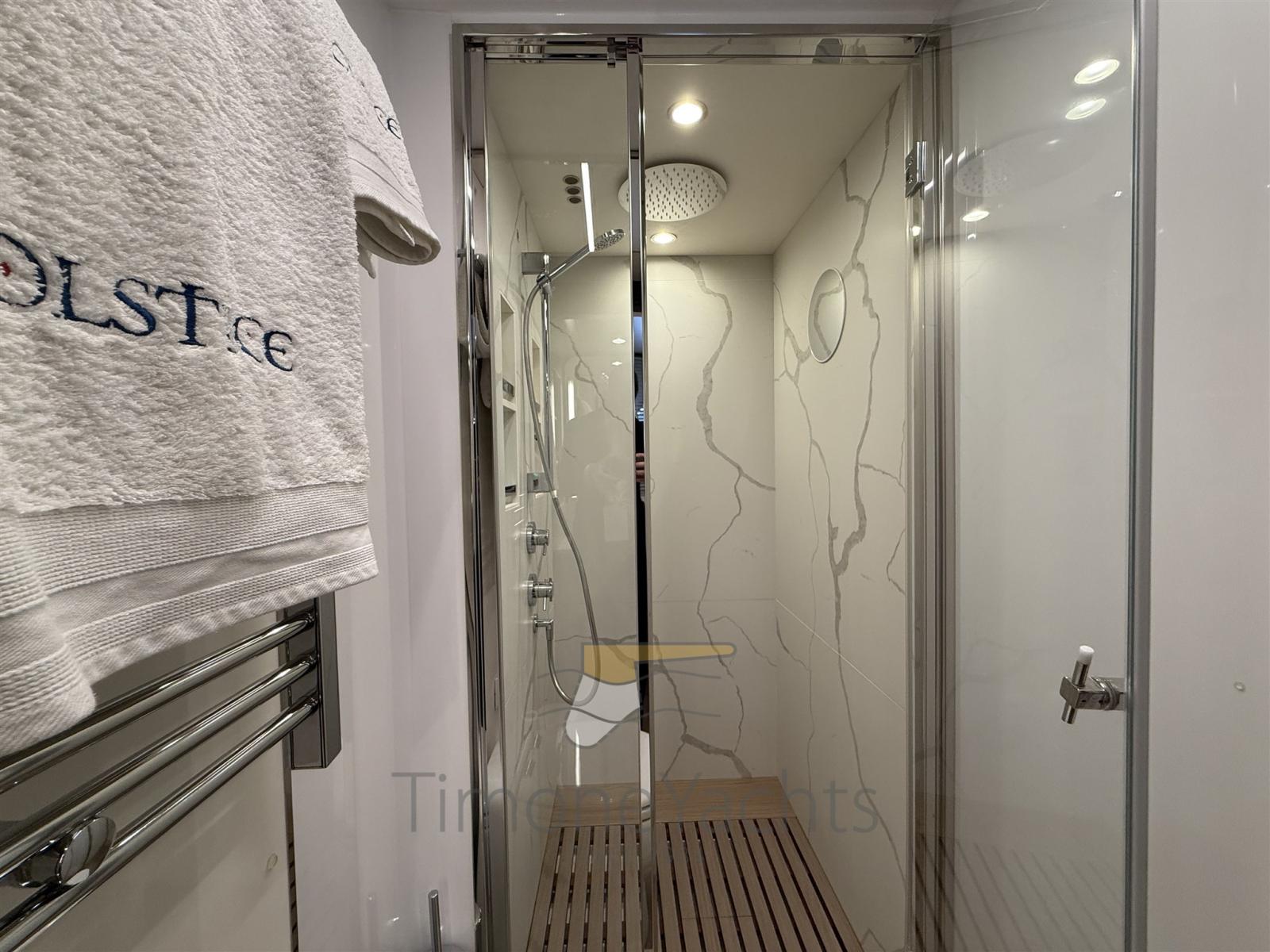 Propulsé par 2 moteurs MAN V12 de 1400 ch, il atteint une vitesse de croisière de 26 nœuds. Stabilisateurs Seakeeper pour une navigation en douceur même au mouillage.