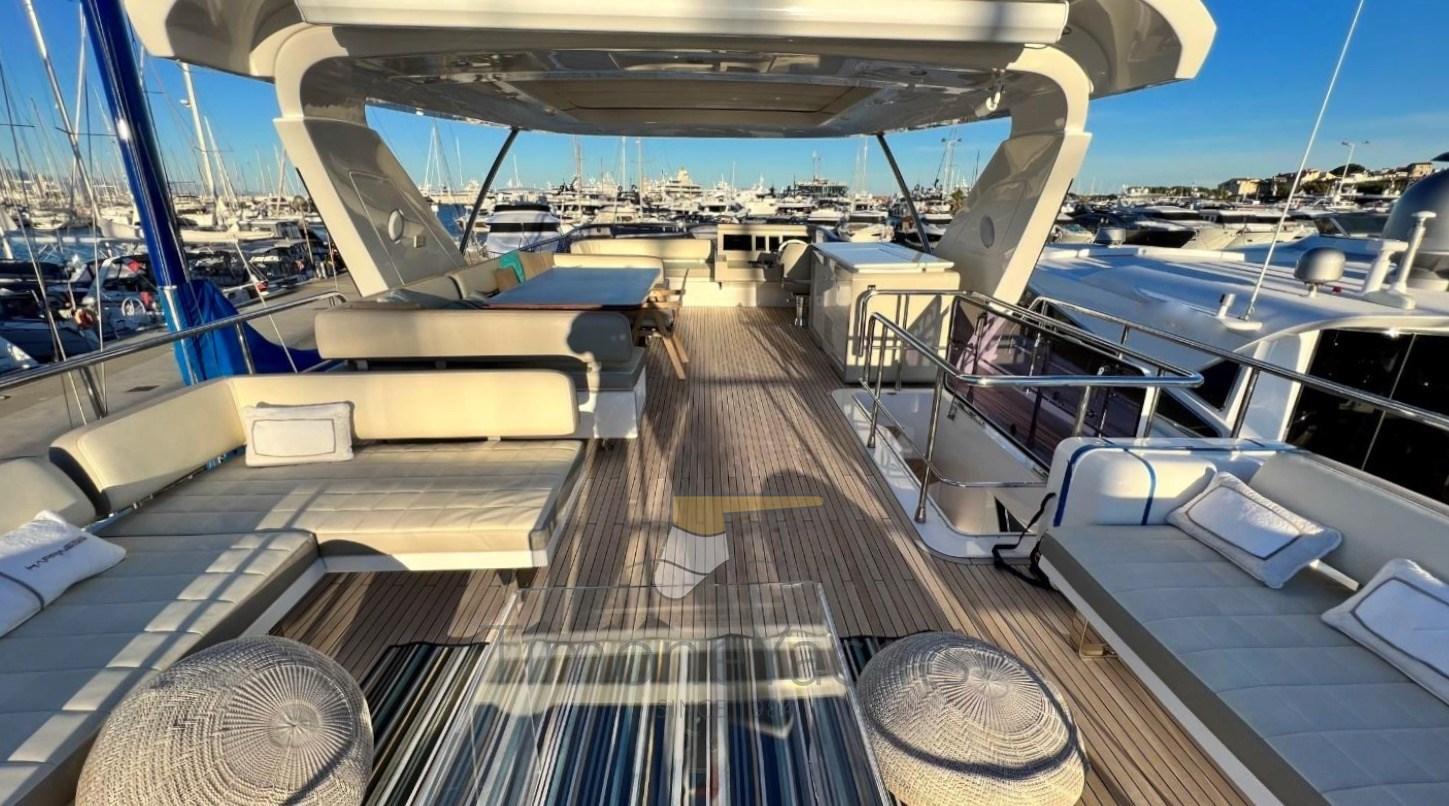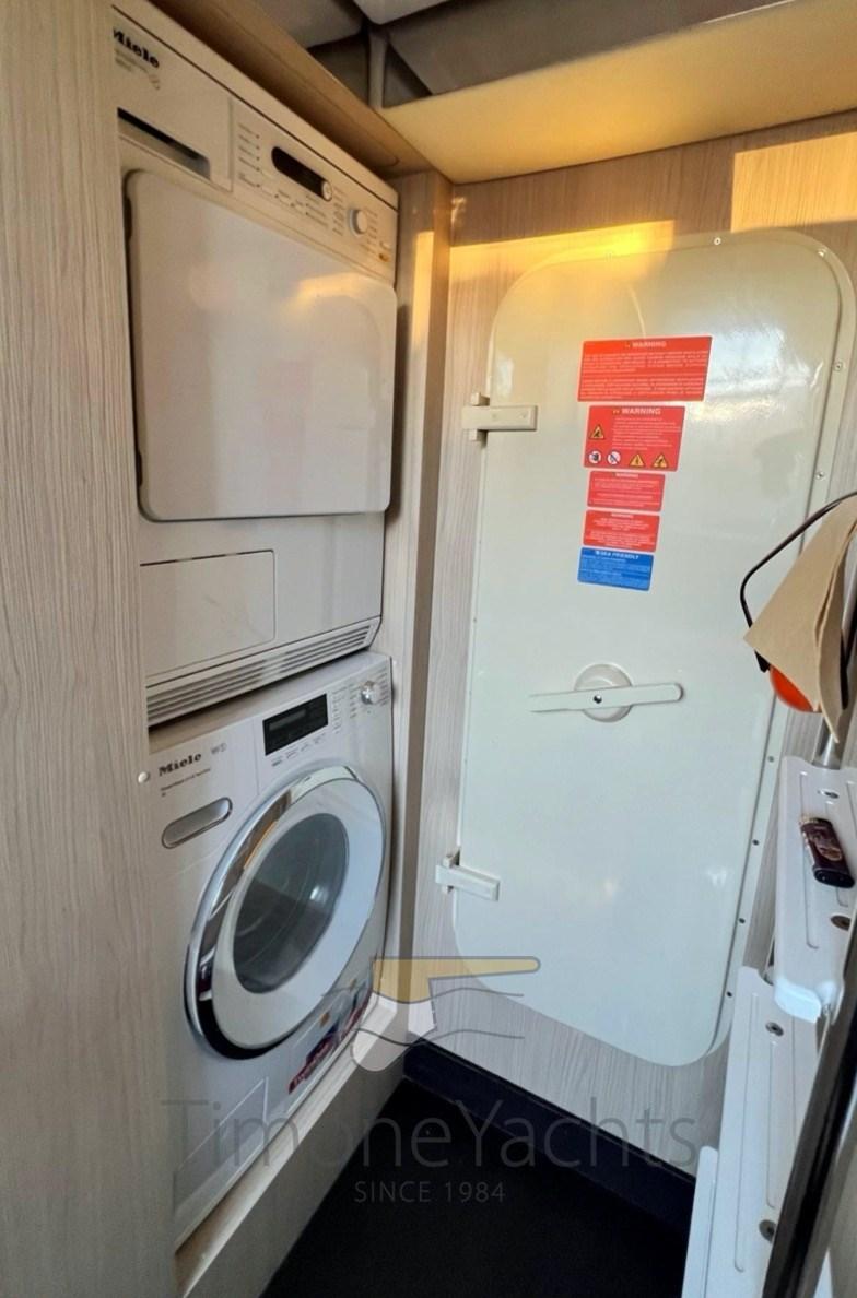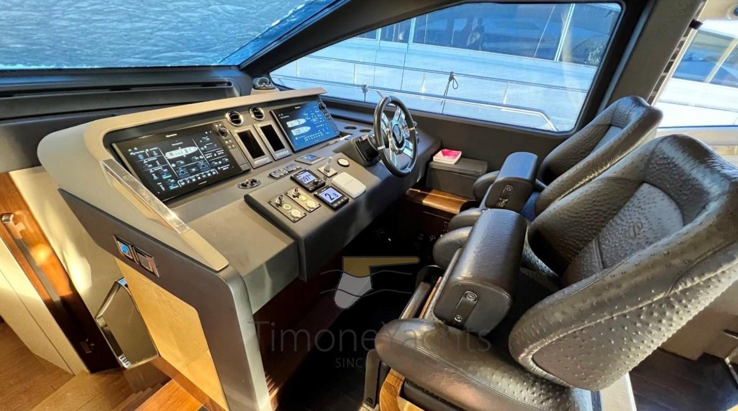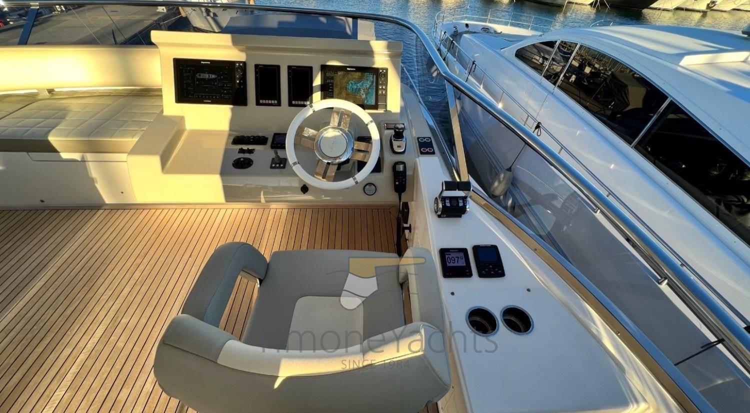 Taquets pliants, Passavant en teck, Douche de cockpit, Phare de poursuite, Flaps hydrauliques, Grue de flybridge, Hard top, Extincteur(s) fixe(s), Indicateurs de flaps, Lavage de chaine, Éclairage de courtoisie, Passerelle, Porte latérale, Cockpit en teck, Prise de quai, Connexion eau sous pression à quai, Stabilisateurs (Seakeeper), table de cockpit, Annexe, Corne, 2 Winch électrique arrière, Winch électrique avant.