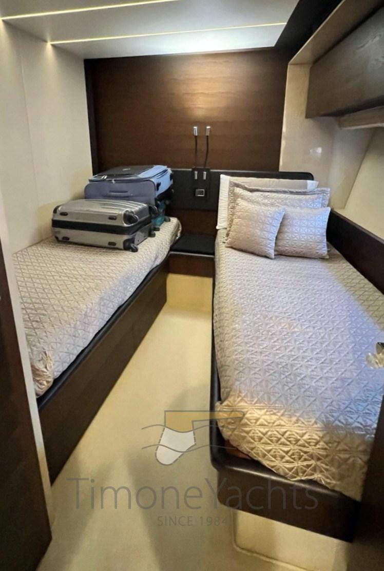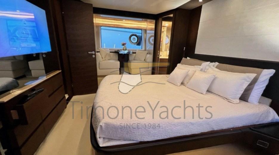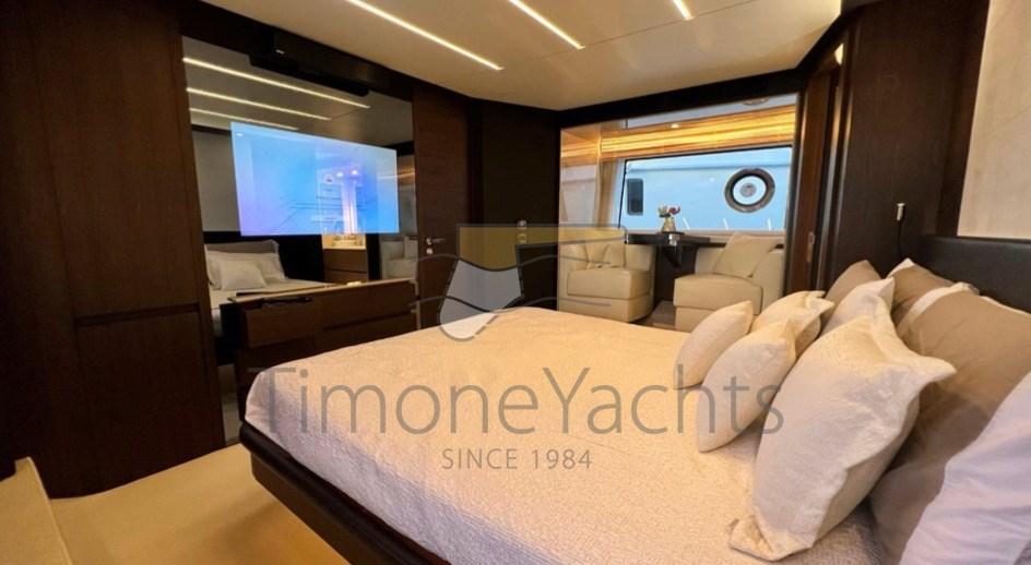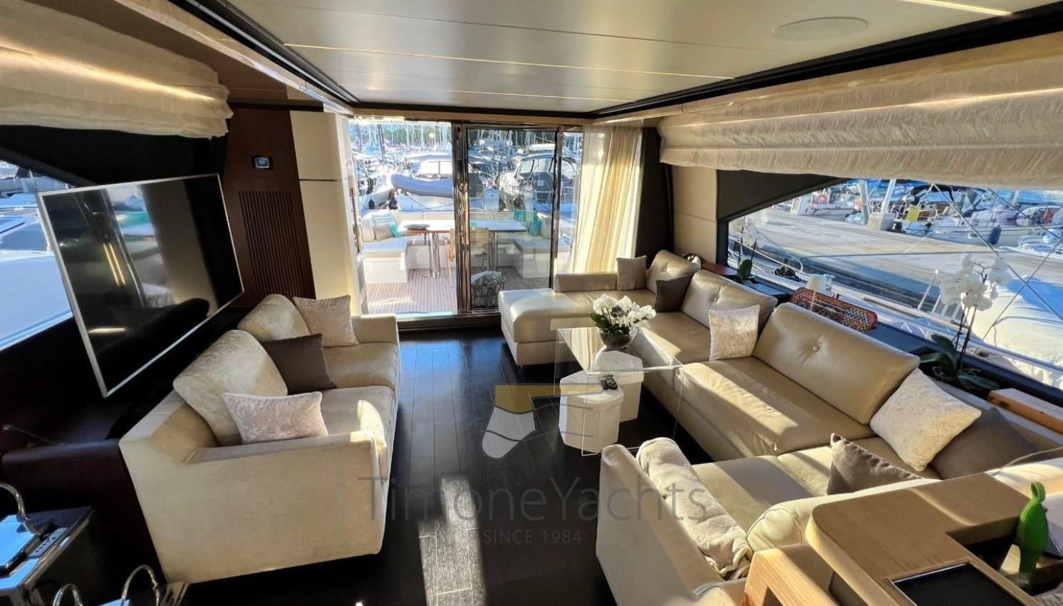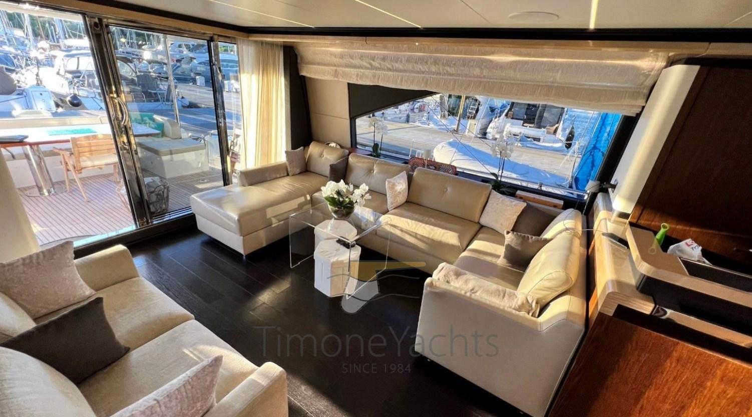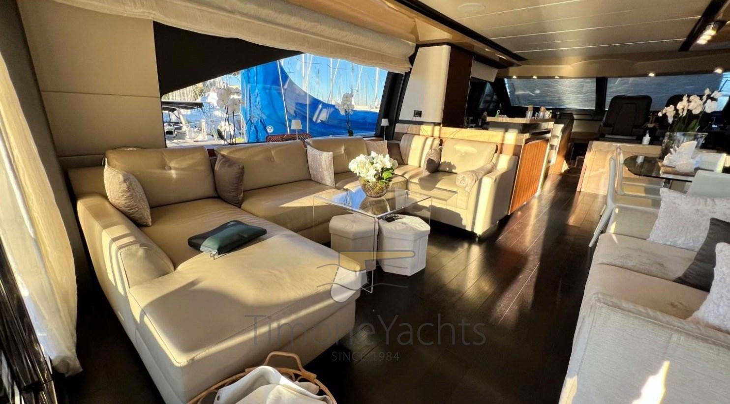 Taquets pliants, Passavant en teck, Douche de cockpit, Phare de poursuite, Flaps hydrauliques, Grue de flybridge, Hard top, Extincteur(s) fixe(s), Indicateurs de flaps, Lavage de chaine, Éclairage de courtoisie, Passerelle, Porte latérale, Cockpit en teck, Prise de quai, Connexion eau sous pression à quai, Stabilisateurs (Seakeeper), table de cockpit, Annexe, Corne, 2 Winch électrique arrière, Winch électrique avant.