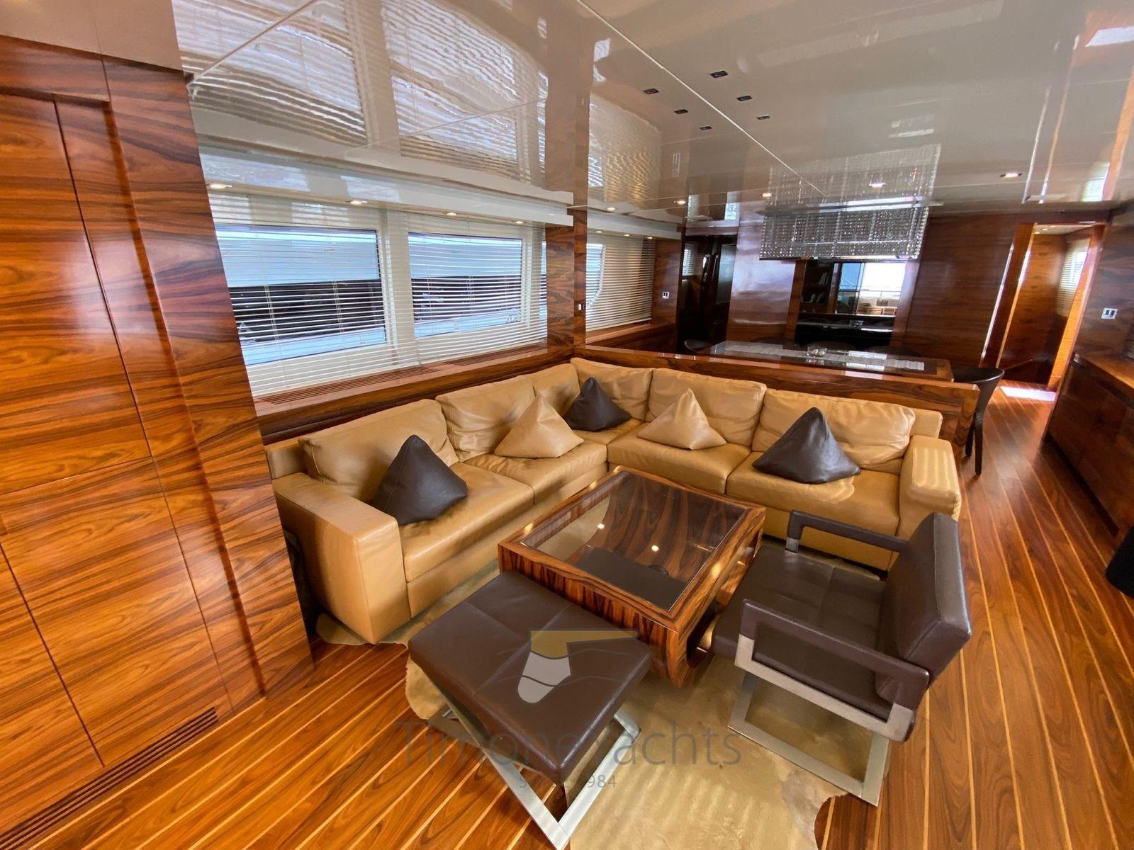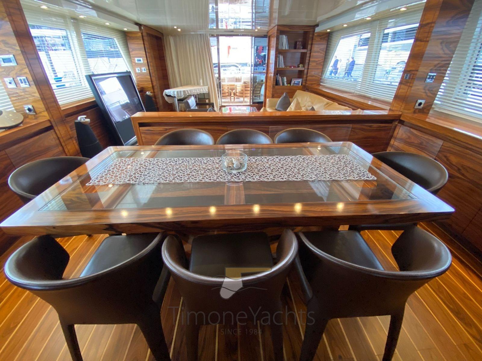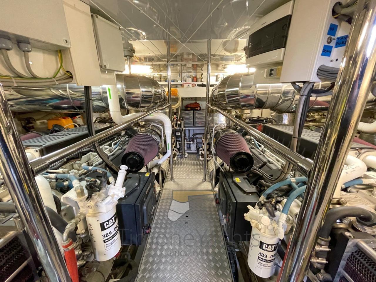 Équipé de moteurs CAT C32 DITA, le yacht est capable d’atteindre des vitesses allant jusqu’à 28 nœuds. Le flybridge