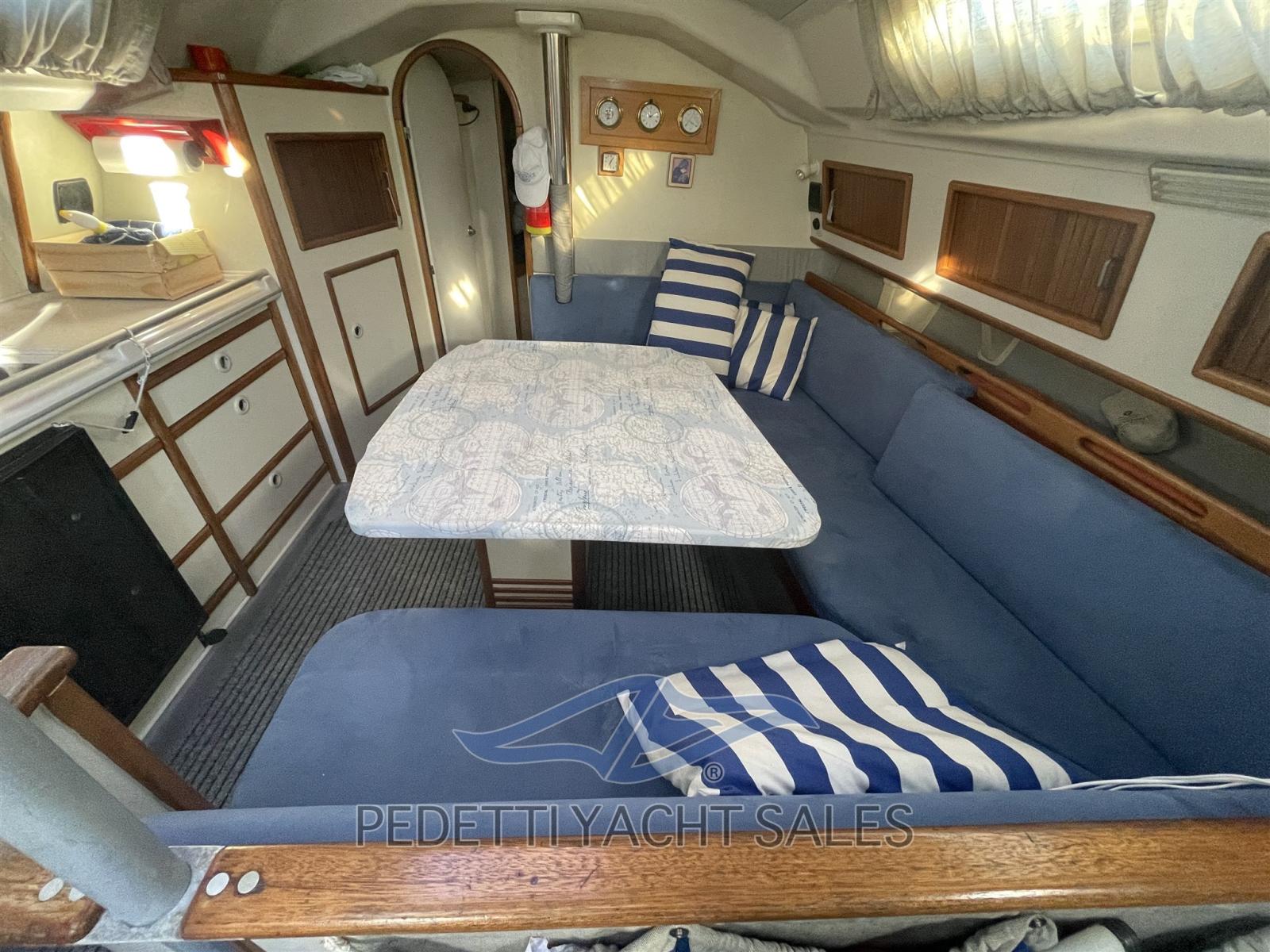 Alternateur, Eau sous pression, Douche de cockpit, Passerelle, Pompe de cale manuelle, Prise de quai, Guindeau électrique, Gréement monotoron, Echelle de bain, table de cockpit, Table pliante de salon.