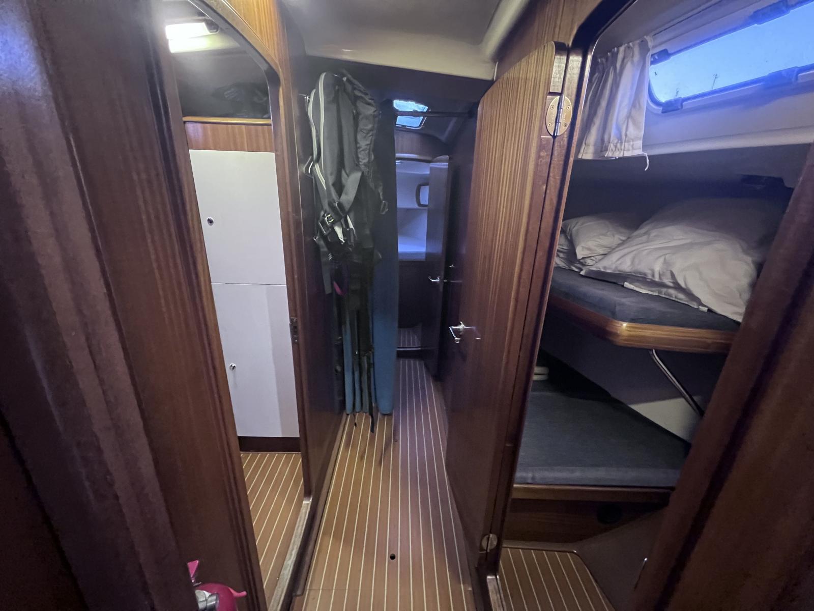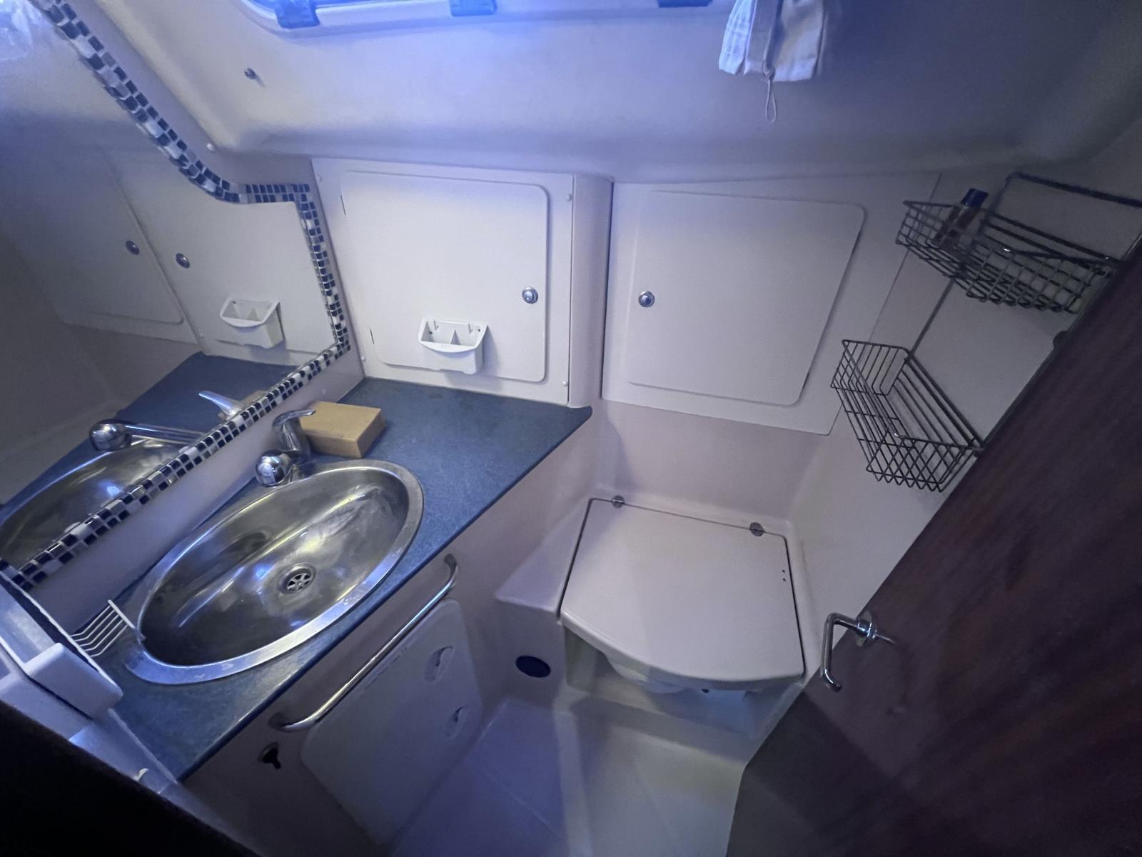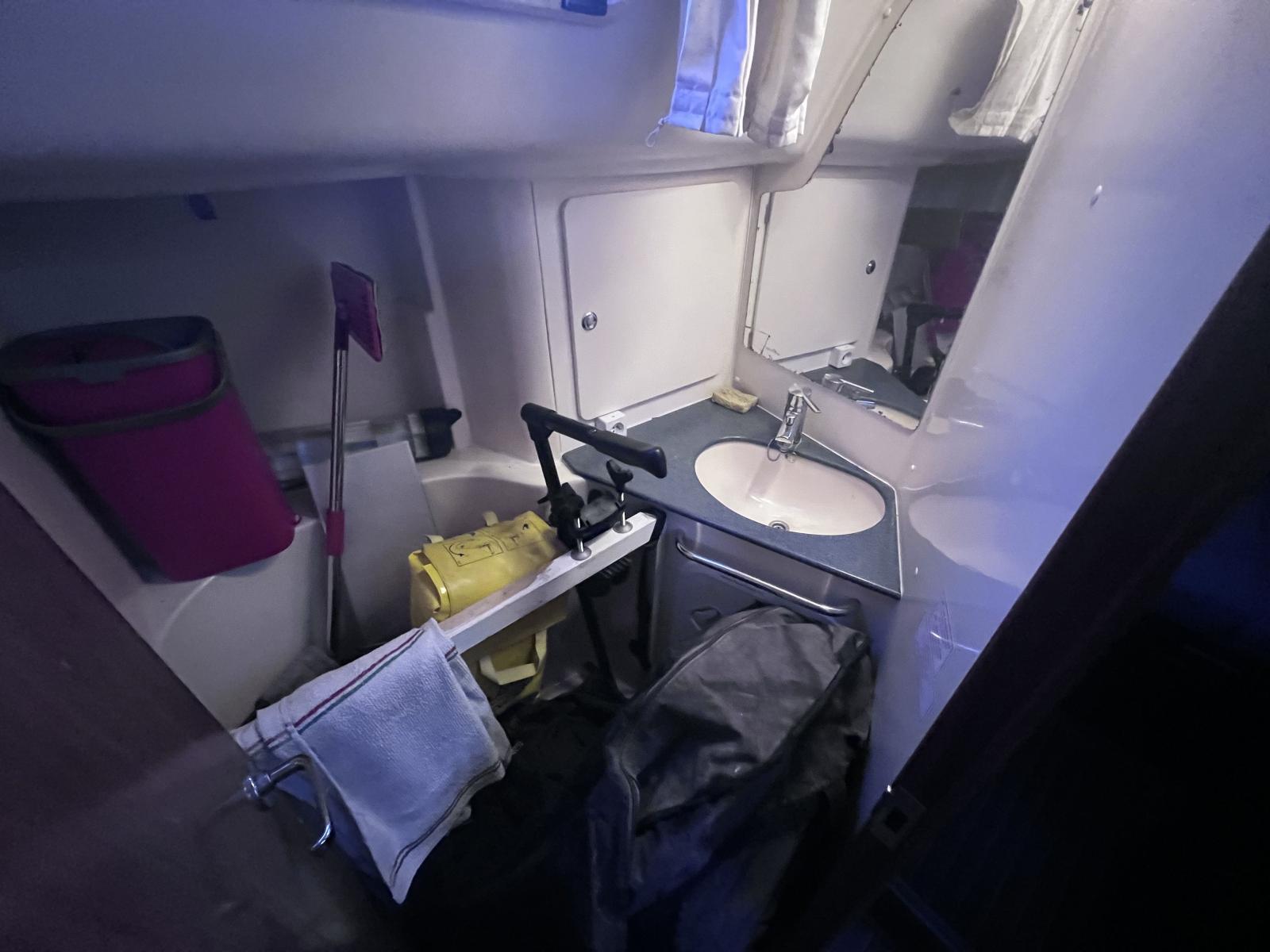 3 cabinets de toilettes : 2 cabinets de toilettes à Babord avec évier, douche (pompes electrique) et WC (pompes manuelles) et un cabinet de toilette à tribord avec évier (1 Pompe d’eau grises douche en secours)