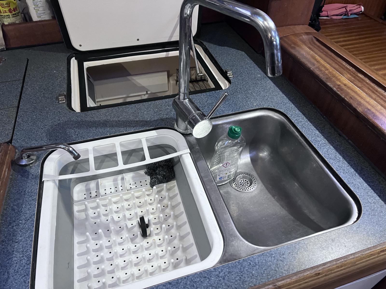 Evier deux bac – pompe eau douce – eau chaude et eau froide – pompe à pied eau de mer sur évier cuisine