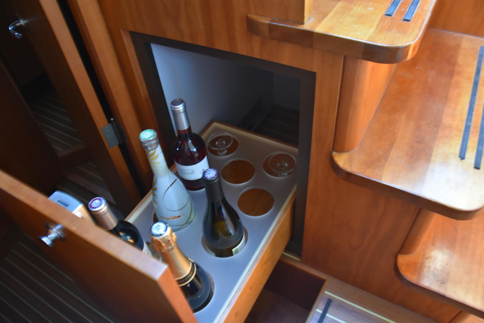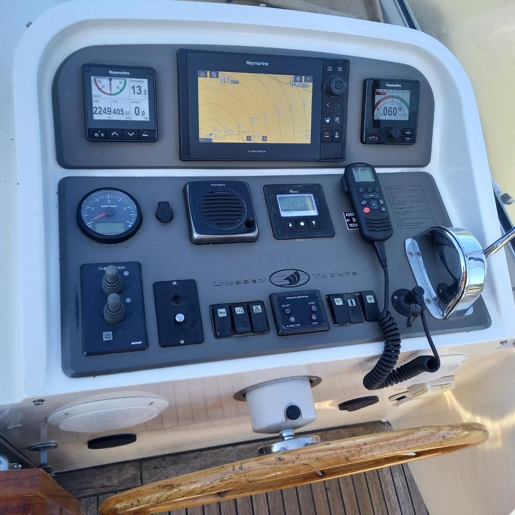 Electronique Raymarine : Pilote automatique avec commande à distance, écran multifonction avec GPS et carte Navionics, VHF, sondeur et loch. Projecteur au mât avec commande au poste de pilotage.