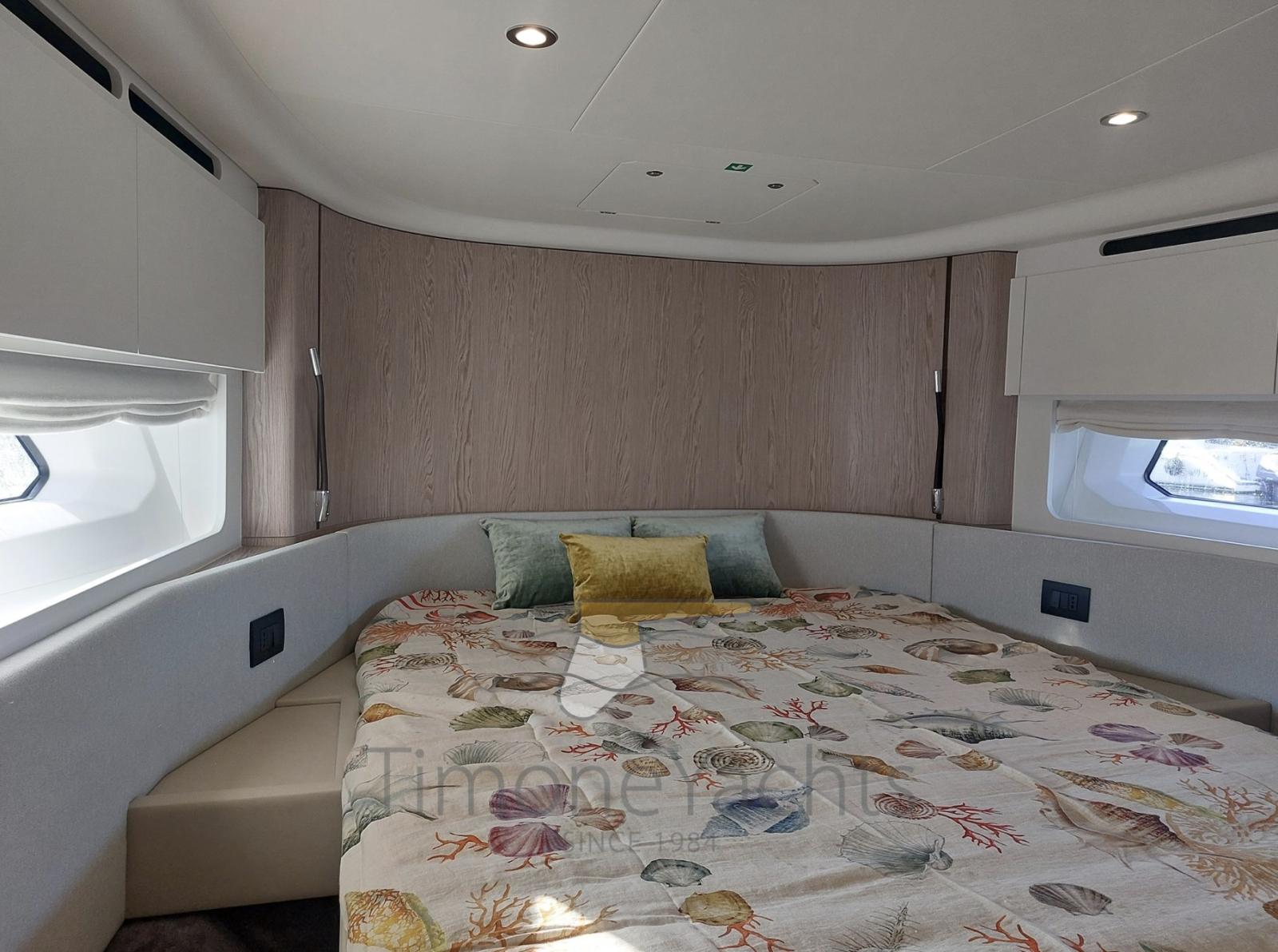 Alarme gaz, Alarme moteur, 4 Alarme de pompe de cale, Alternateur, 2 Eau sous pression, Trim hydraulique, Passavant en teck, Câble d’alimentation à quai, Couleur spéciale (Deep Blue), Filères, Douche de cockpit, Double barre à roue, Phares fixes arrière, Flaps électriques, Indicateurs de flaps, Lavage de chaine, Éclairage de courtoisie, Spots sous-marins, Moteur hors-bord pour annexe, Défenses, Passerelle, Plateforme arrière, Pompe de cale automatique, Pompe de cale manuelle, Pont en teck, Porte latérale, Cockpit en teck, Prise de quai, Connexion eau sous pression à quai, Guindeau électrique, Echelle de bain, Selles pour Annexe, table de cockpit, Table pliante de salon, Annexe (Submarine + Yamaha 20hp), Filières avec sortie latèrale, Corne, Winch électrique arrière, Winch électrique avant.