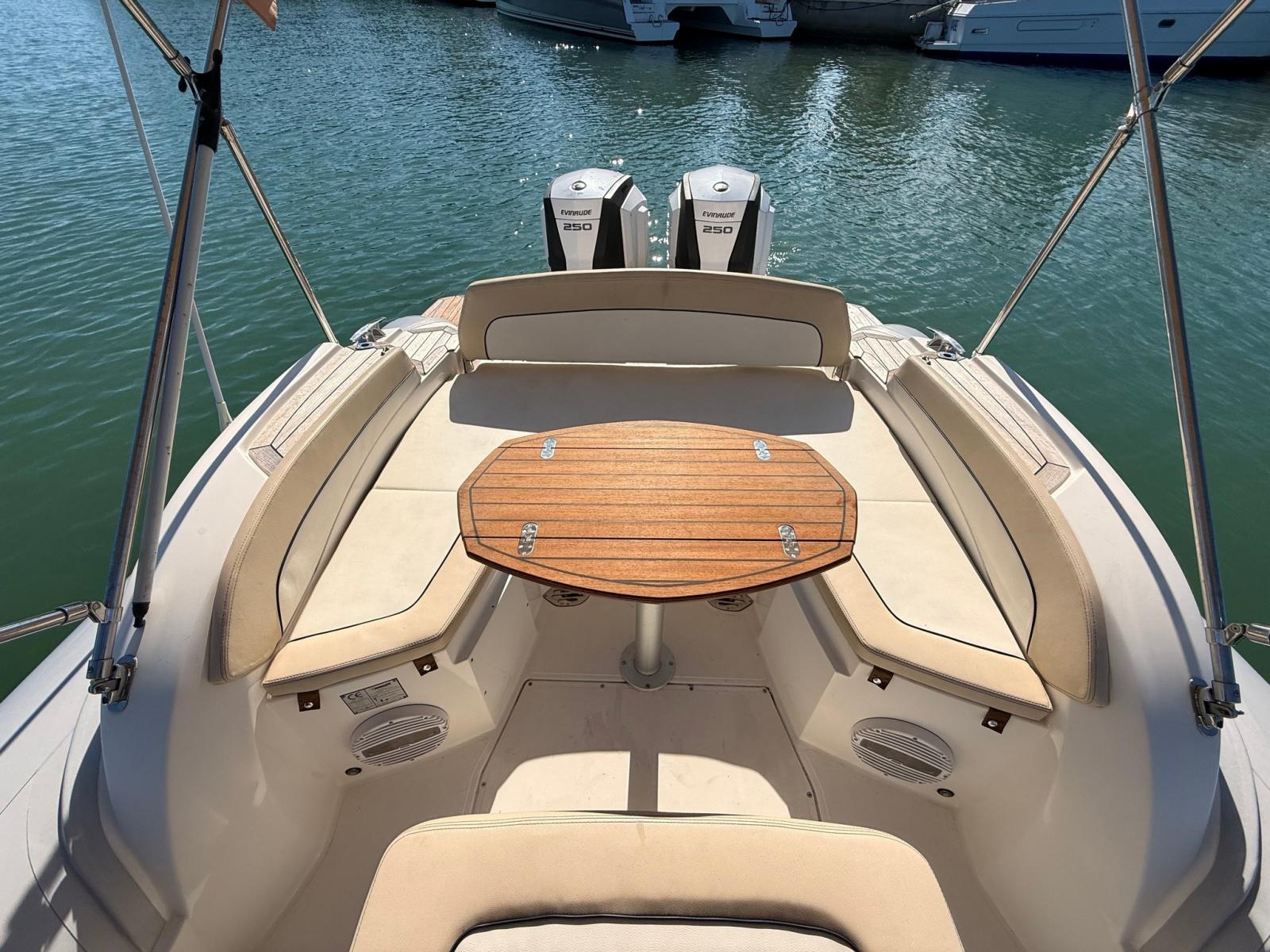 Grâce au bicylindre Evinrudes de 250 CV, le Marlin 298 atteint des vitesses de plus de 45 nœuds, offrant une navigation brillante et précise.