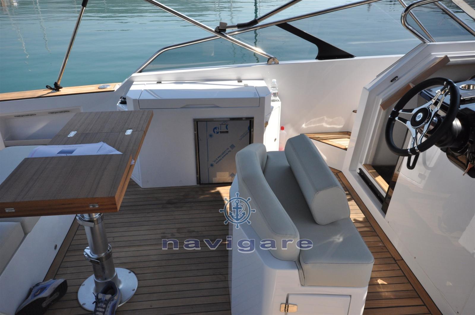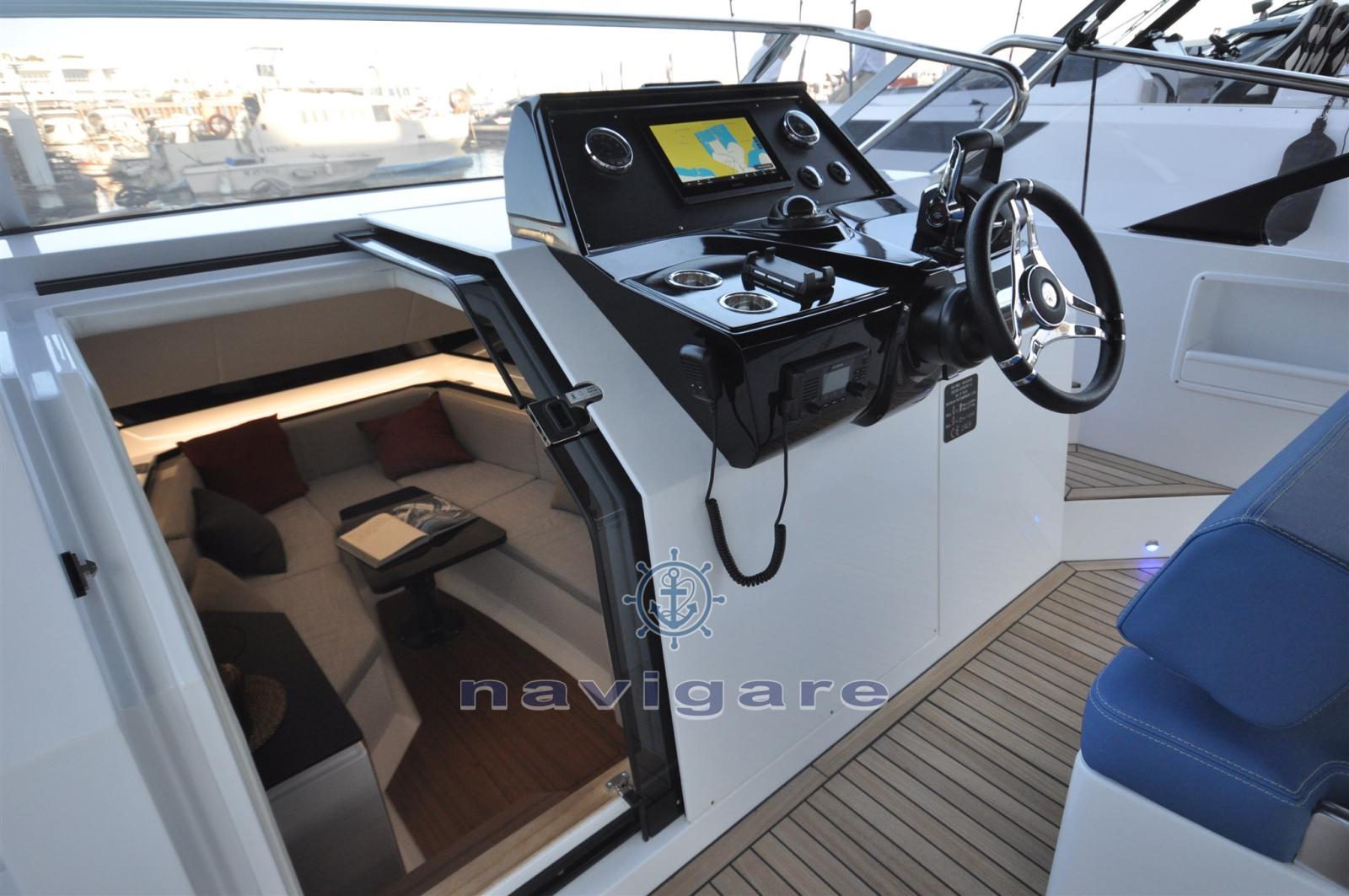 COMPARTIMENT TECHNIQUE • Isolation thermo-acoustique • Capot à commande électrique • Système d’extinction d’incendie dans la salle des machines • Pompes de cale automatiques • Capacité du réservoir de carburant : 640 litres • Vannes de carburant avec verrous de sécurité à la barre. • Capacité du réservoir d’eau : 200 litres • Pompe de chasse d’eau douce* • Pompe d’eau douce* • Réservoir d’eau sale de 80 litres avec pompe • Point de vidange du réservoir de vidange sur le côté de la plate-forme. • 2 batteries de moteur AGM • 2 batteries de service AGM • Génératrice de 4 kW avec batterie* • Batterie AGM supplémentaire* • Système de climatisation : 12 000 BTU*