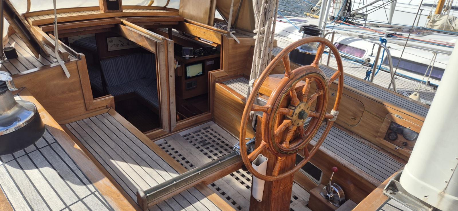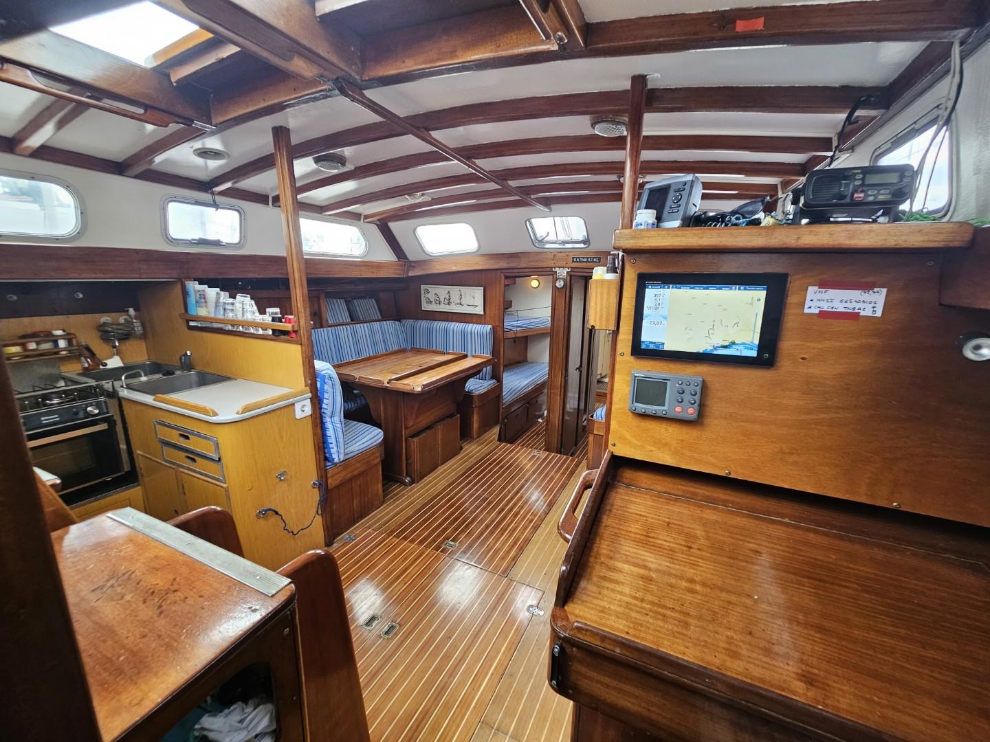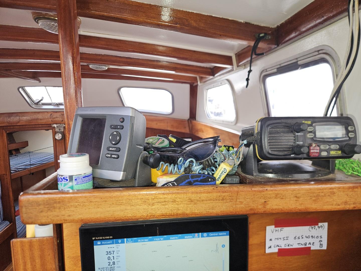 L’intérieur, entièrement en boiseries vernies, offre un confort rare pour un voilier de tradition : une cabine master centrale à la poupe avec lit double et salle d’eau privative, deux cabines avant avec lits superposés et salle d’eau commune, ainsi qu’un grand carré lumineux doté d’une table pour huit convives et d’une banquette supplémentaire. Le poste de navigation est équipé d’un GPS Furuno tactile récent, d’une VHF et d’une instrumentation complète.