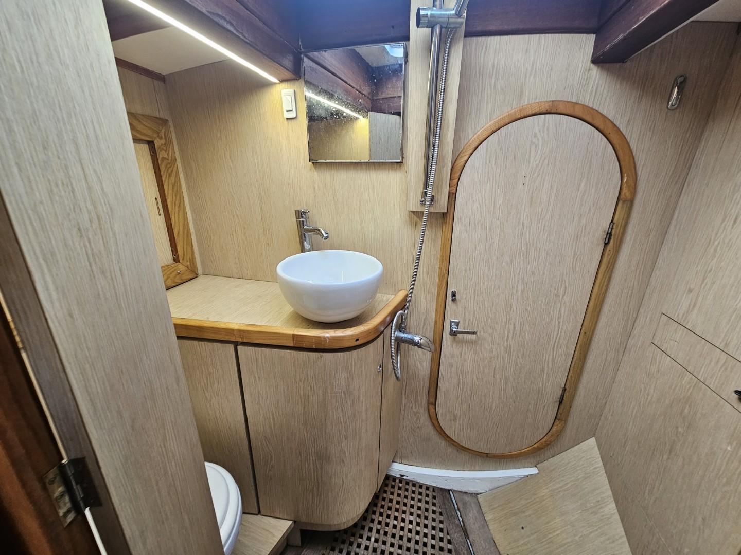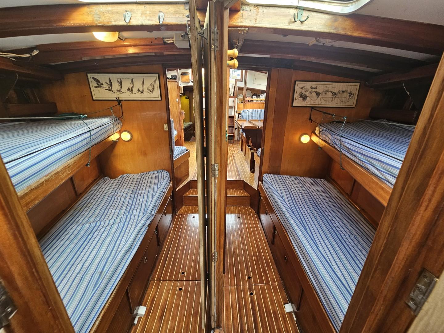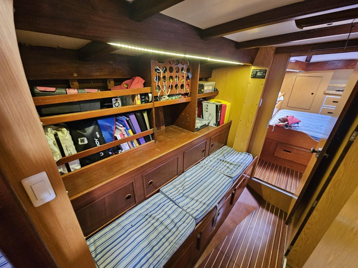 L’intérieur, entièrement en boiseries vernies, offre un confort rare pour un voilier de tradition : une cabine master centrale à la poupe avec lit double et salle d’eau privative, deux cabines avant avec lits superposés et salle d’eau commune, ainsi qu’un grand carré lumineux doté d’une table pour huit convives et d’une banquette supplémentaire. Le poste de navigation est équipé d’un GPS Furuno tactile récent, d’une VHF et d’une instrumentation complète.