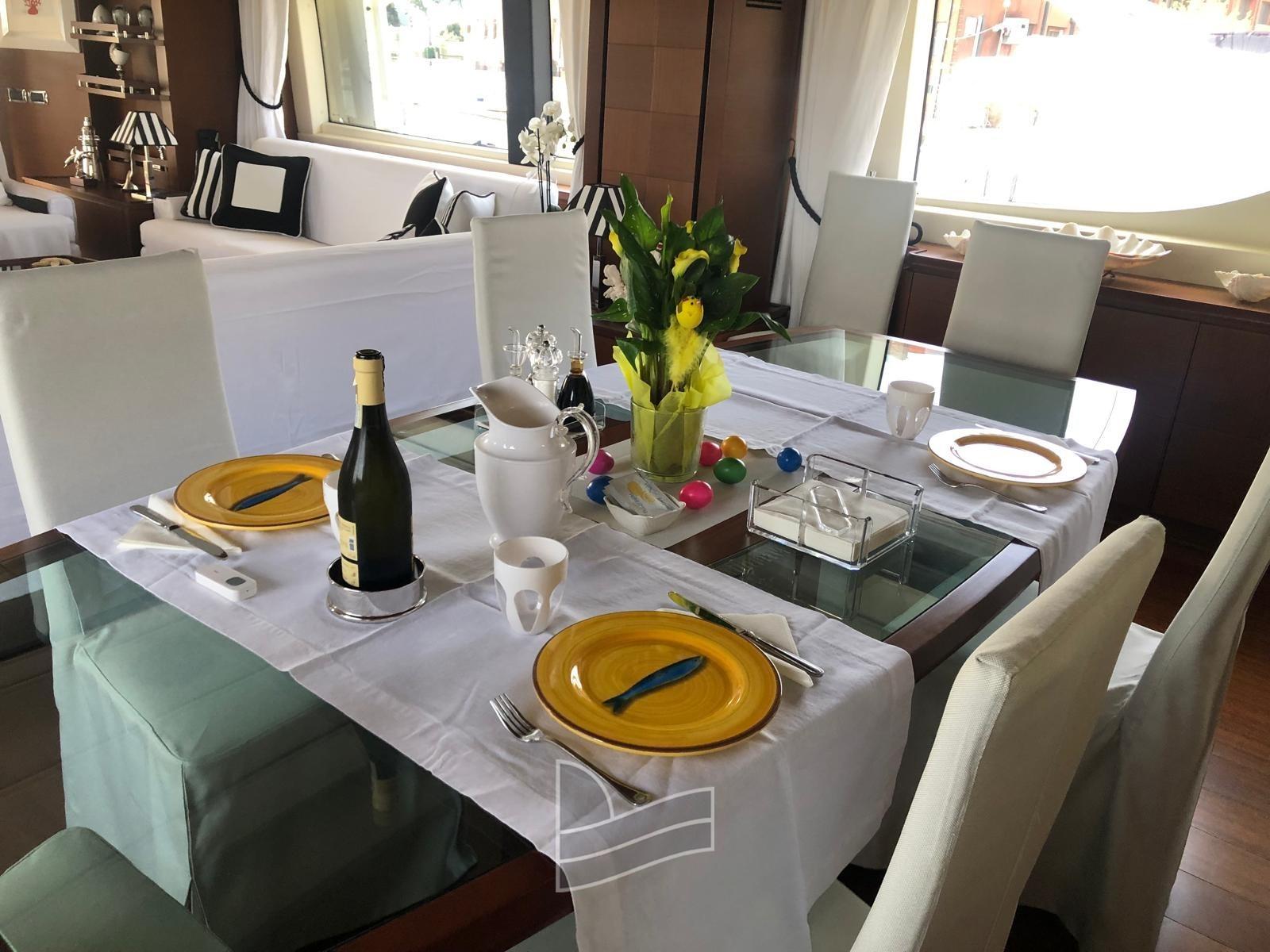 Le salon principal est spacieux et panoramique, avec un coin salon meublé de canapés et d’une table basse, suivi d’une salle à manger formelle pour huit à dix personnes. Les grandes fenêtres latérales garantissent un contact constant avec la mer et inondent les intérieurs de lumière naturelle.