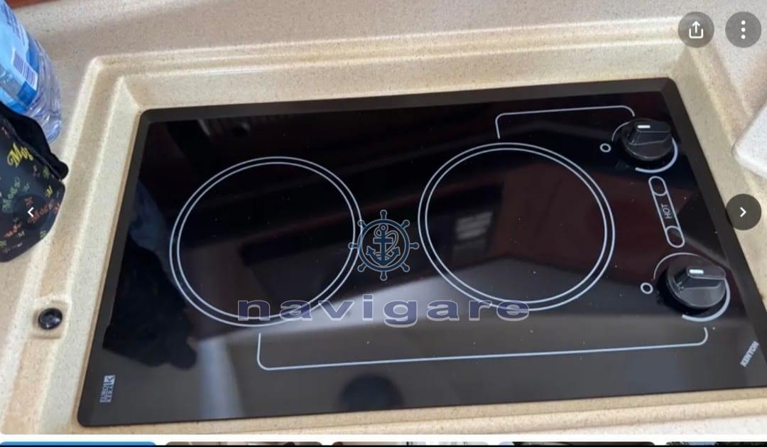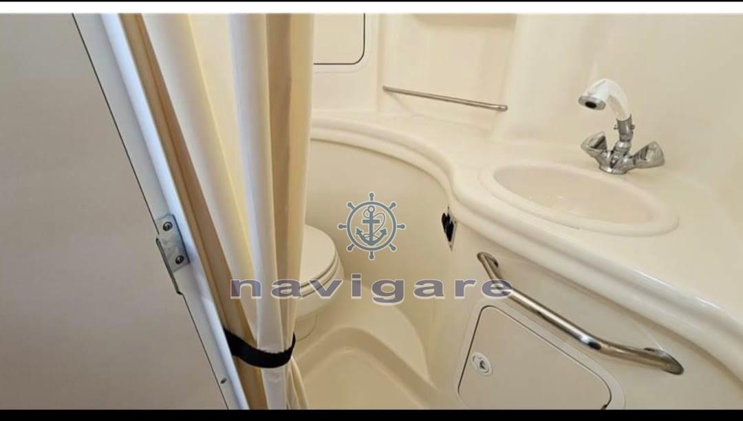 Alarme moteur, Alarme de pompe de cale, Eau sous pression, Flaps électriques, Éclairage de courtoisie, Défenses, Cockpit en teck, Prise de quai, Guindeau électrique, Echelle de bain.