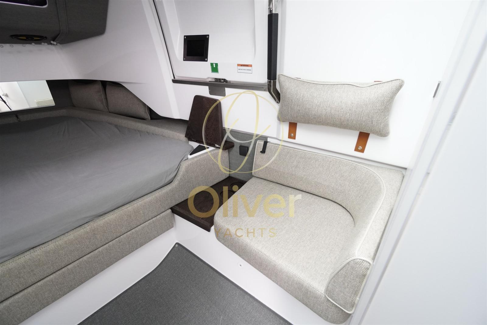 L’espace est étonnamment généreux pour un dayboat de cette catégorie : la couchette double offre de la place pour deux personnes et permet une utilisation pratique même pour des nuitées occasionnelles. L’environnement est lumineux grâce aux ouvertures latérales et aux matériaux sélectionnés, qui améliorent la perception de l’espace et maintiennent une sensation de qualité supérieure à bord.