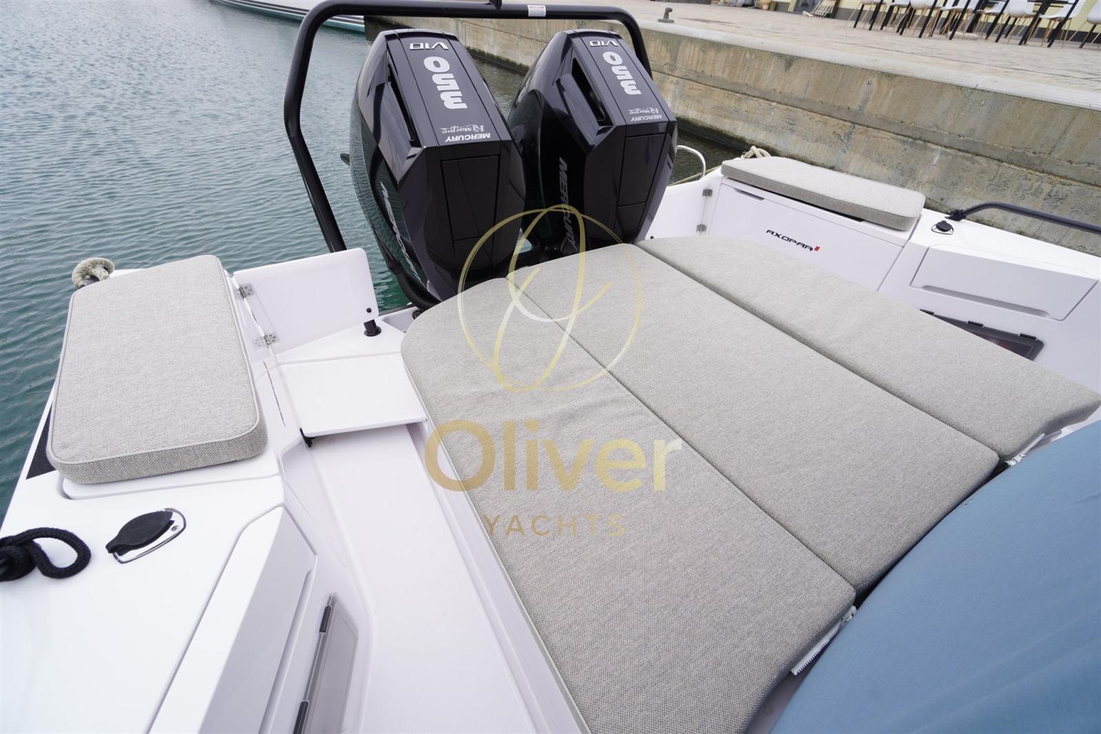 L’aménagement extérieur est développé conformément à la philosophie d’Axopar : un accès pratique, des allées sécurisées et des zones dédiées à la socialisation. À l’avant, vous trouverez un salon avec une table, parfait pour les déjeuners et la détente. La console de pilotage offre des sièges Brabus Line à haut niveau de confinement, un positionnement ergonomique et un tableau de bord moderne avec traceur de cartes Simrad et système audio intégré.