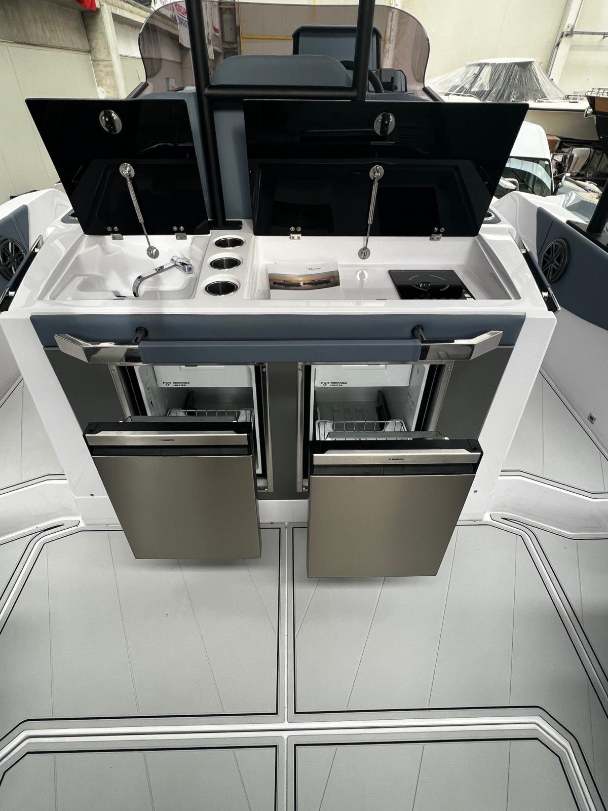 Ranieri 330 LX de 2026 avec deux Honda BF 300 V8 White, confortable et très habitable pour 4 personnes, la cabine/la zone de couchage. Cette unité prête à la livraison a été entièrement équipée en option complète et budgétée avec le double moteur HONDA BF 300 V 8 White. Cabine d’invité décapotable et salle à manger avant ; Toilettes électriques avec lavabo dans une pièce séparée / réservoir d’eaux usées, tissu de luxe, 8 hublots, radio stéréo avec 6 haut-parleurs, pont arrière électrique à l’arrière.
