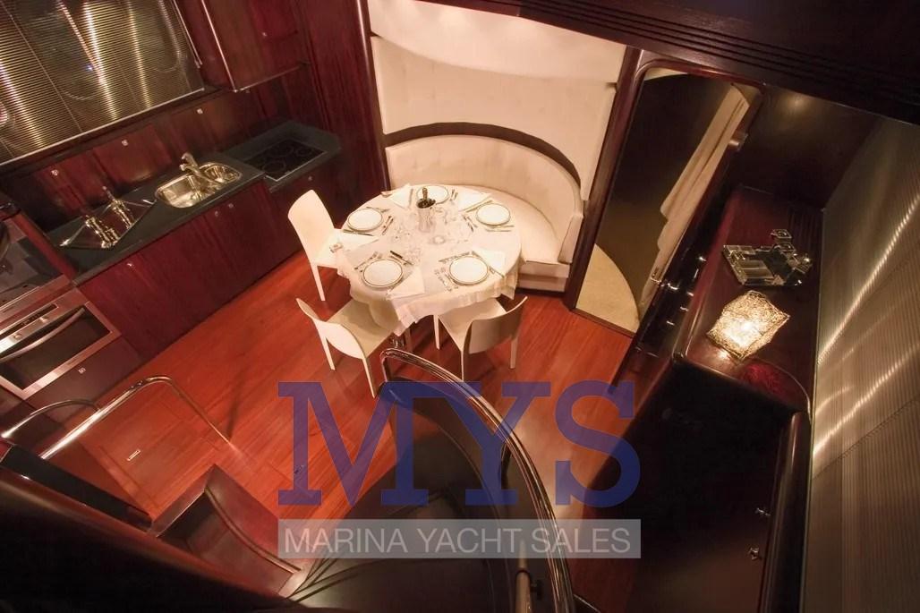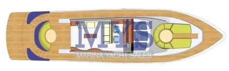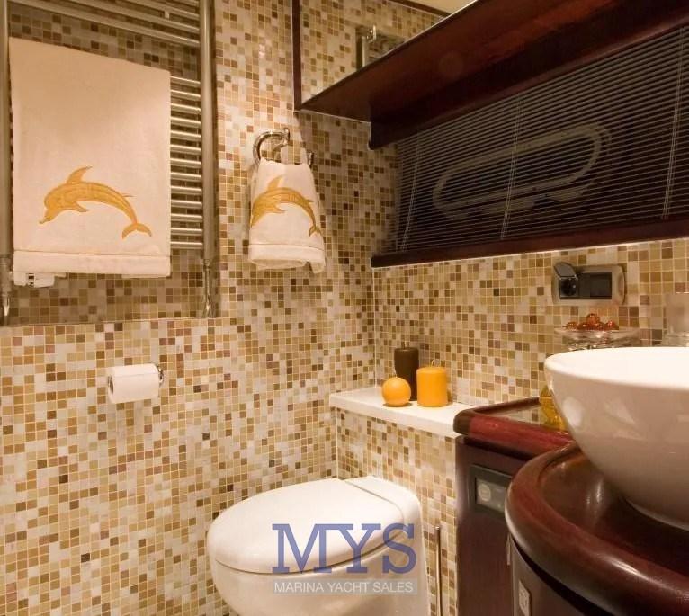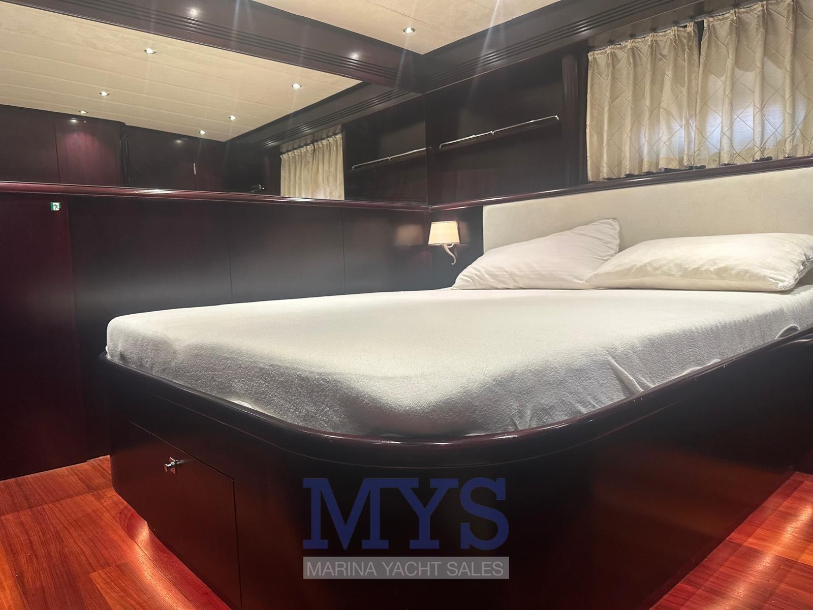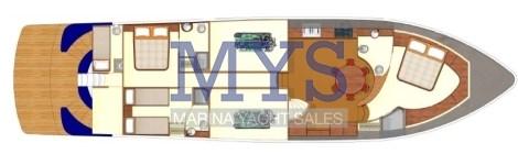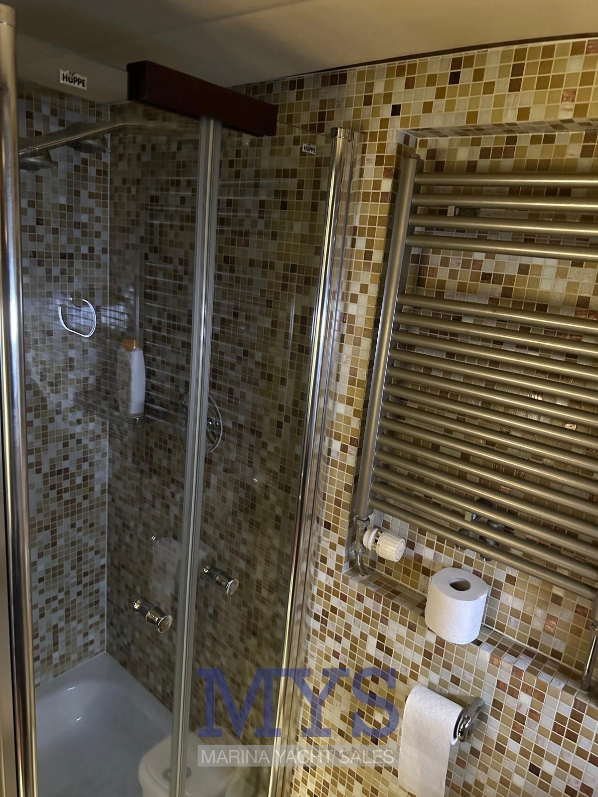 Cabine principale descendant les marches avant avec salle de bain avec bidet et cabine de douche séparée, cabine VIP pour invités avec lit double à l’arrière, cabine avec 2 lits séparés au sol plus un lit pullman, 3 salles de bains, logement pour l’équipage avec accès séparé depuis la plateforme arrière avec salle de bain.