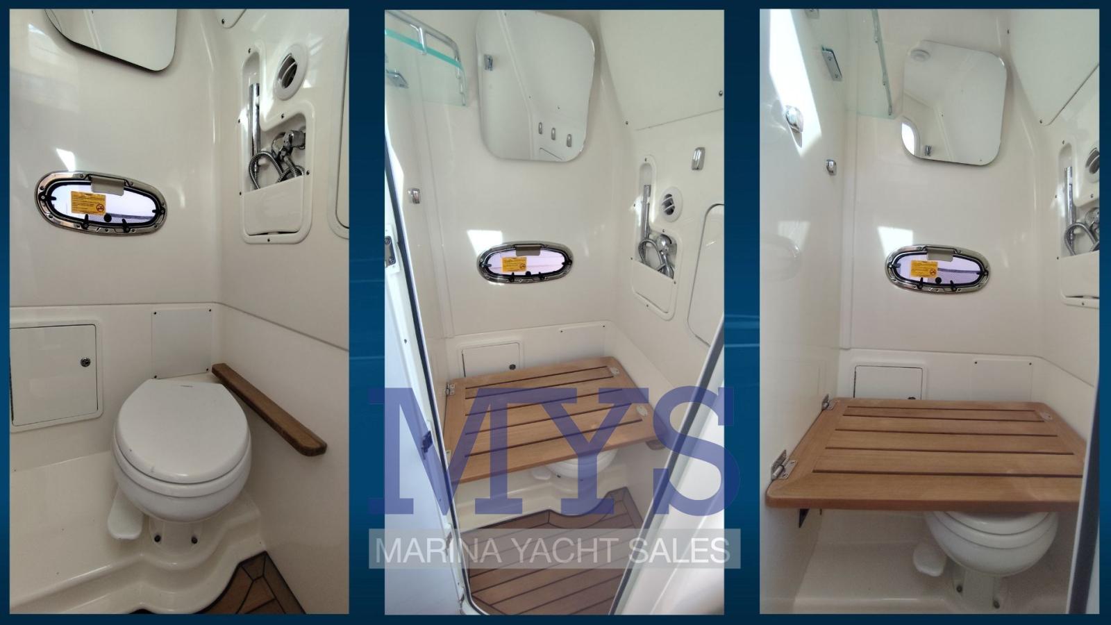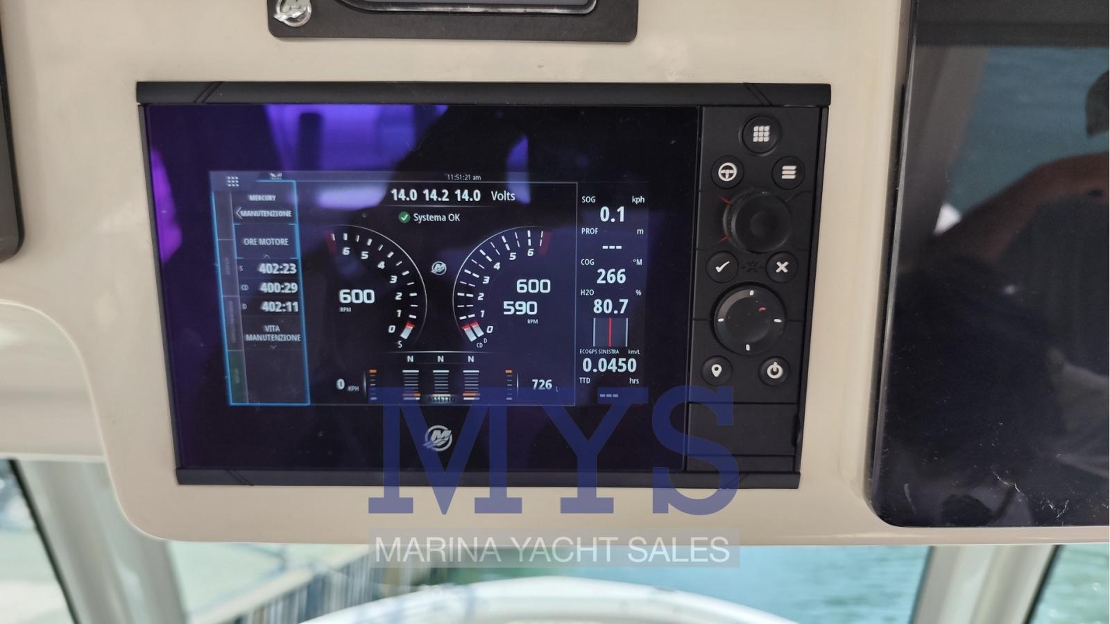Alarme moteur, Alarme de pompe de cale, Auto Dynamic Trim Interceptor, Eau sous pression, 6 Batteries (3xmotore 1x generatore 2x servizi AGM 140 Ah), Taquets pliants, 2 Douche de cockpit (a poppa), Phare de poursuite, Flaps électriques, Extincteur(s) fixe(s), Indicateurs de flaps, Lavage de chaine, Lavabo dans le cockpit, Éclairage de courtoisie, Panneau solaire (Solbian 130 amp. + caricabatterie Vitron), 3 Pompe de cale automatique, Prise de quai, Connexion eau sous pression à quai, Onduleur, Guindeau électrique, Echelle de bain, table de cockpit, T-Top.