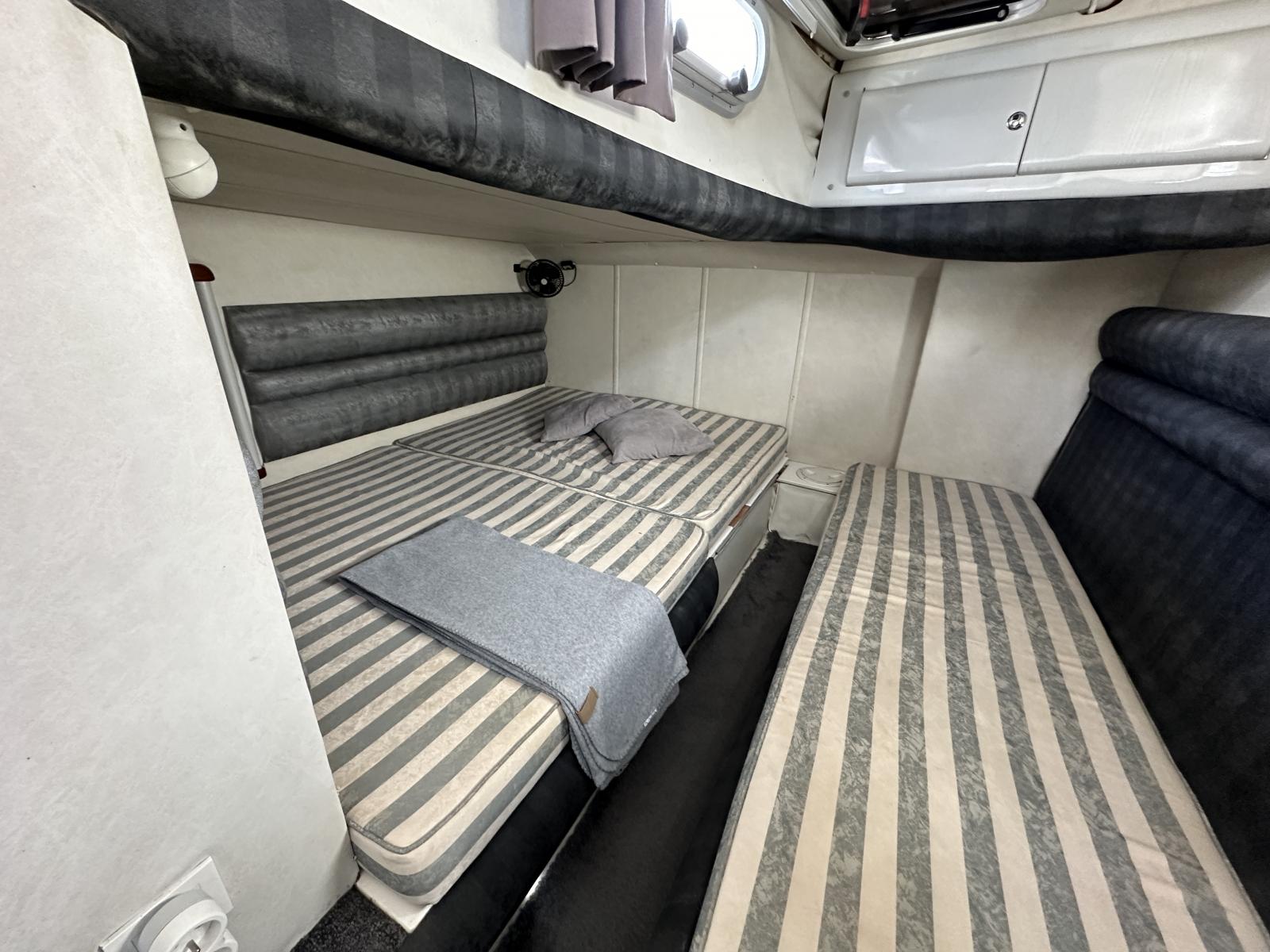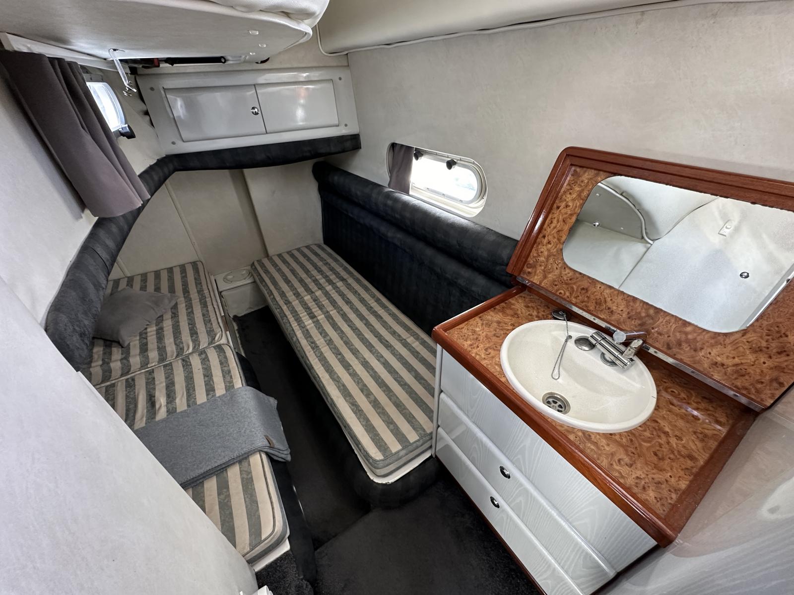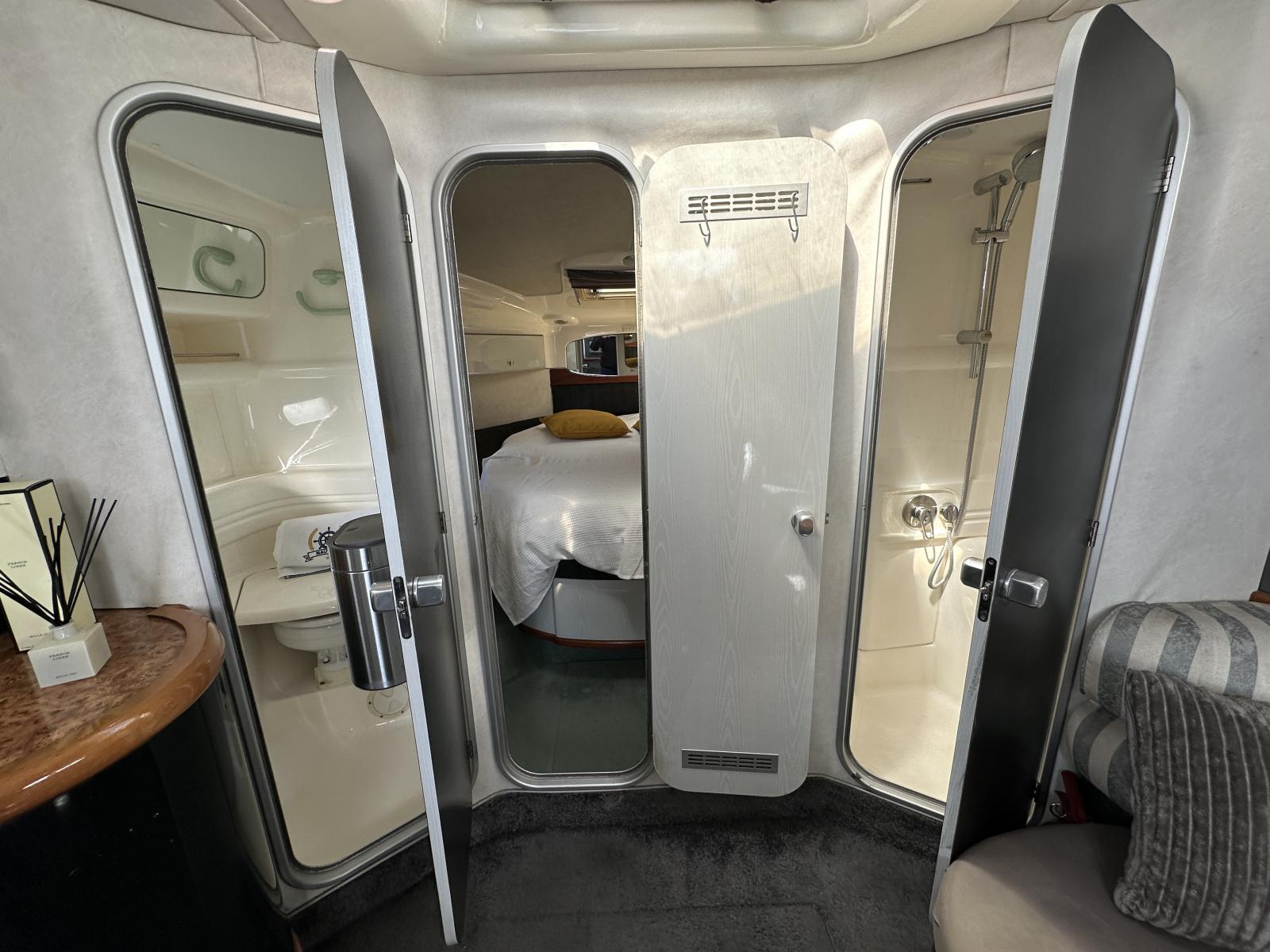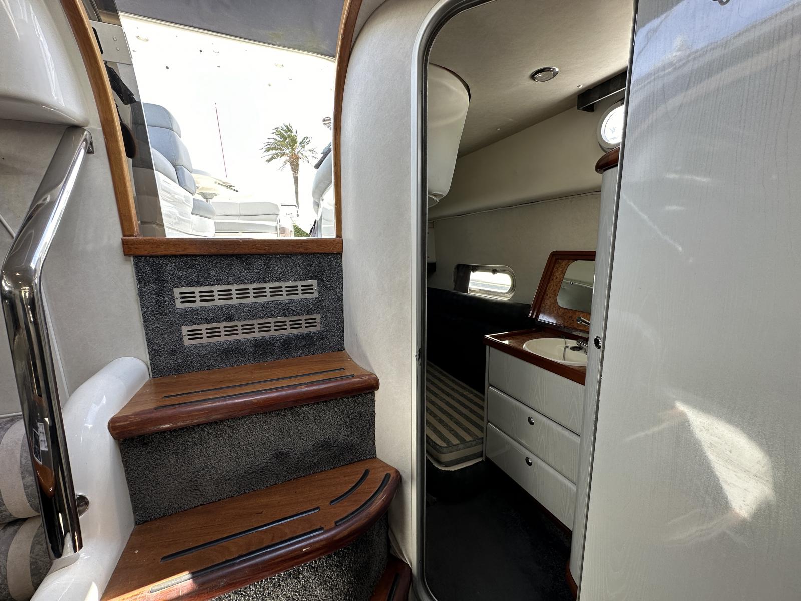 A l’intérieur deux cabines bien agrábles, la master avec sa 3ème couchette/canapé et son petit coin lavabo et la cabine invité à l’avant avec salle d’eau et coin WC lavabo séparé “en-suite”. On aime sa ligne intemporelle, les commandes électroniques et l’électronique de navigation, les moteurs reconditionnés, la coque en V profond, sa platefrome en teck rallongée et la passerelle hydraulique, les selleries, le carré intérieur convertible en couchette double et le coin cuisine très complet.