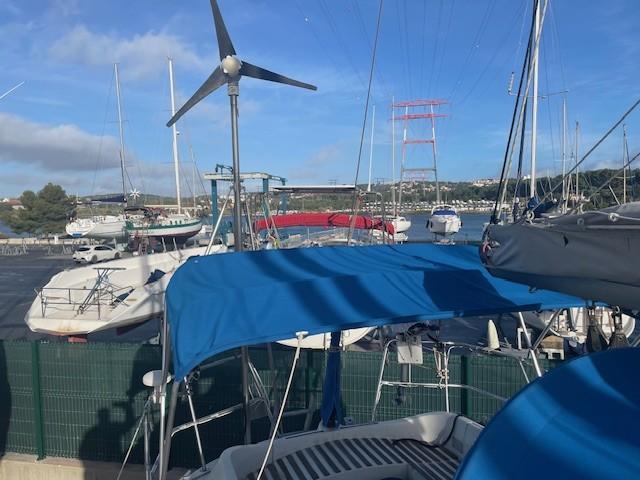 Balise de détresse KANNAD EPIRB 2013 (à vérifier) ; douchette de cockpit, échelle de bain, éolienne AIR BREEZE 3 pales.