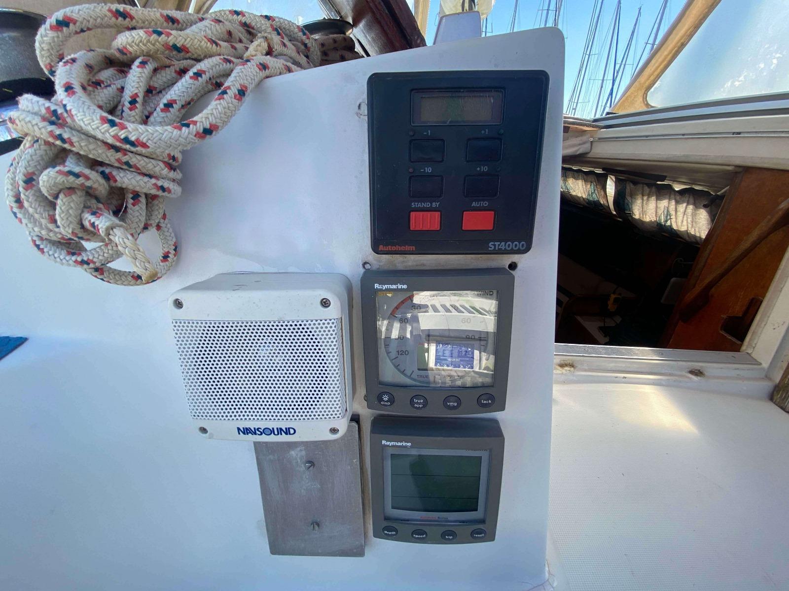 Radio ASN, GPS traceur, GPS portable, NAVTEX, Anémomètre, Lock sondeur Raymarine, Pilote automatique Raymarine ST 4000, TV couleur