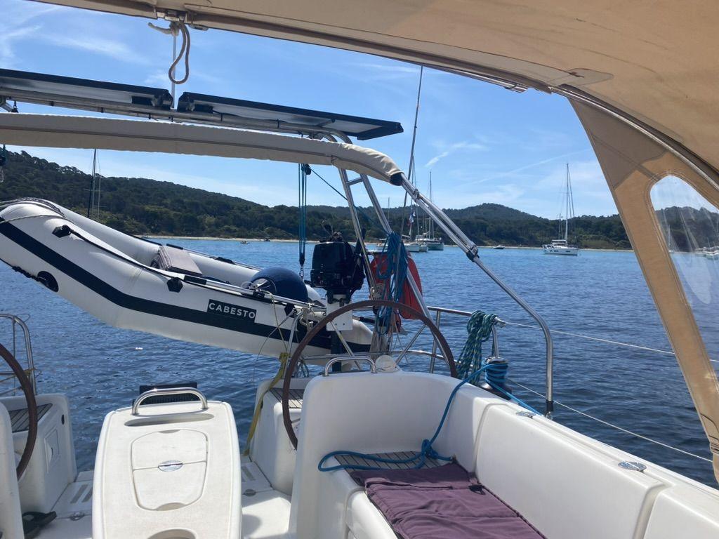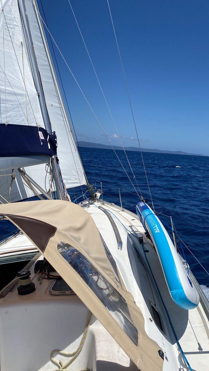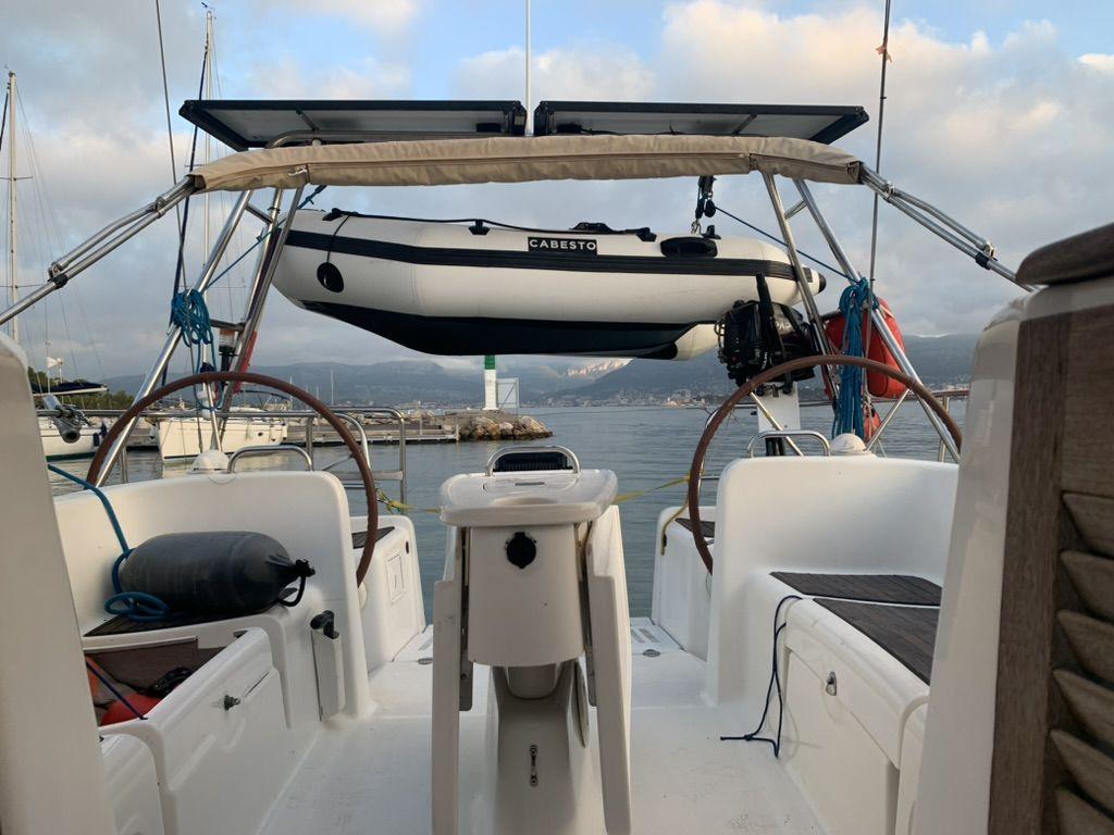 Autonome en énergie avec son portique inox et ses 370w panneaux solaires, gréement dormant (2023), grand voile triradiale (2023), il est prêt pour un Tour de MED.
