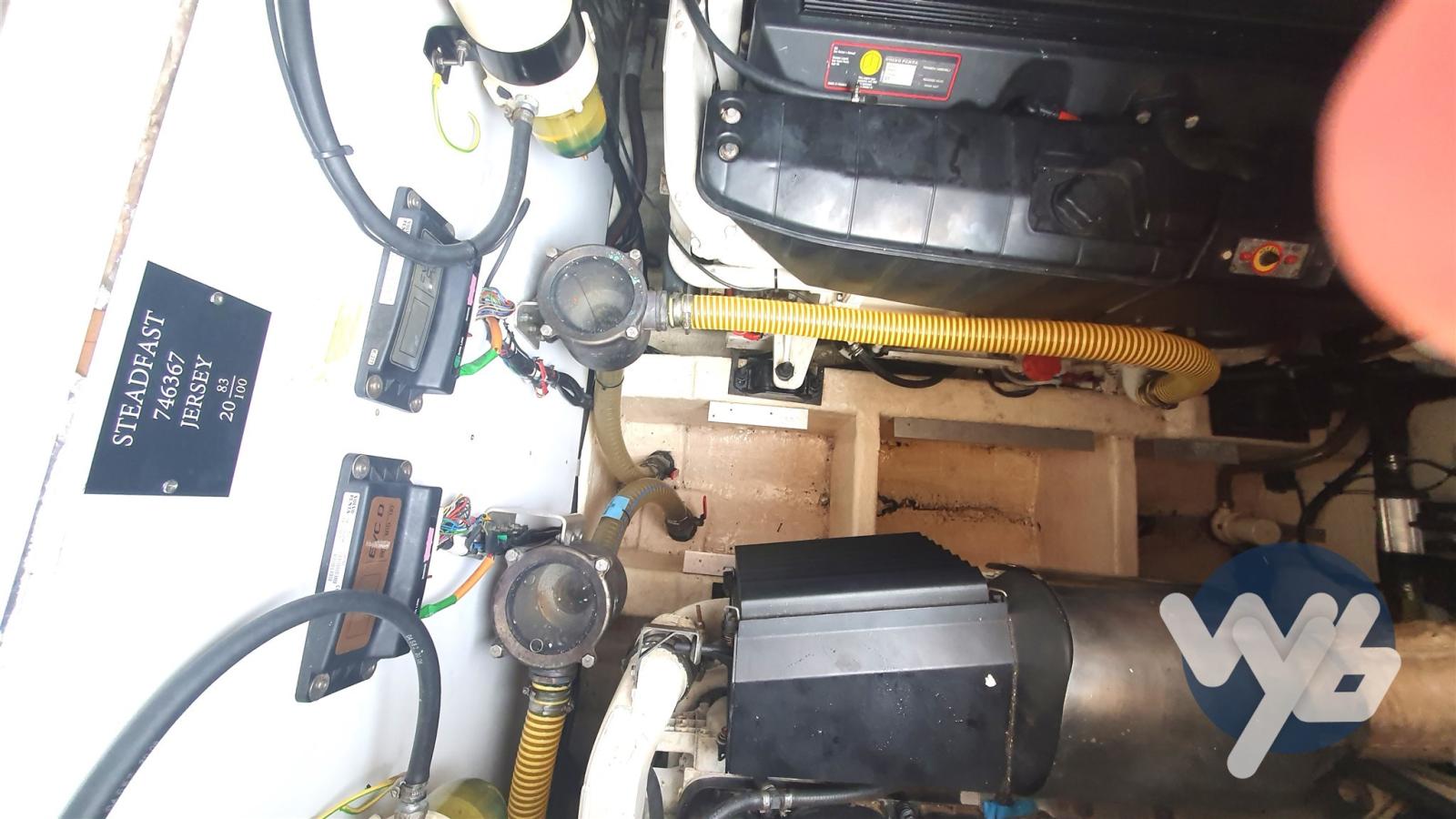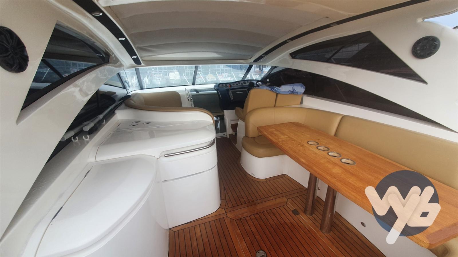 Alarme moteur, Alarme de pompe de cale, Eau sous pression, 5 Batteries, Douche de cockpit, Phare de poursuite, Flaps électriques, Garage à annexe, Extincteur(s) fixe(s), Passerelle, Pompe de cale manuelle, Porte latérale, Cockpit en teck, Prise de quai, Rollbar, Guindeau électrique, Echelle de bain.