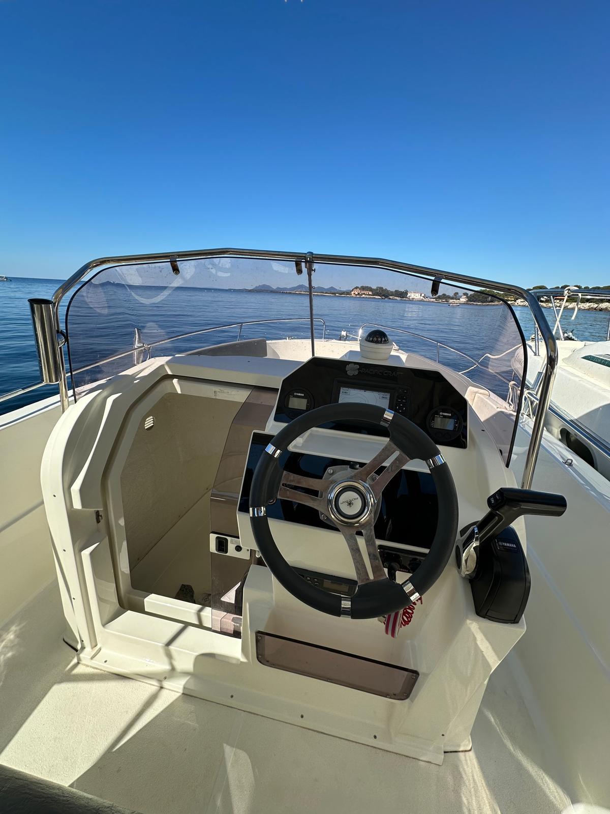 Pour le confort et la sécurité, il est équipé d’un bimini, d’un sondeur GPS Garmin et d’une direction hydraulique qui assure une navigation fluide et agréable. L’armement de sécurité est complet, prêt à l’emploi.