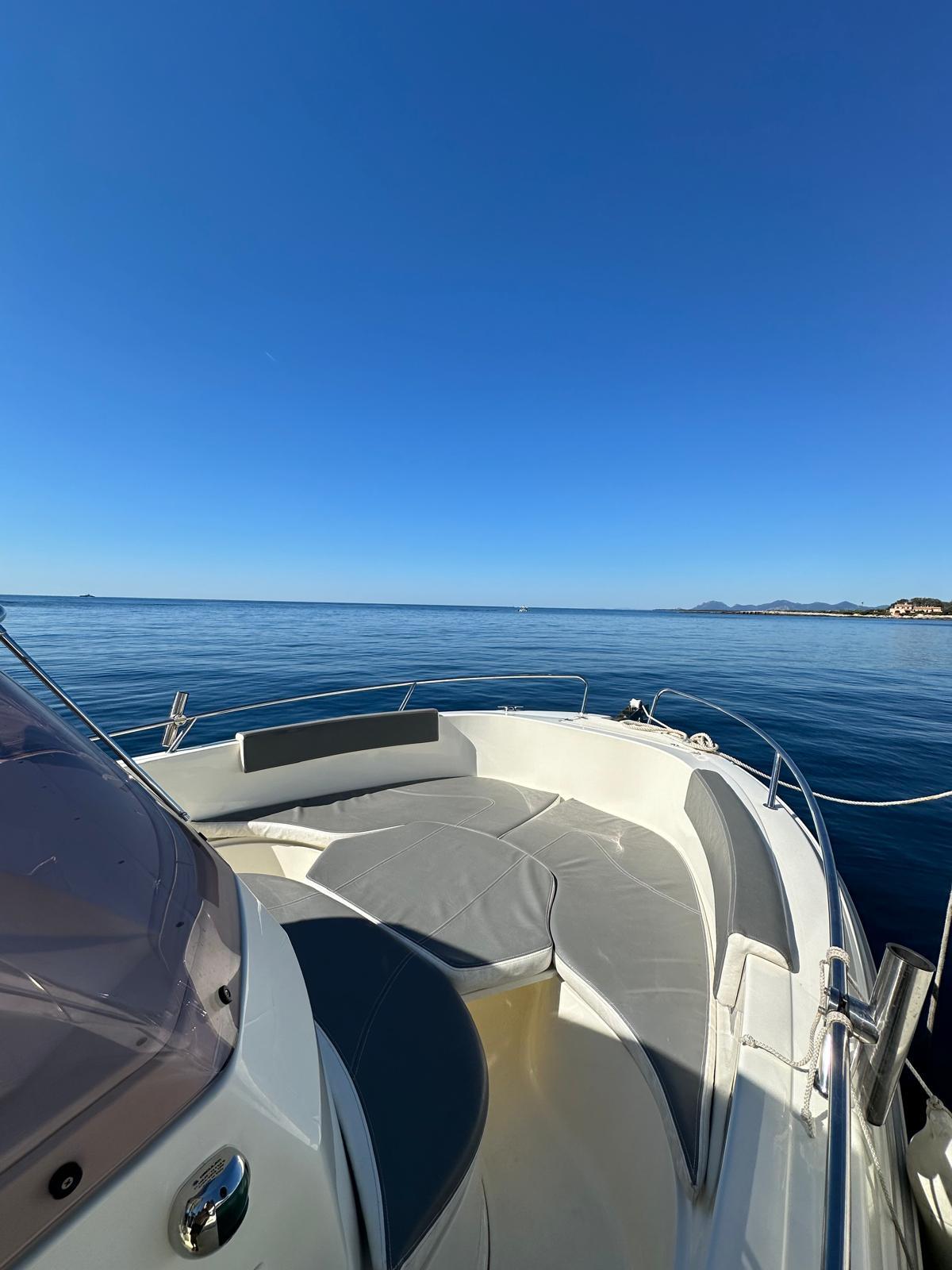 Le bateau est doté d’une console haute avec rangements, d’une banquette arrière accueillante, d’une échelle de bain facilitant l’accès à l’eau, ainsi que d’une pompe de cale automatique.