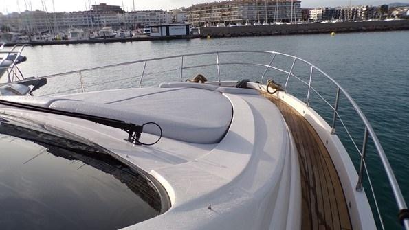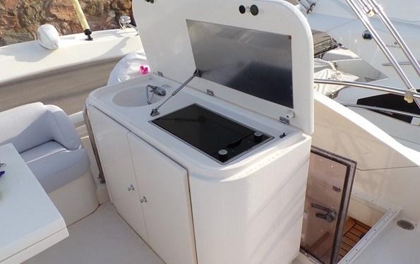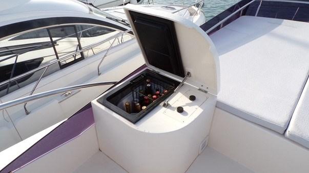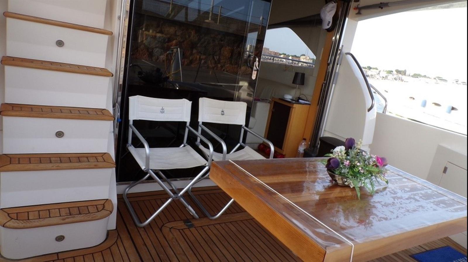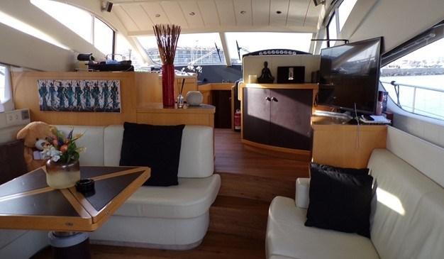 La table à manger et la cabine de l’équipage sont situées dans le cockpit. Dans la proue, il y a une terrasse ensoleillée avec des sièges. Sur le flybridge est