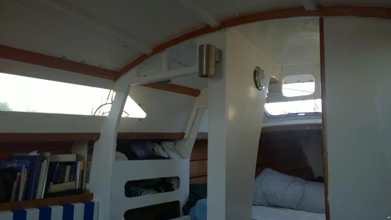 THEA est une voiture moderne (1980 !) Construction en bois cauris/époxy, peau extérieure déjà recouverte de fibre de verre/époxy lors de la construction - construite en Nouvelle-Zélande. Nouveau mât Selden 2012, foc autovireur Elvström 2017, manufacture de voiles brutes lattes 2020 (grosse tête - arbre raccourci en support targa), transpondeur AIS. Gouvernail partiellement équilibré (fait maison selon Nissen crack), intérieur comme neuf changé en 2015. Targabügel - écoute de grand-voile allemande.
