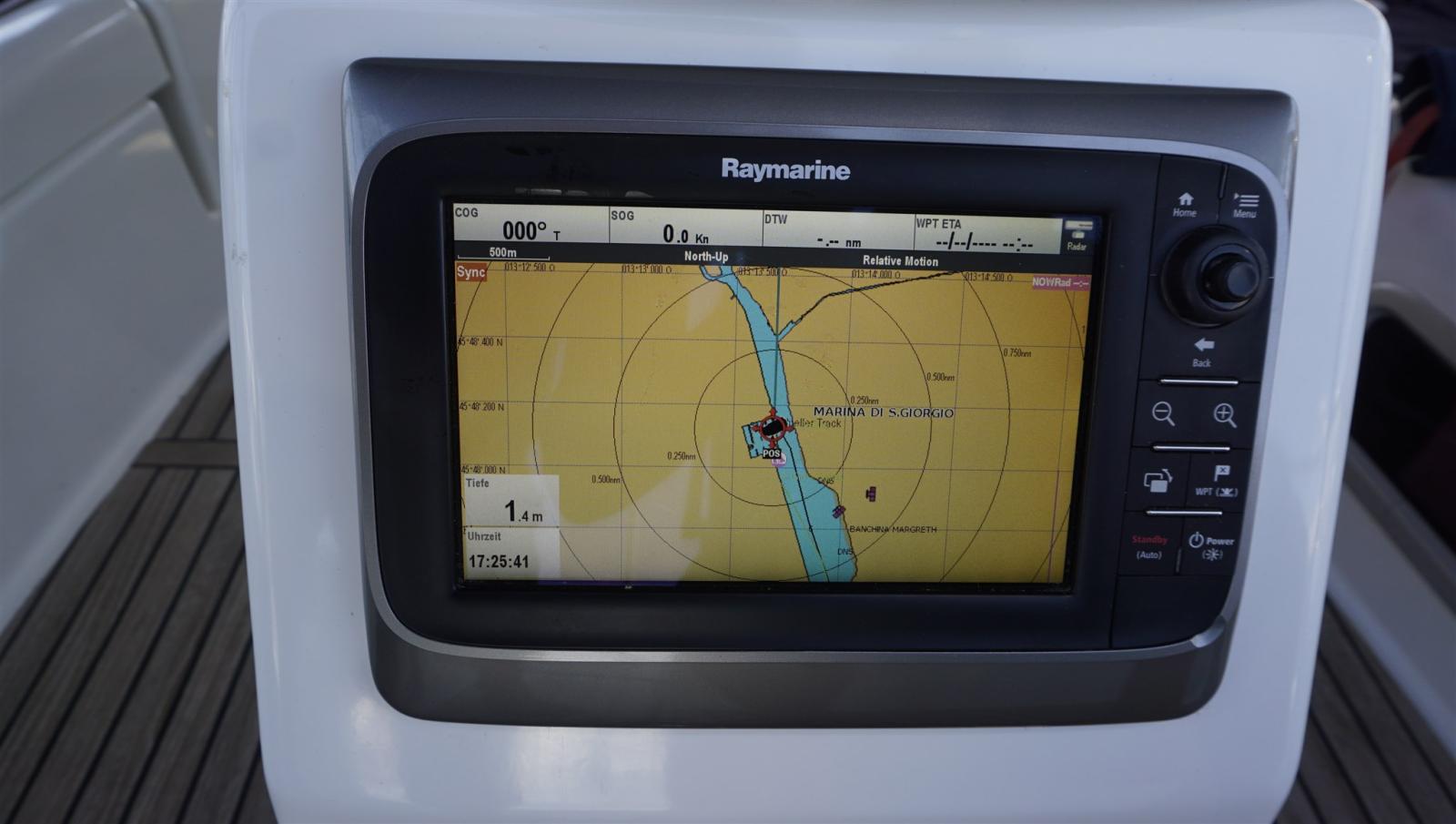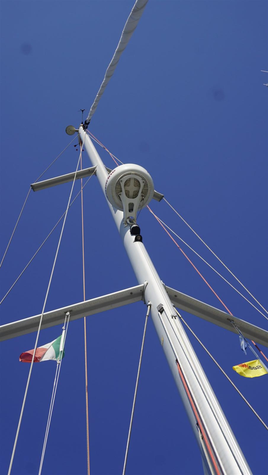 AIS (class B 650 + splitter), Indicateur d'angle de barre, Antenne radar (color radom), Loch (RAYMARINE i70), Moniteur, DSC VHF (RAYMARINE 52), MeteoFax (NAVTEX ICS 6), Lecteur de cartes (RAYMARINE C95), Radar (RAYMARINE), Radio VHF (IC M91D portable), Anémomètre/Girouette (RAYMARINE i70).