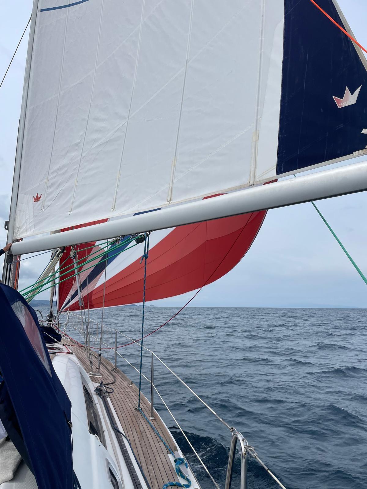 grand-voile 2025 triradiale DP avec lattes verticales, genoa 2025 avec bande en mousse et protection UV, Genaker avec gaine 2015,