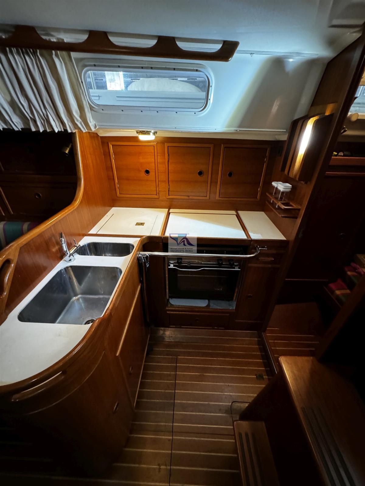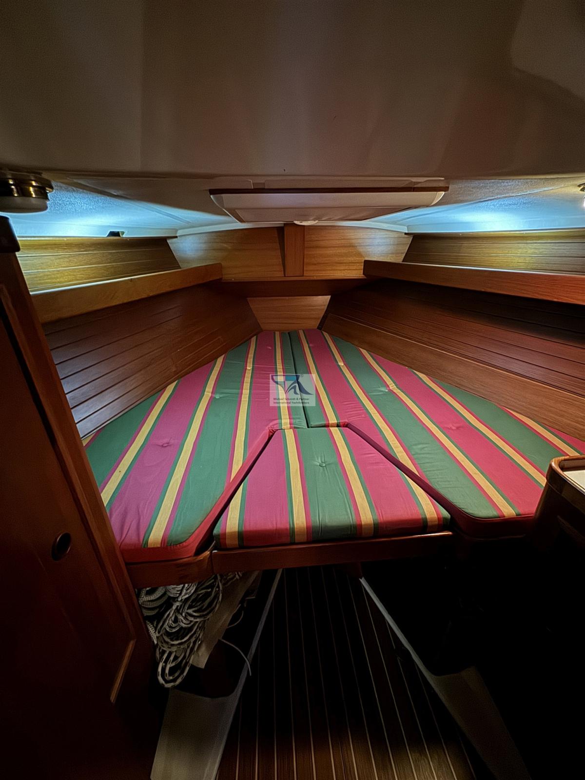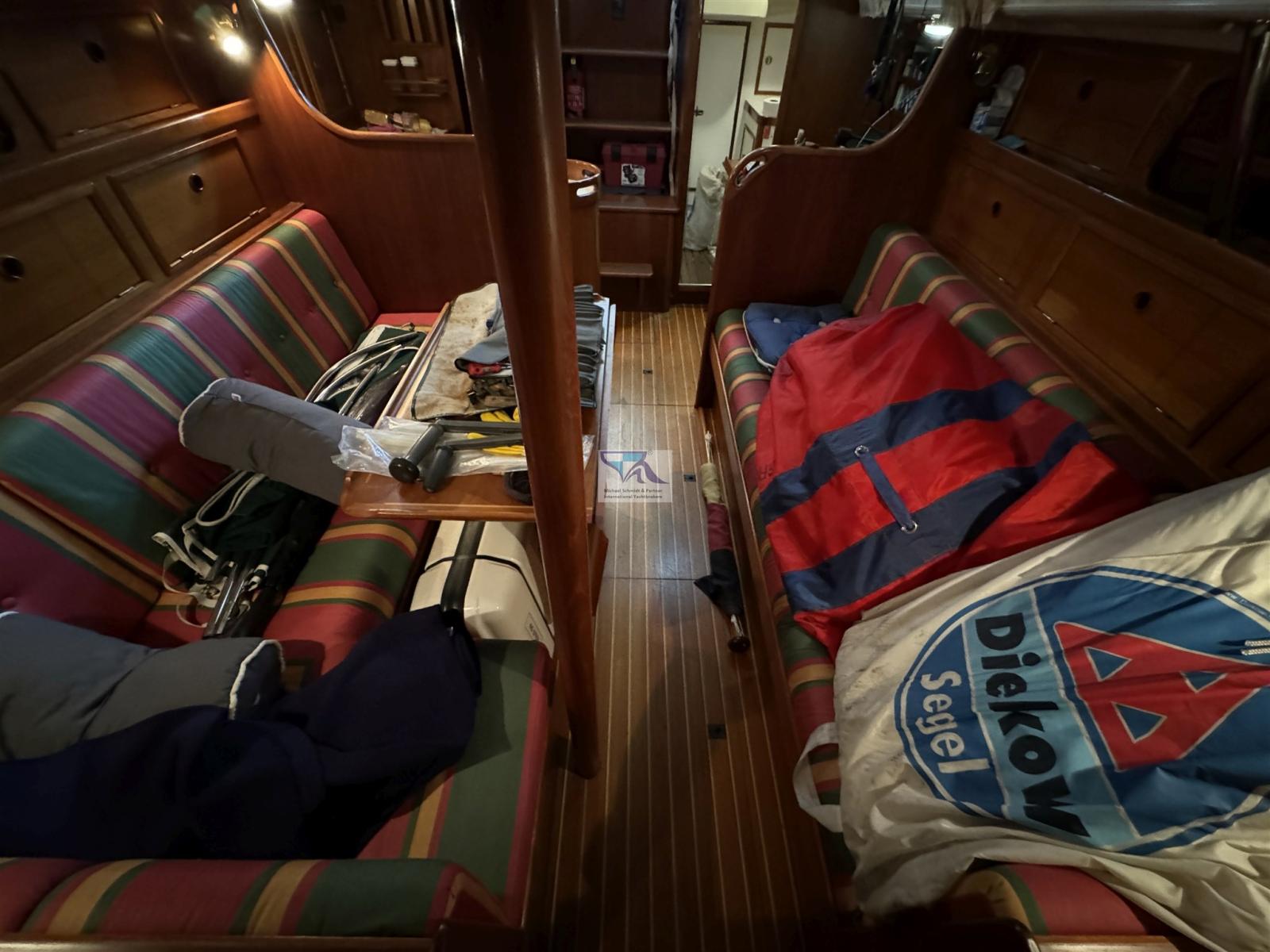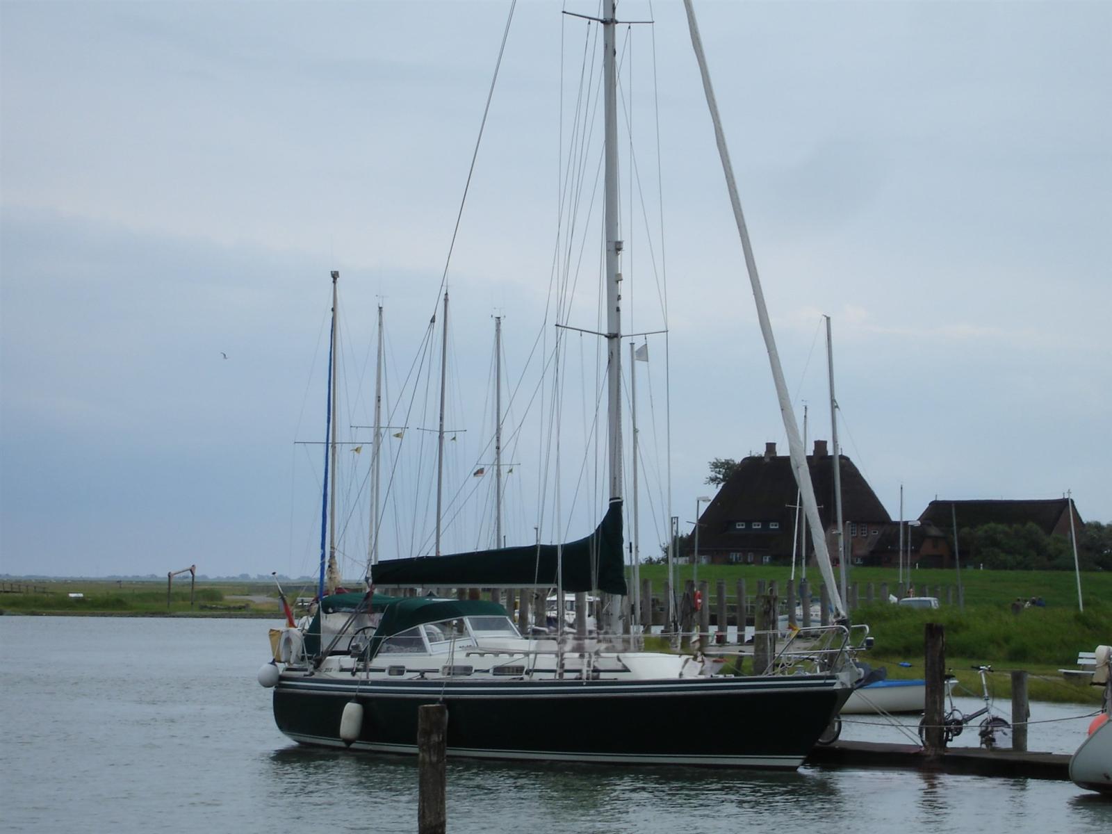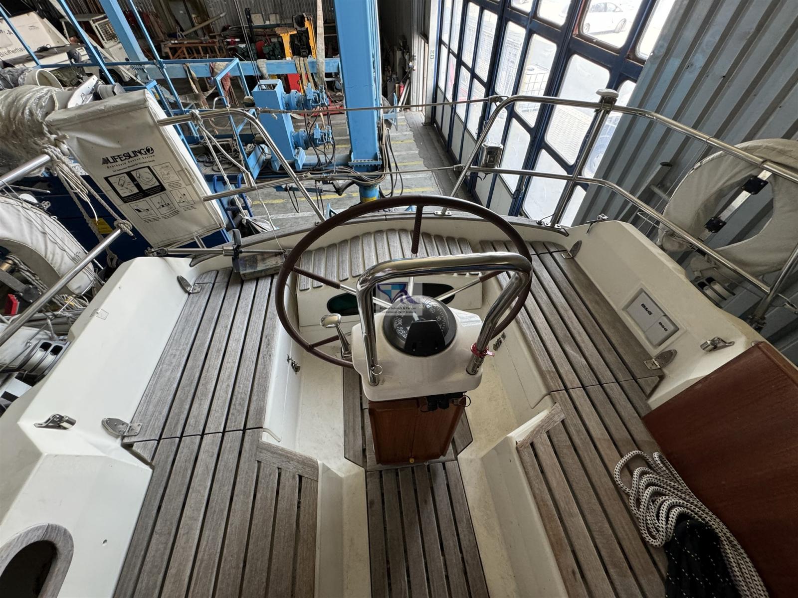 Ancre (Delta), Enrouleur pour cable électrique, 3 Batteries (Vetus, insgesamt 330 Ah), Passavant en teck, Chargeur de batterie (Victron 25A), Pompe de cale manuelle, Cockpit en teck, Prise de quai, Connexion eau sous pression à quai, Guindeau électrique (Maxwell vert.Ankerwinde mit Spill, RC10-8), Echelle de bain, table de cockpit, 2 Filières avec sortie latèrale, Pont en teck, Winch électrique avant, Windex.