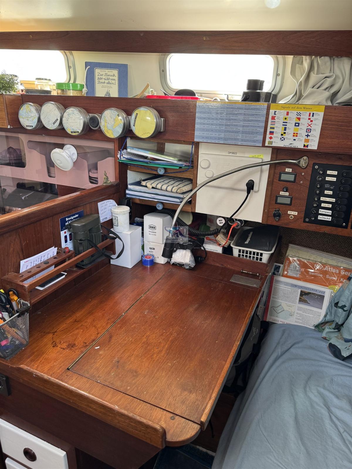 Alarme gaz (Gasspürgerät), Ancre (und 30m Kette), Eau sous pression, 2 Batteries (Exide Dual AGM 180 Ah EP1500 - Neu 2023), Chargeur de batterie (Voltmaster), Cockpit en teck, Prise de quai (Landstromsteckdose Neu), Guindeau manuel (Lofrans Royal 005808), Gréement monotoron (Neu 2016), Echelle de bain, table de cockpit.