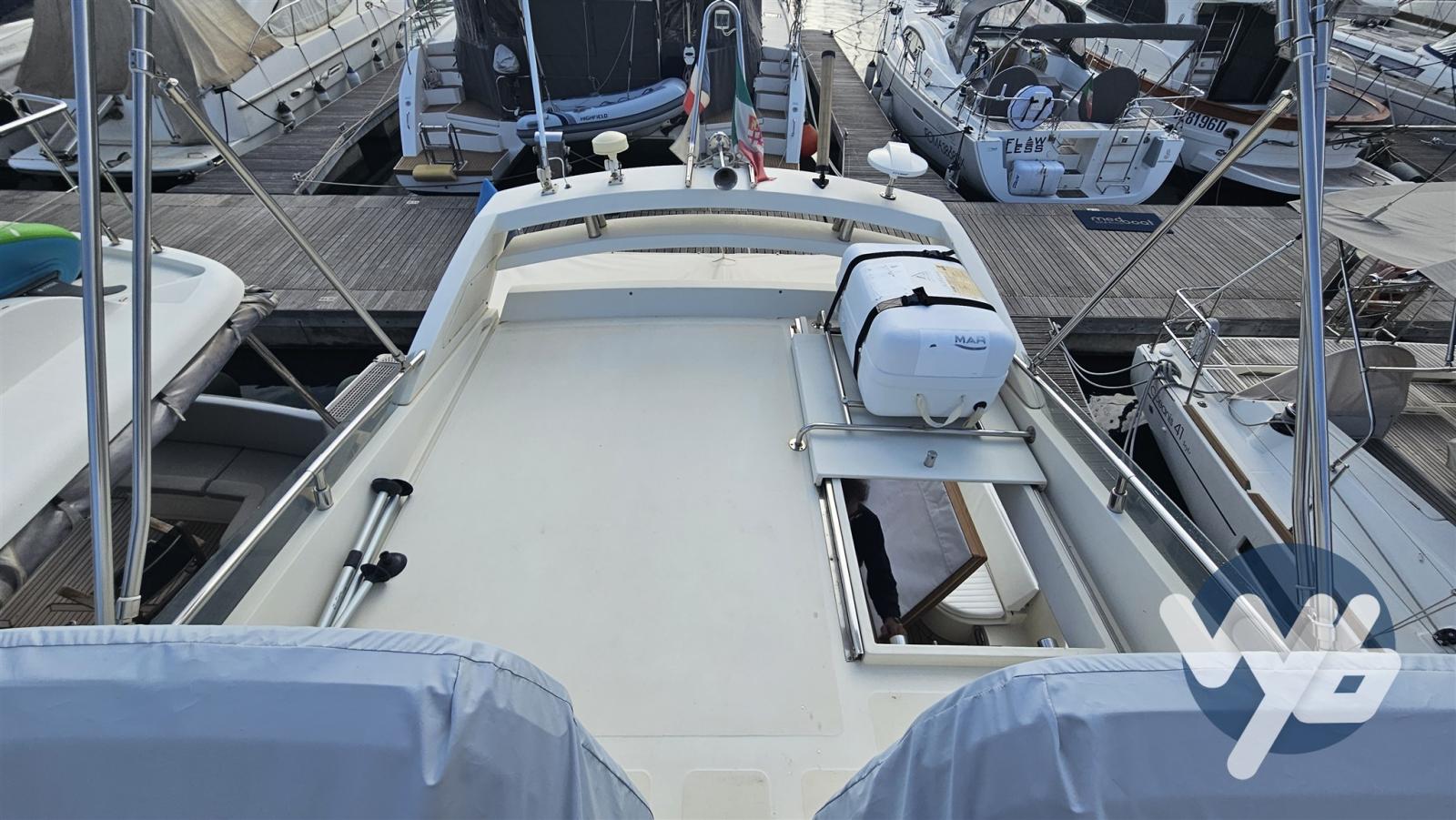 Alarme moteur, Alarme de pompe de cale, Eau sous pression, Douche de cockpit, Double barre à roue, Flaps hydrauliques, Passerelle, Pompe de cale manuelle, Porte latérale, Cockpit en teck, Prise de quai, Connexion eau sous pression à quai, Guindeau électrique, Echelle de bain, Annexe.