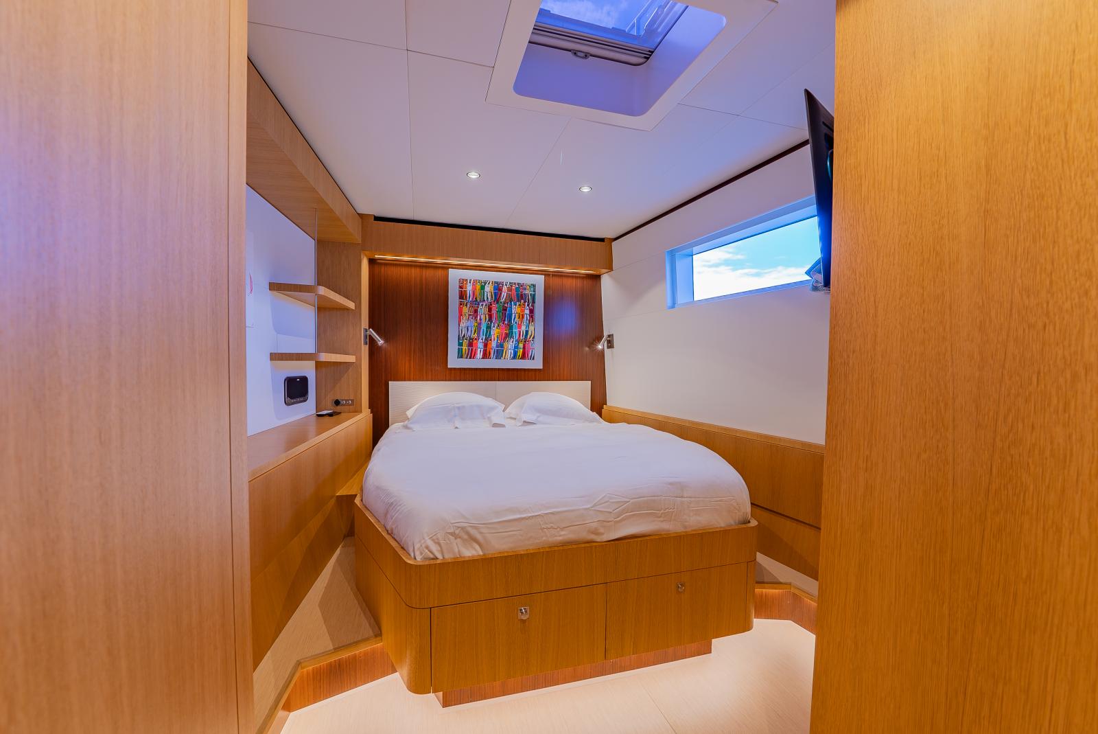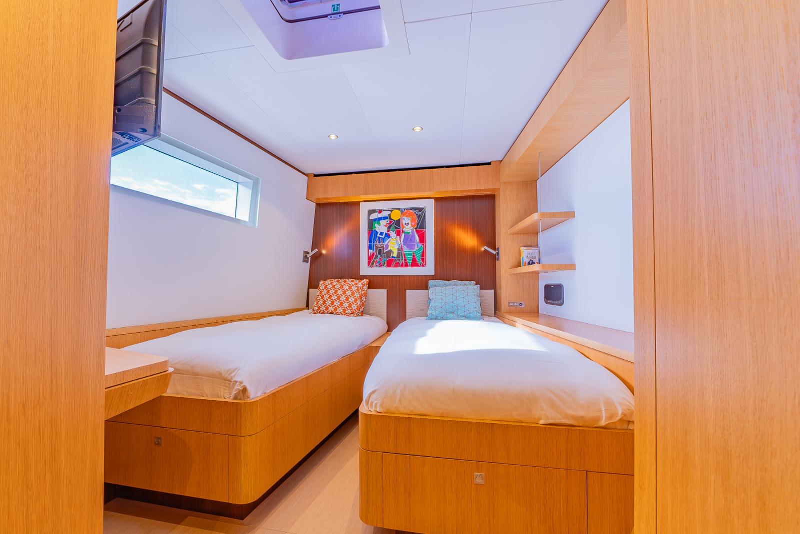 La coque bâbord accueille une suite armateur spacieuse et une cabine d’invité, tandis que la coque tribord comprend trois cabines d’invités supplémentaires.