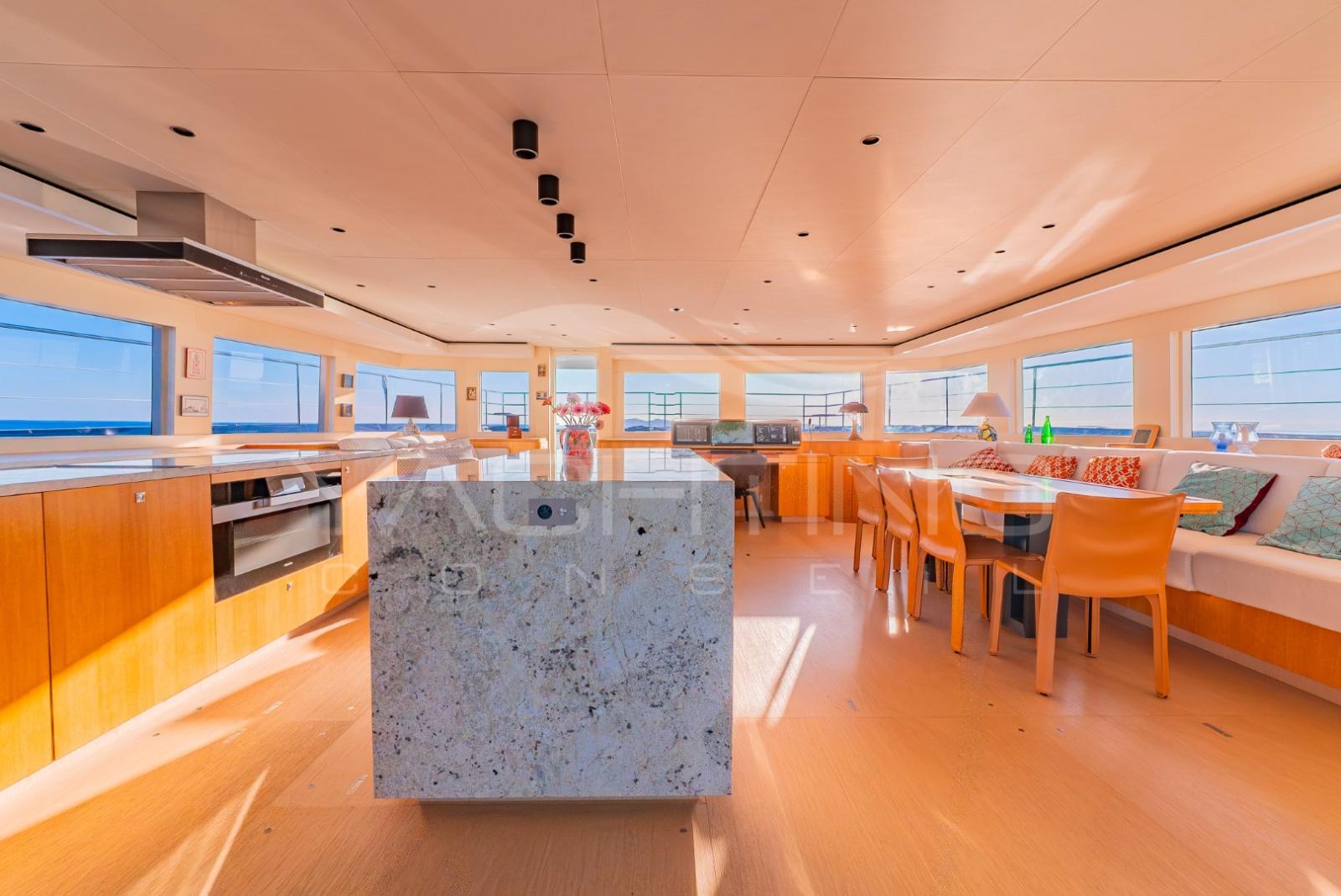 La nacelle centrale abrite un vaste salon, une salle à manger, une cuisine équipée et une table à cartes.