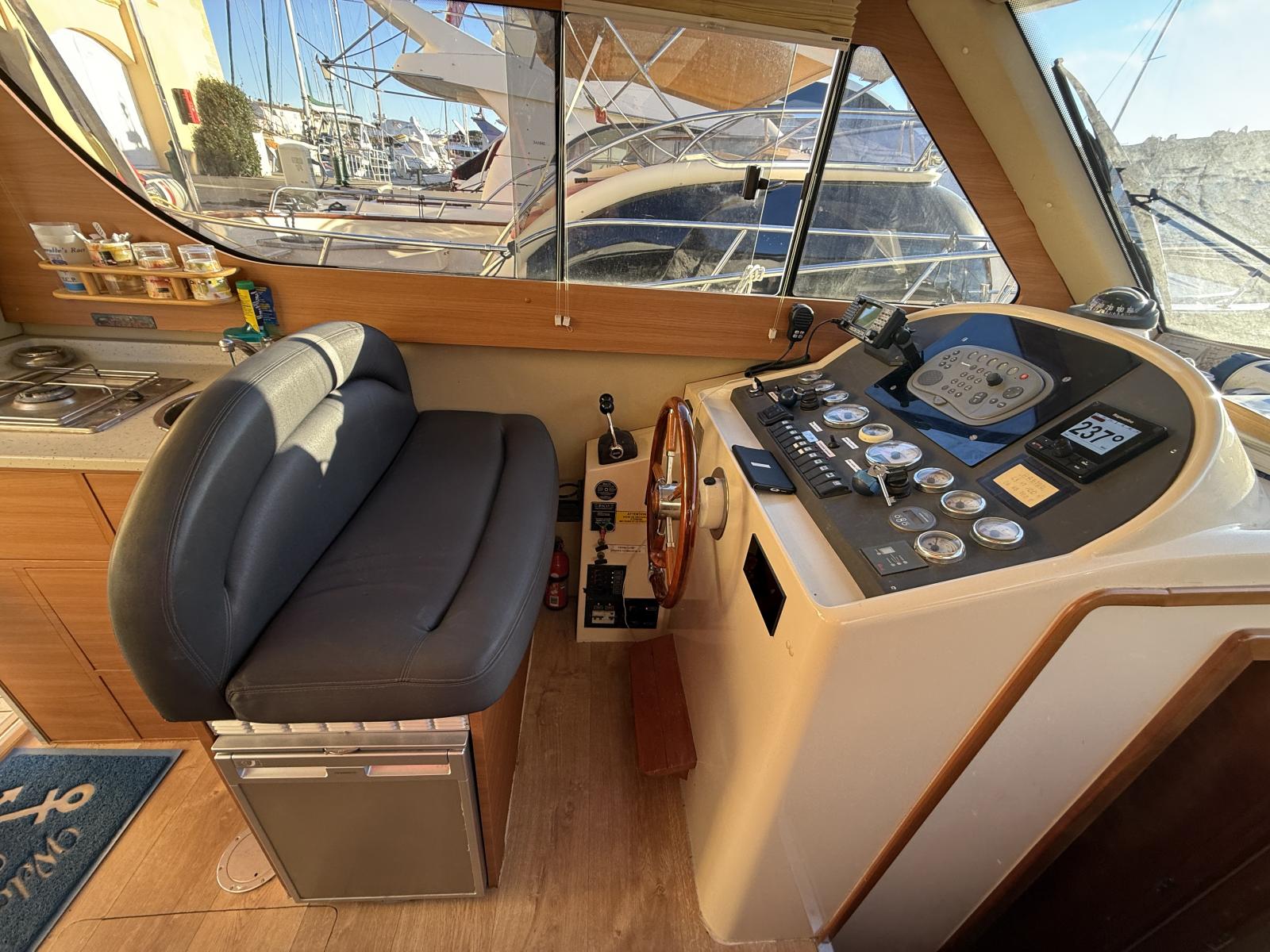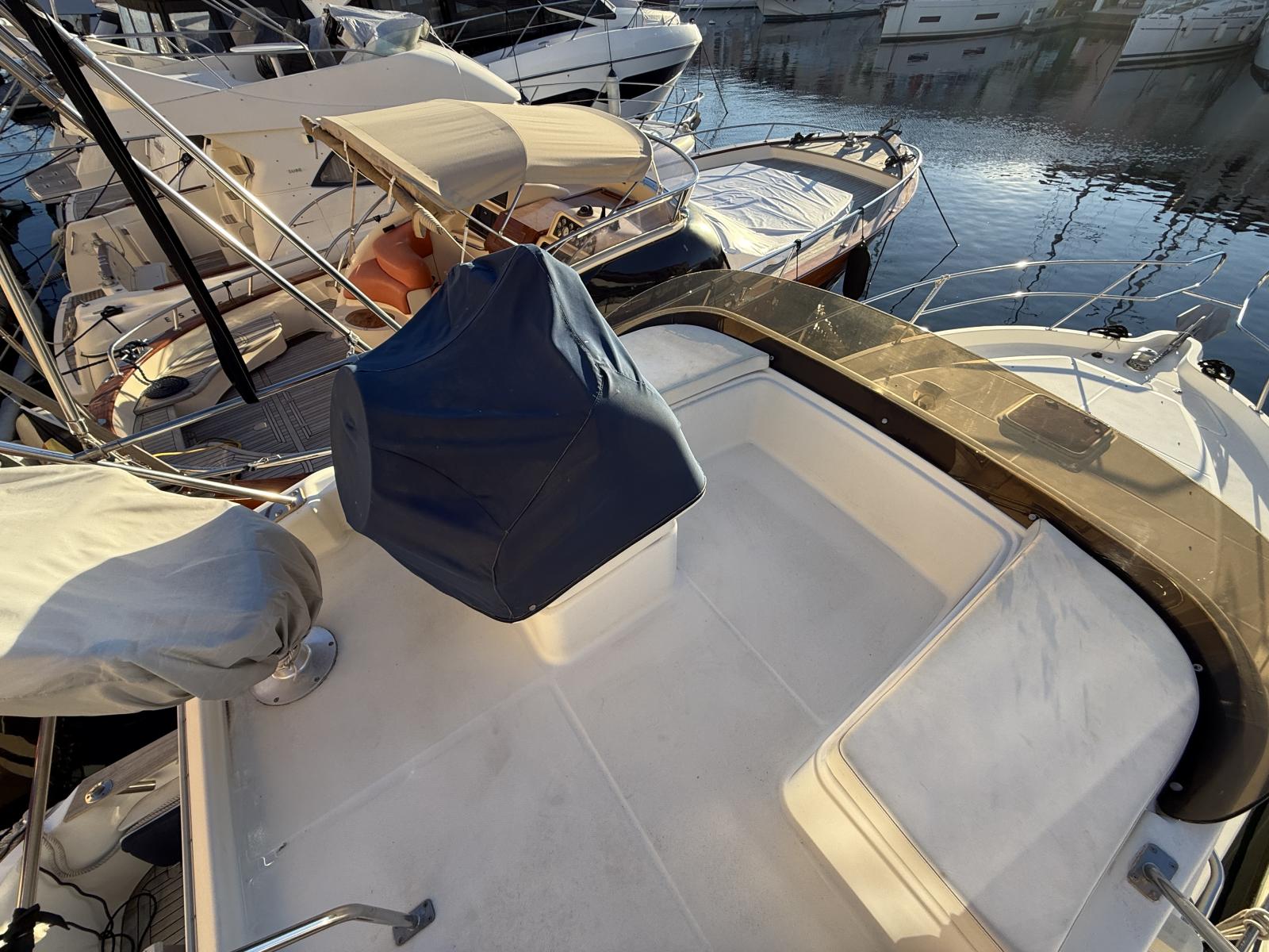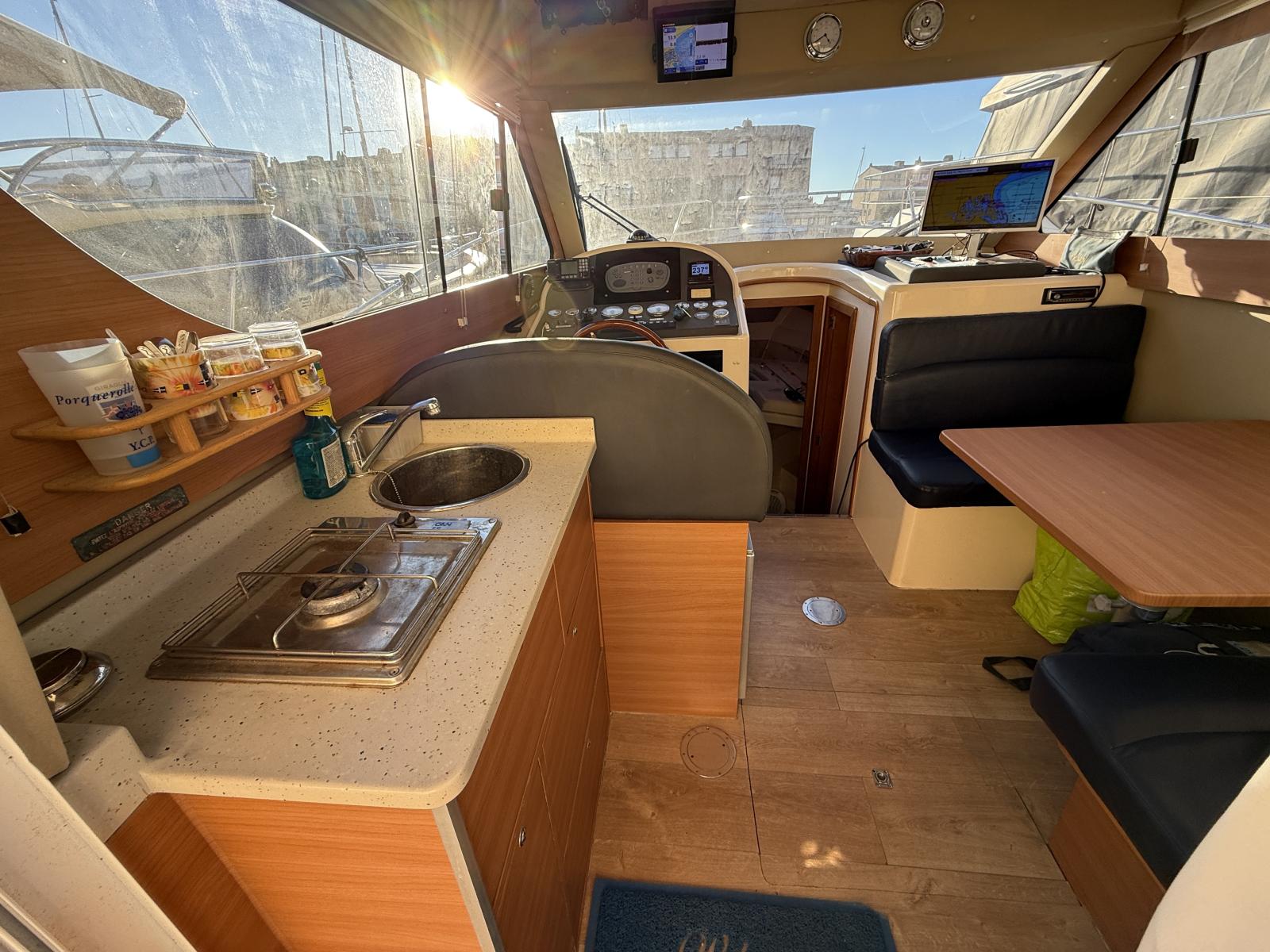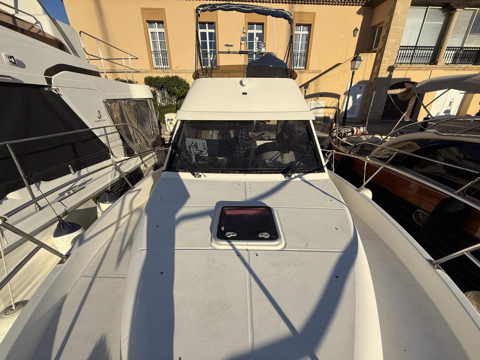 À bord, deux cabines, 1 salle d’eau, cuisine équipée et couchage supplémentaire offrent un confort rare sur un bateau de moins de 10 mètres. Le flybridge avec bimini, les coussins bain de soleil et l’électronique complète (Raymarine / Furuno / VHF 2022 / gestion batteries Victron) en font un bateau idéal pour la croisière, les week-ends en famille ou la pêche.