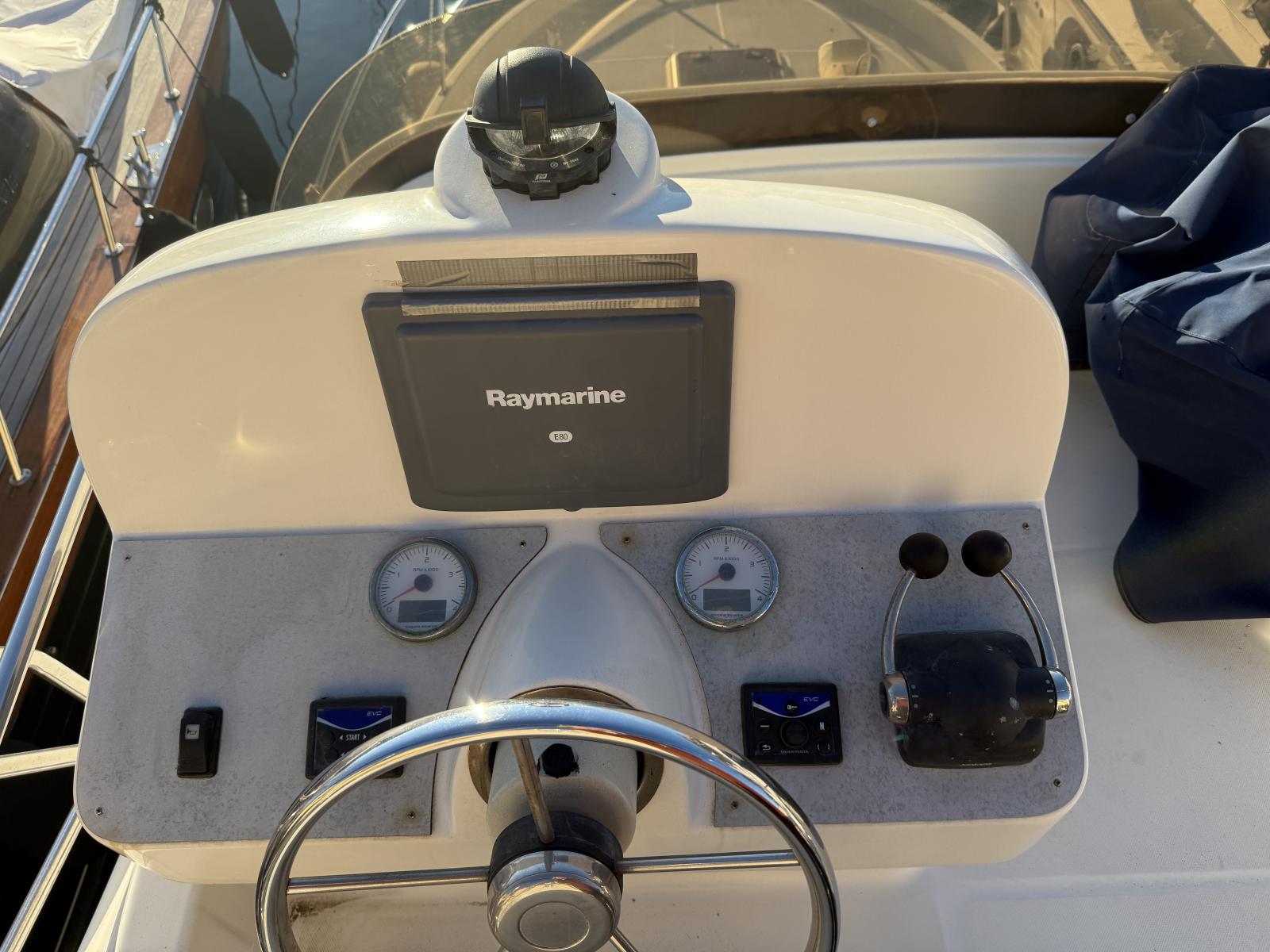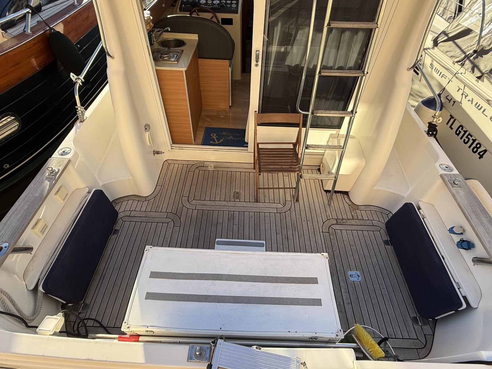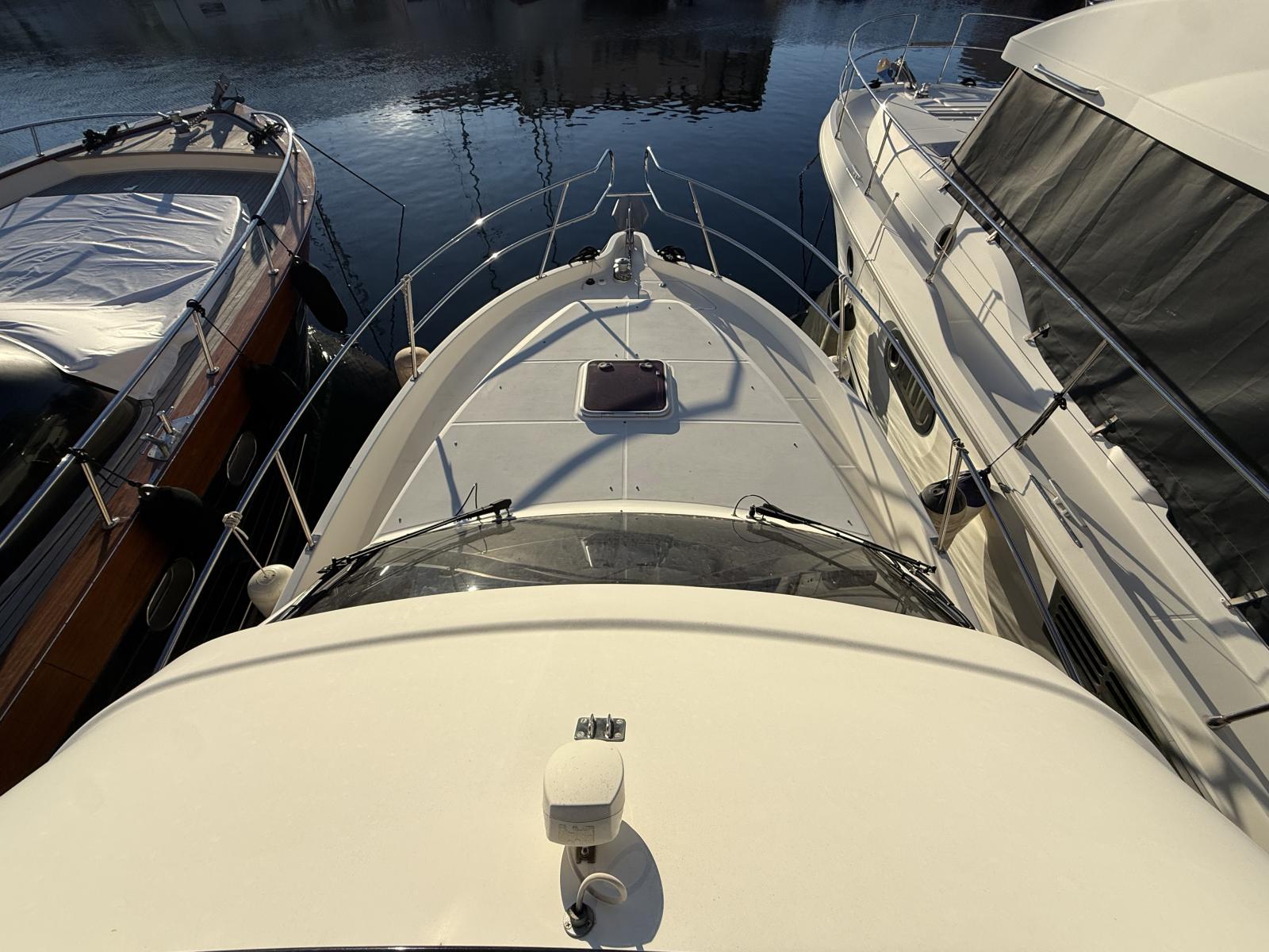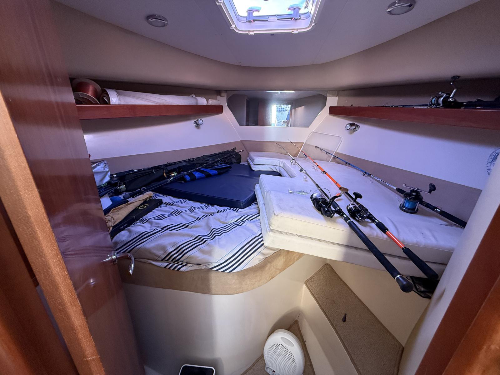 À bord, deux cabines, 1 salle d’eau, cuisine équipée et couchage supplémentaire offrent un confort rare sur un bateau de moins de 10 mètres. Le flybridge avec bimini, les coussins bain de soleil et l’électronique complète (Raymarine / Furuno / VHF 2022 / gestion batteries Victron) en font un bateau idéal pour la croisière, les week-ends en famille ou la pêche.