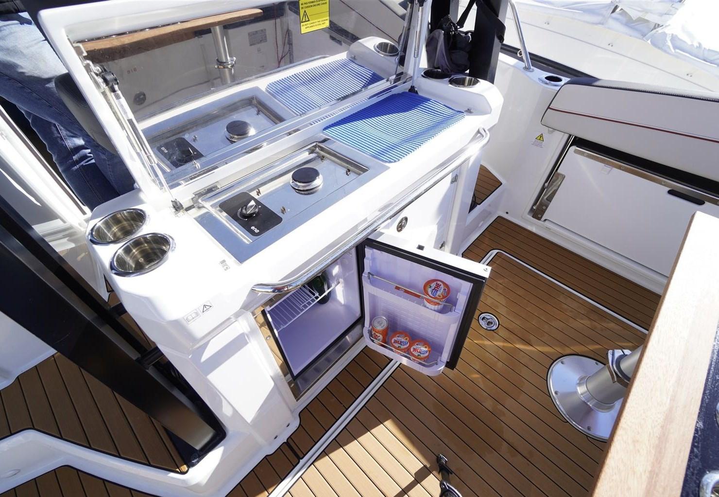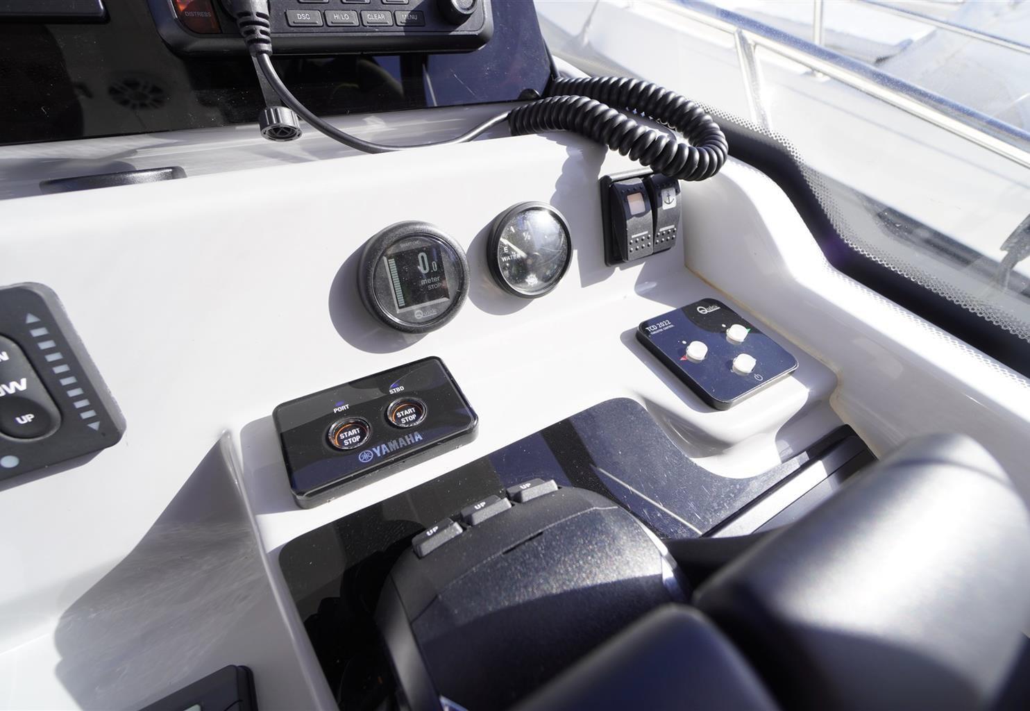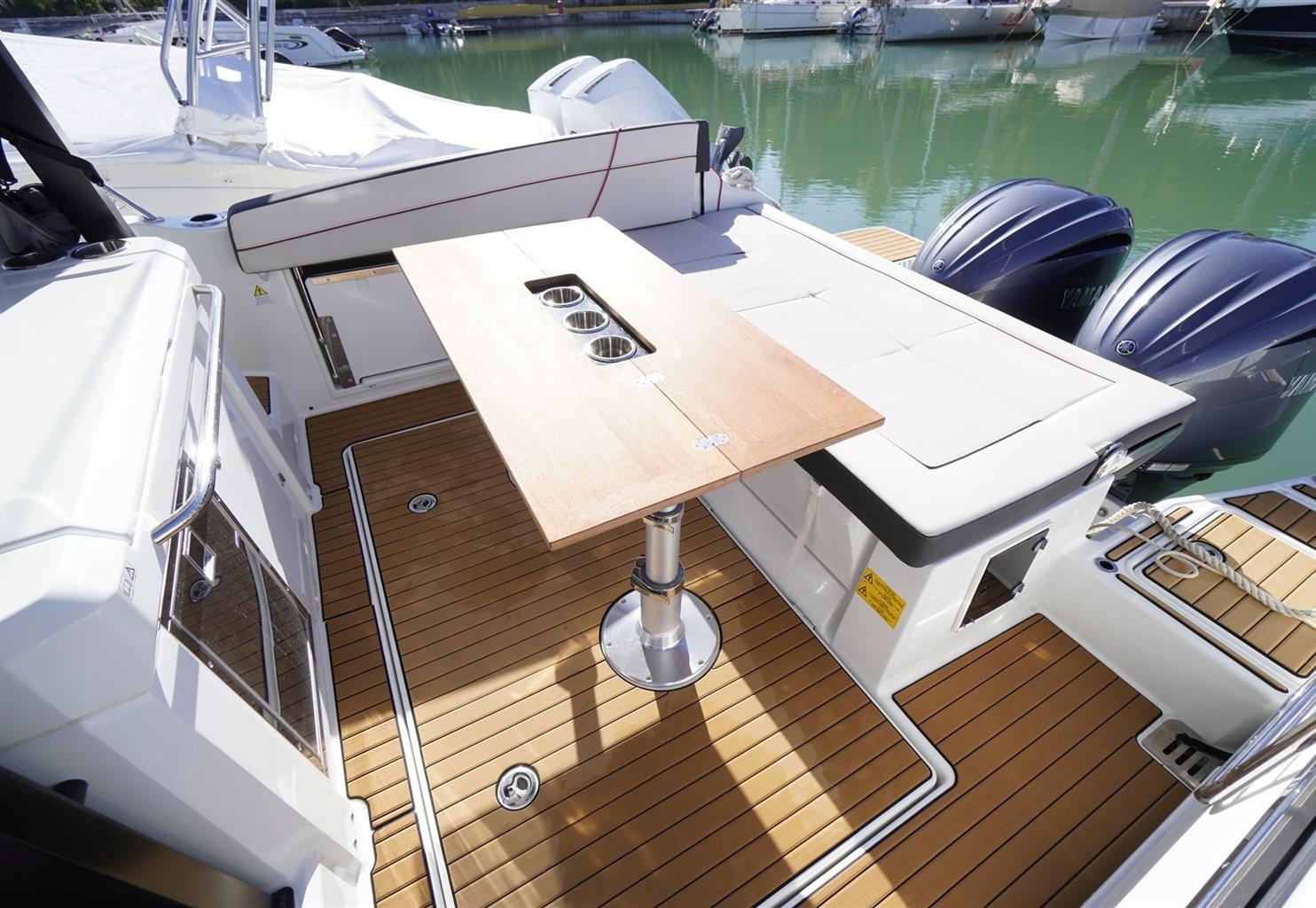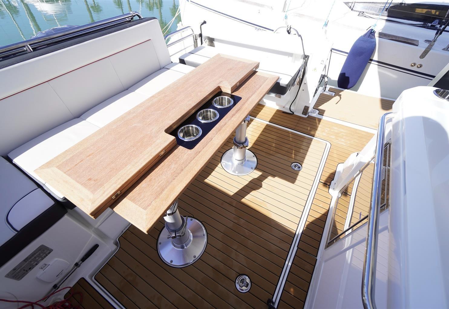 Alarme gaz, Alarme moteur, Alarme de pompe de cale, 5 Batteries (da 100a), Câble d’alimentation à quai, Douche de cockpit, Phare de poursuite, Flaps hydrauliques, Extincteur(s) fixe(s), Lavage de chaine, Spots sous-marins, Passerelle, Pompe de cale automatique, Pompe de cale manuelle, Cockpit en teck (Seyteak), Prise de quai, Connexion eau sous pression à quai, Guindeau électrique, Echelle de bain, table de cockpit, Table pliante de salon, Corne.