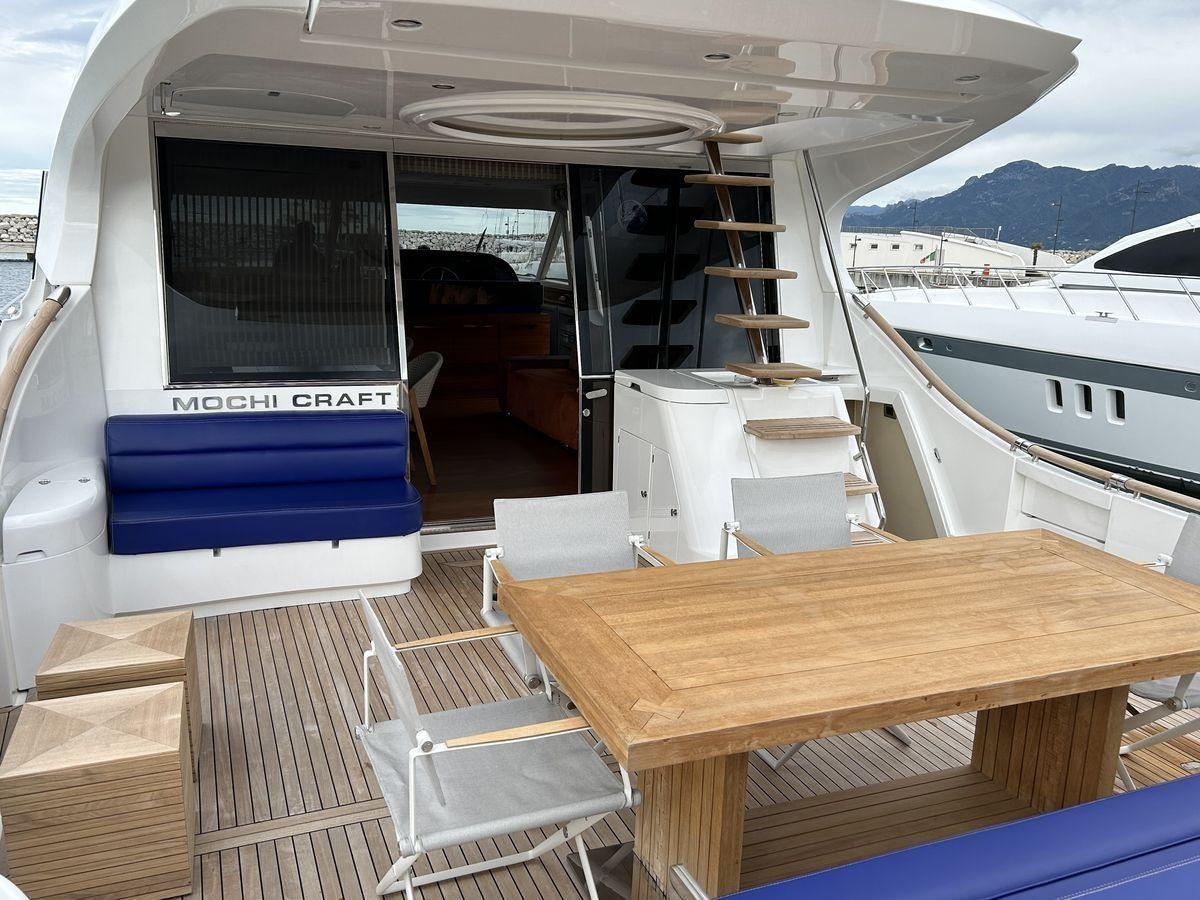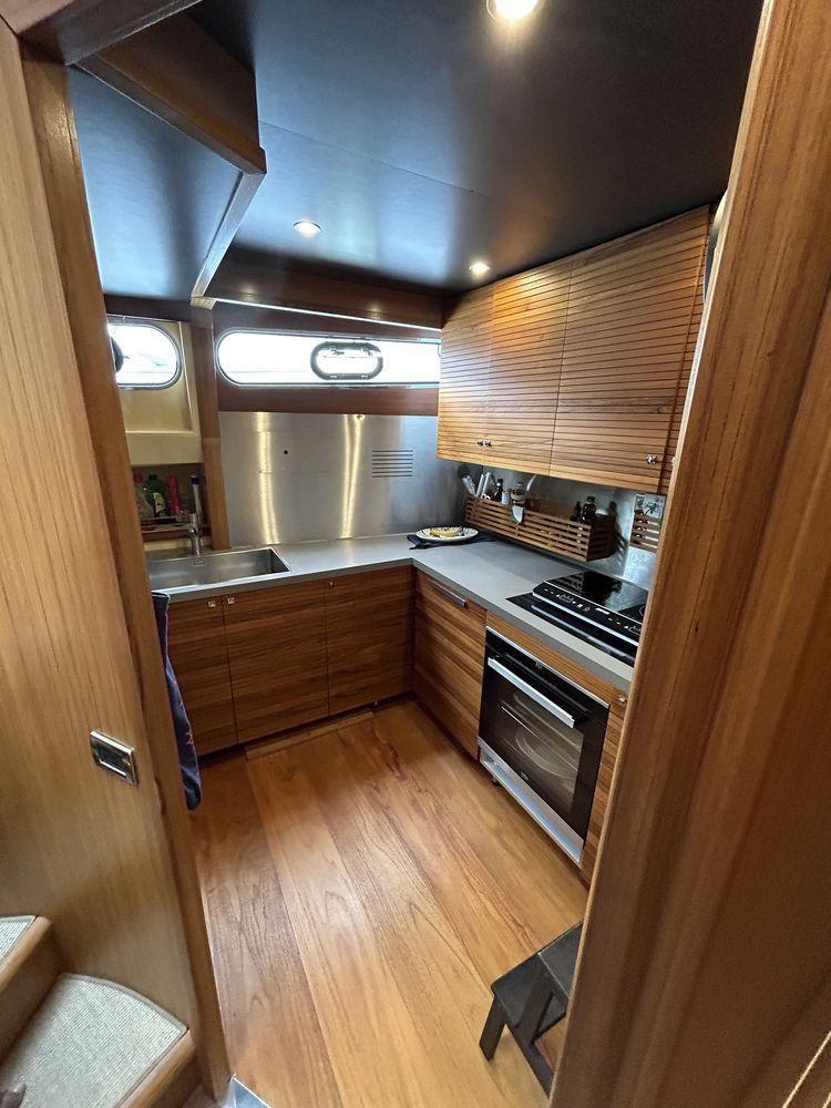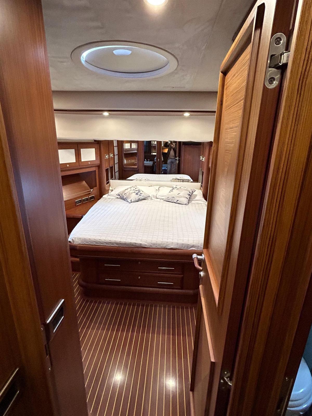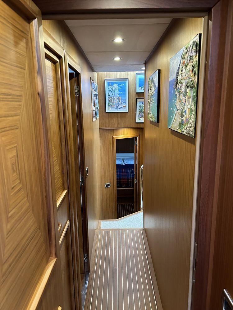 Disposition : 3 cabines 3 salles de bain + équipage : 1 cabine VIP à l’avant, 1 cabine à droite avec 2 lits au sol, 1 cabine de maître pleine poutre intermédiaire, 3 salles de bain, 1 cabine de marin à l’arrière avec un lit simple et salle de bain, 1 cabine de marin avec deux lits superposés avec salle de bain avant l’accès à la salle des machines. Couleur de la coque et superstructure blanc et intérieur en teck.