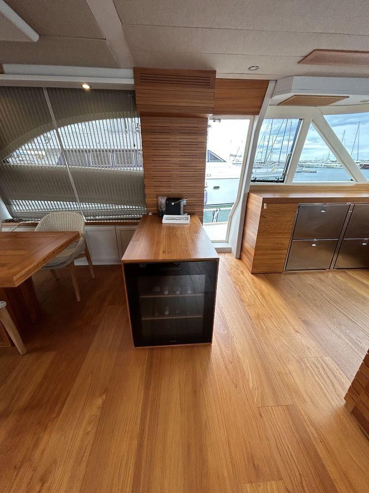 - Rembourrage de la salle à manger, table, chaises, canapé pont, sellerie de tableau de bord, cave à vin et parquet tout en teck