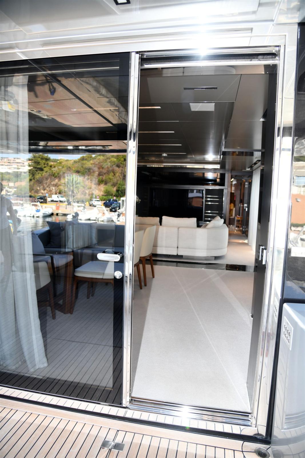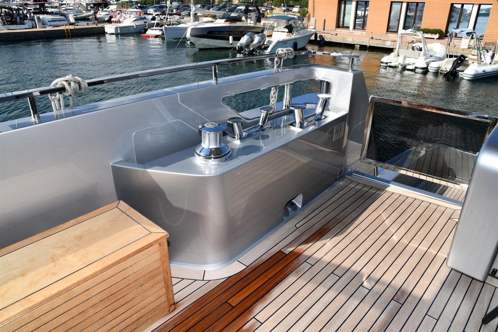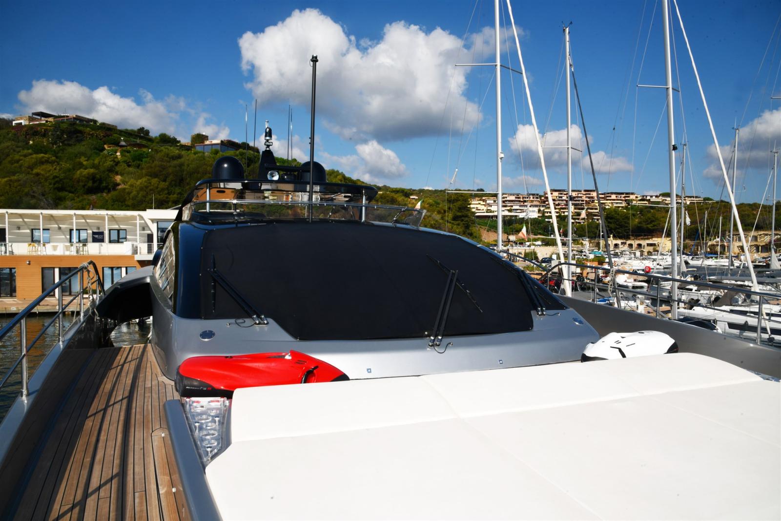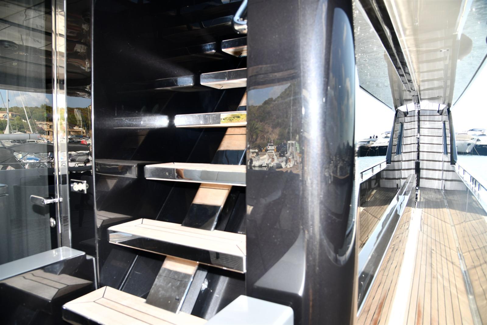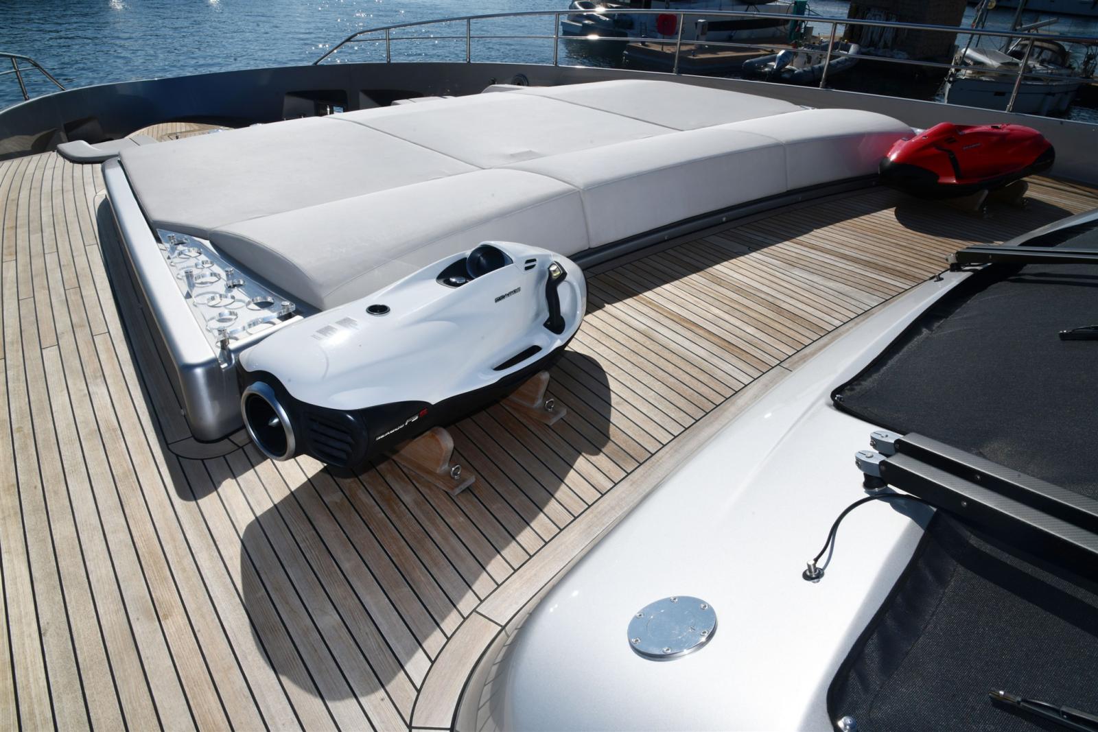 Alarme gaz, Alarme moteur, Alarme de pompe de cale, Alternateur, 2 Ancre (in acciaio da 105 KG piu 120 MT di catena), 2 Eau sous pression, Trim hydraulique, Batteries (2 gruppi da 24 dedicate ai gruppi motori e servizi), Taquets pliants (SOLO IN PEDANA), Système de vidange, Passavant en teck, 3 Chargeur de batterie (automatico dedicato alle batterie motori e uno dedicato ai servizi), Couleur spéciale (shark grey), Douche de cockpit, 2 Double barre à roue (piu terza a poppa), Propulseur de poupe (Idraulica), Propulseur d'étrave (Idraulica), Phares fixes arrière, Phare de poursuite, Garage à annexe, Extincteur(s) fixe(s), Indicateurs de flaps, Lavage de chaine, Éclairage de courtoisie, Spots sous-marins, Jet-ski, Passerelle (a scomparsa idraulica), Pompe de cale automatique, Pompe de cale manuelle, Pompe de Lavage du Pont, Porte latérale (Elettrica), Porte latérale (Elettrica), Cockpit en teck, Prise de quai, Connexion eau sous pression à quai, 3 Onduleur (2 PER SERVIZI 1 PER MOTORI), 2 Guindeau électrique, Echelle de bain (in carbonio), Selles pour Annexe (in garage), Système de filtration des eaux usées, Stabilisateurs (Pinne idrauliche e Seakeeper interno), table de cockpit (differente), Annexe (williams 445 diesel jet), Filières avec sortie latèrale, Corne.