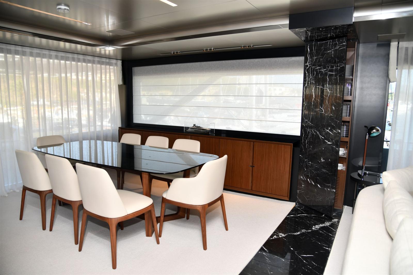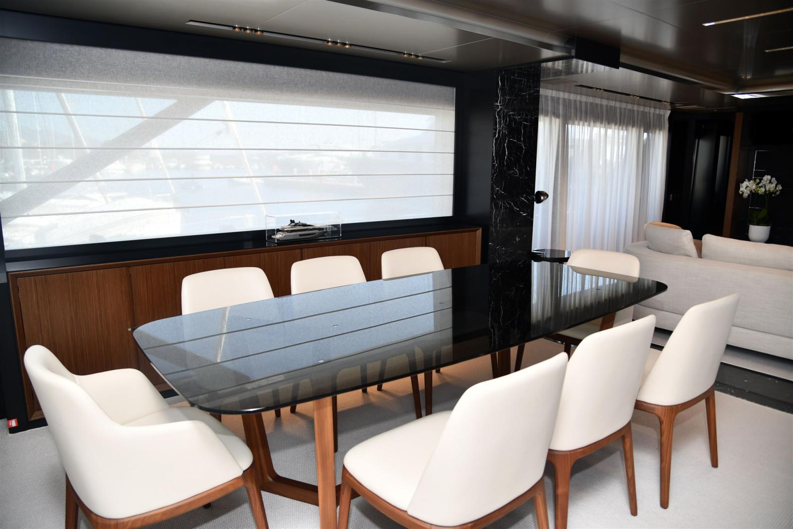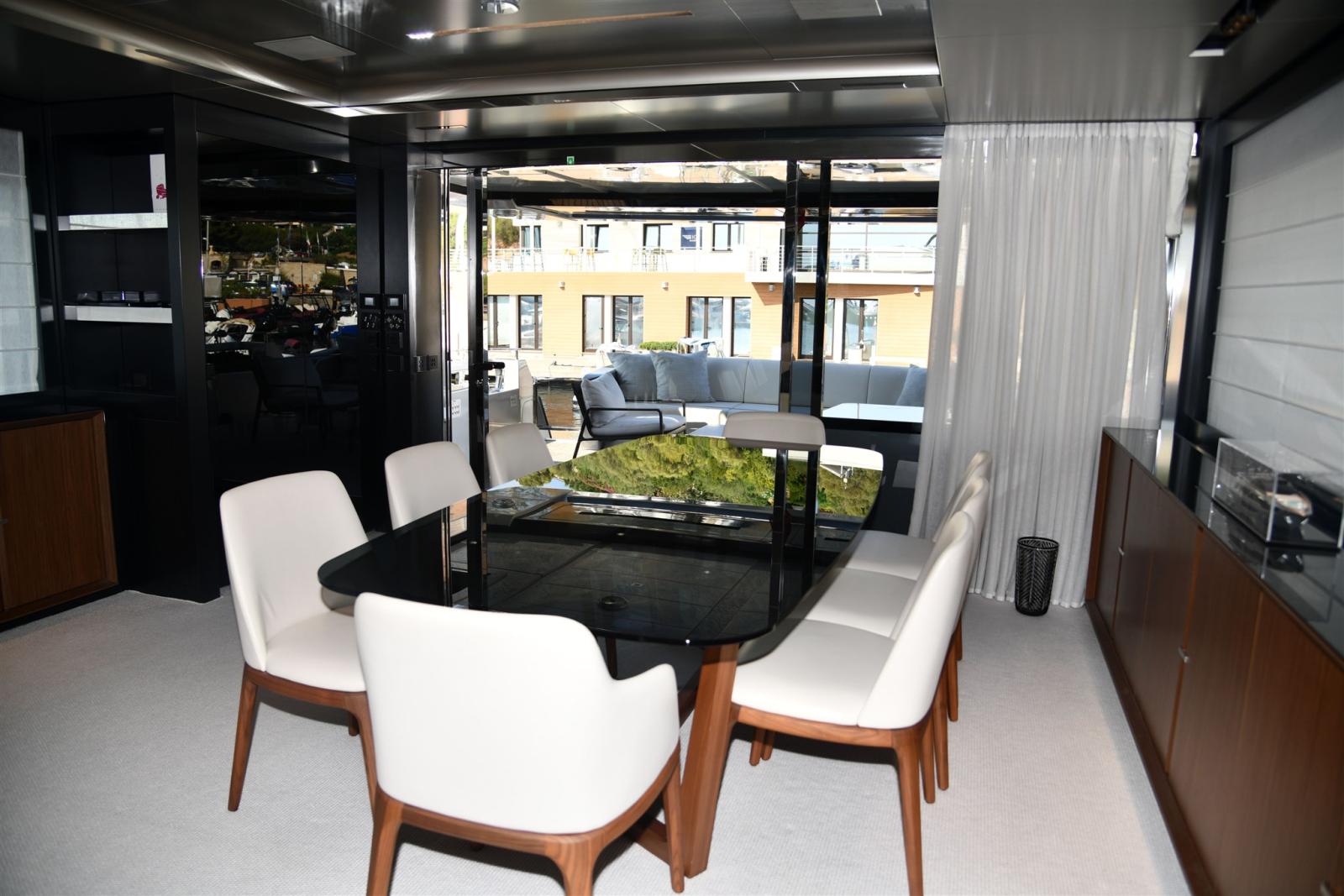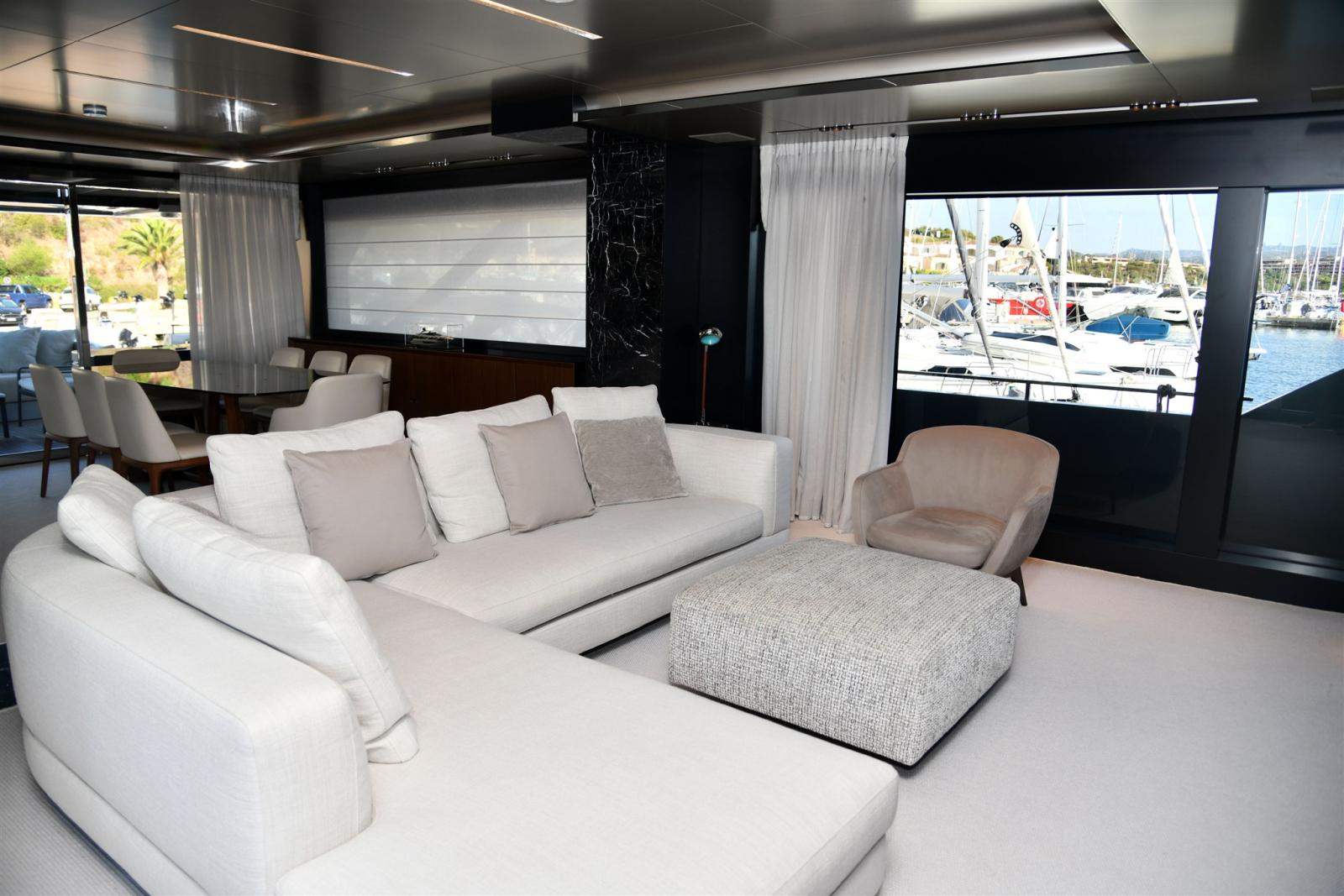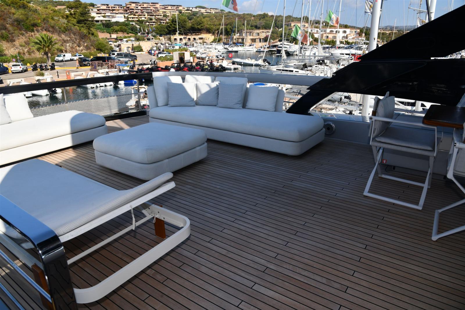 Alarme gaz, Alarme moteur, Alarme de pompe de cale, Alternateur, 2 Ancre (in acciaio da 105 KG piu 120 MT di catena), 2 Eau sous pression, Trim hydraulique, Batteries (2 gruppi da 24 dedicate ai gruppi motori e servizi), Taquets pliants (SOLO IN PEDANA), Système de vidange, Passavant en teck, 3 Chargeur de batterie (automatico dedicato alle batterie motori e uno dedicato ai servizi), Couleur spéciale (shark grey), Douche de cockpit, 2 Double barre à roue (piu terza a poppa), Propulseur de poupe (Idraulica), Propulseur d'étrave (Idraulica), Phares fixes arrière, Phare de poursuite, Garage à annexe, Extincteur(s) fixe(s), Indicateurs de flaps, Lavage de chaine, Éclairage de courtoisie, Spots sous-marins, Jet-ski, Passerelle (a scomparsa idraulica), Pompe de cale automatique, Pompe de cale manuelle, Pompe de Lavage du Pont, Porte latérale (Elettrica), Porte latérale (Elettrica), Cockpit en teck, Prise de quai, Connexion eau sous pression à quai, 3 Onduleur (2 PER SERVIZI 1 PER MOTORI), 2 Guindeau électrique, Echelle de bain (in carbonio), Selles pour Annexe (in garage), Système de filtration des eaux usées, Stabilisateurs (Pinne idrauliche e Seakeeper interno), table de cockpit (differente), Annexe (williams 445 diesel jet), Filières avec sortie latèrale, Corne.
