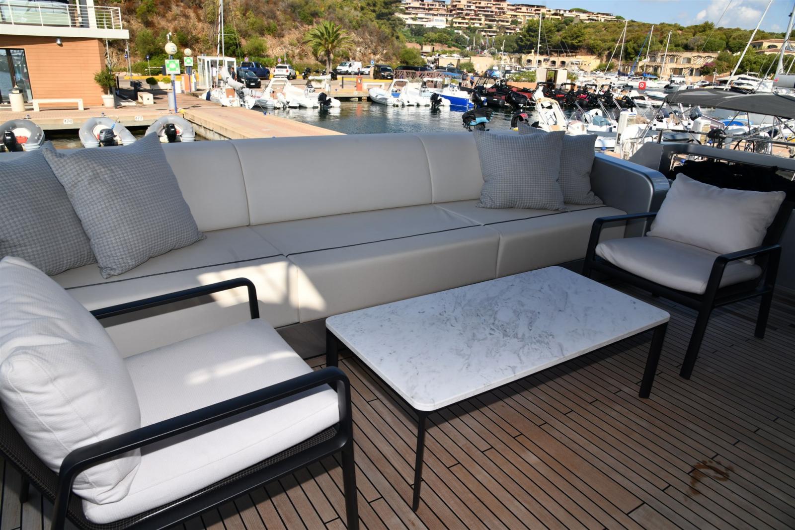 Bimini (PRUA CON 4 PALI IN CARBONIO), Sellerie complète, Coussins arrieres, Coussin avant, Sellerie de fly, sellerie de cockpit, Rideaux occultants, Tauds de pare-brise, Taud de siège, Taud électrique (interna), Taud de soleil.